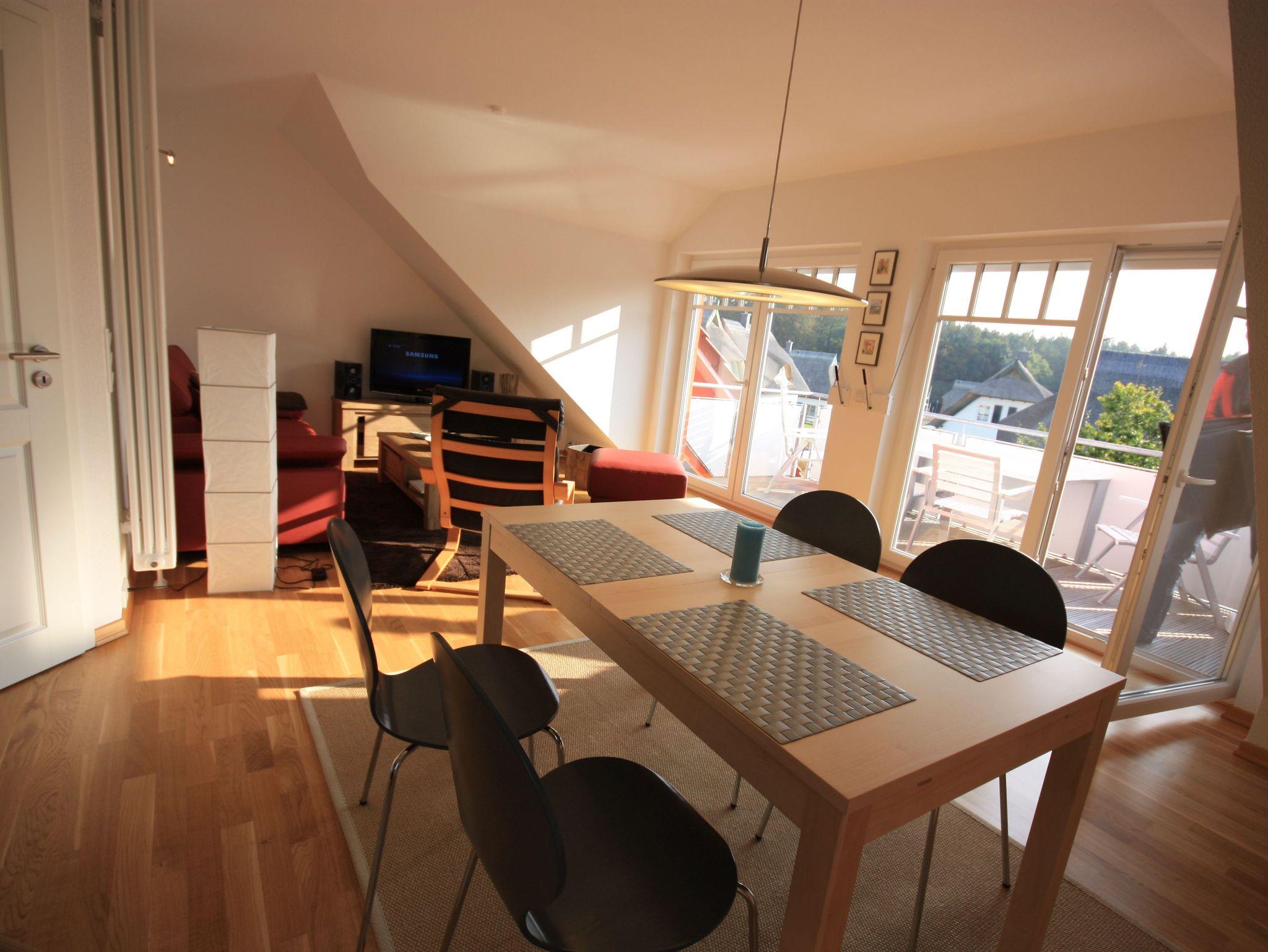 Komfortable Dachgeschosswohnung im Ferienpark Streckelsberg, nur 10 Minuten vom Ostseestrand entfernt, mit Südbalkon und Blick auf den Küstenwald.