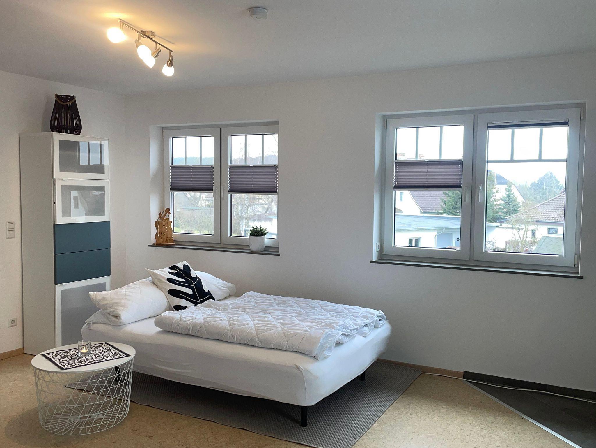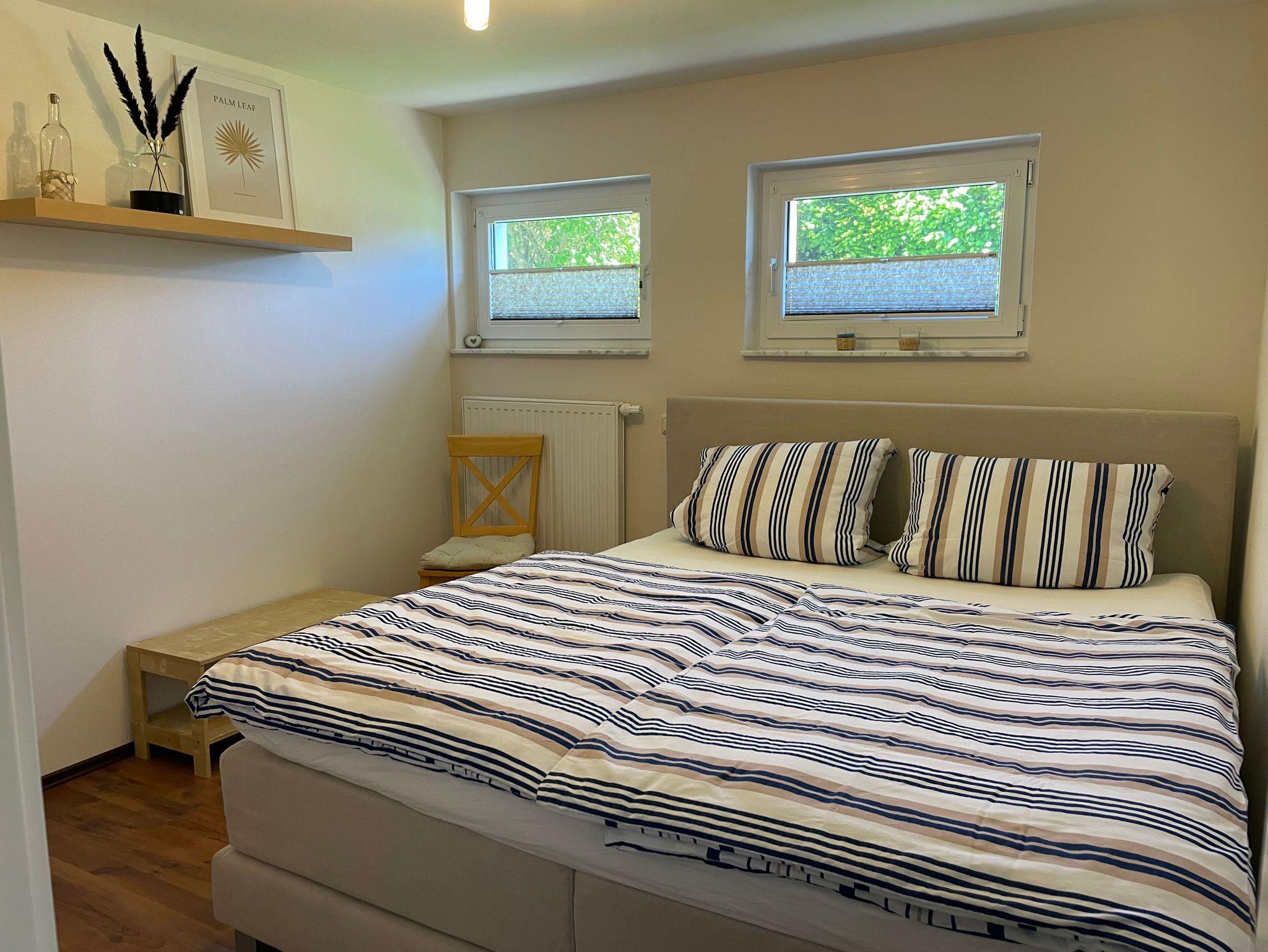 Die helle, mit Liebe zum Detail eingerichtete und mit separatem Eingang ausgestattete 2-Zimmer-Ferienwohnung ist ca. 50m² groß. Die Wohnung hat zwei separate Schlafzimmer und bietet Platz für 3 Personen. Im Souterrain-Bereich gelangen Sie direkt in die gemütliche Wohnküche mit Essecke. Über einen Flur mit Garderobe sind die beiden Schlafzimmer und das große Badezimmer zu erreichen. Eines der beiden Schlafzimmer verfügt über ein Doppelbett (1,80 x 2,00m) das andere Schlafzimmer über ein Etagenbett. Das Etagenbett hat unten eine Schlaffläche von 1,40 x 2,00m und oben 0,90 x 2,00m.