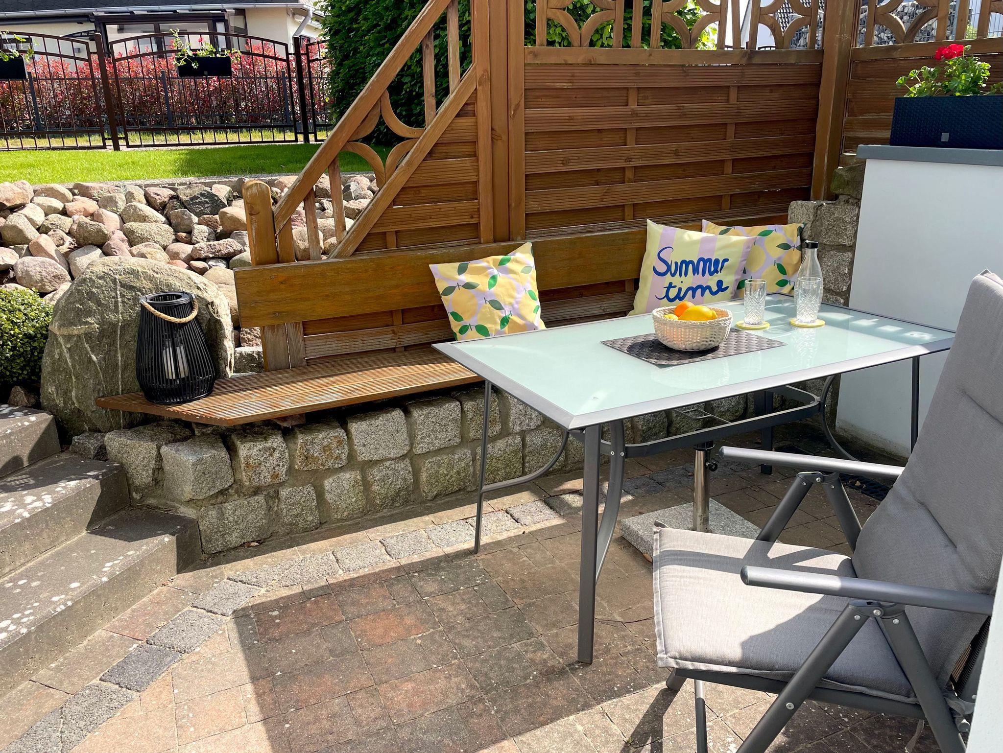 Zu der Ferienwohnung gehört eine Terrasse mit Gartenmöbeln, ein Grill und ein separates Fahrradhäuschen. Hier können Sie gern Ihre Fahrräder und Badeutensilien unterstellen. Eine kleine Grünfläche vor der Ferienwohnung lädt zum Spielen der Kinder ein.