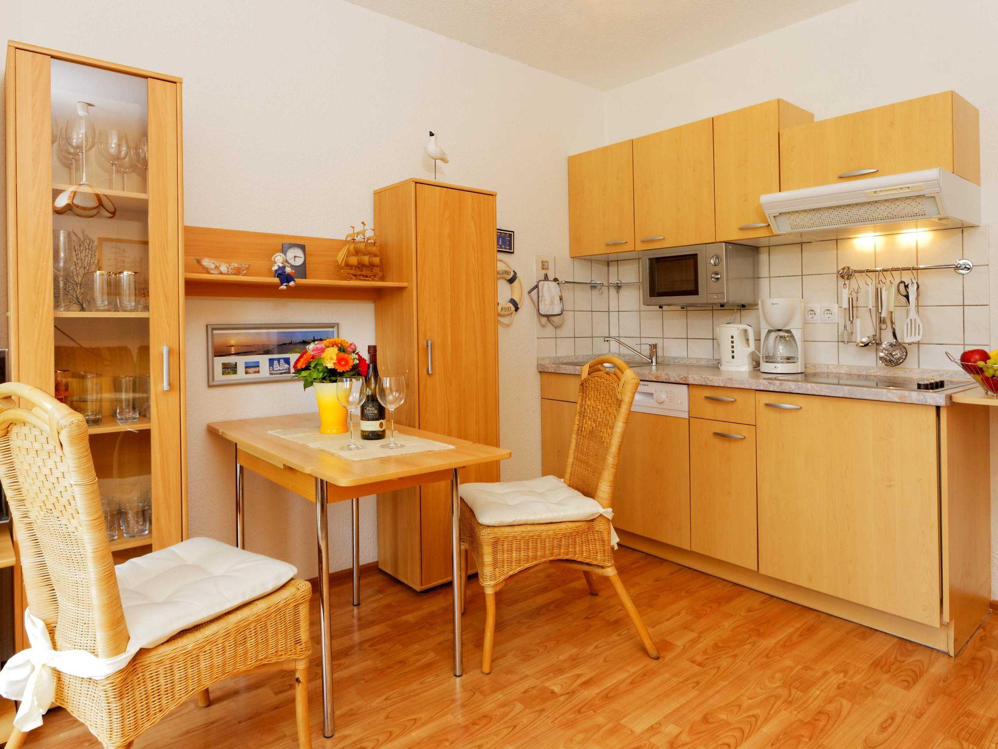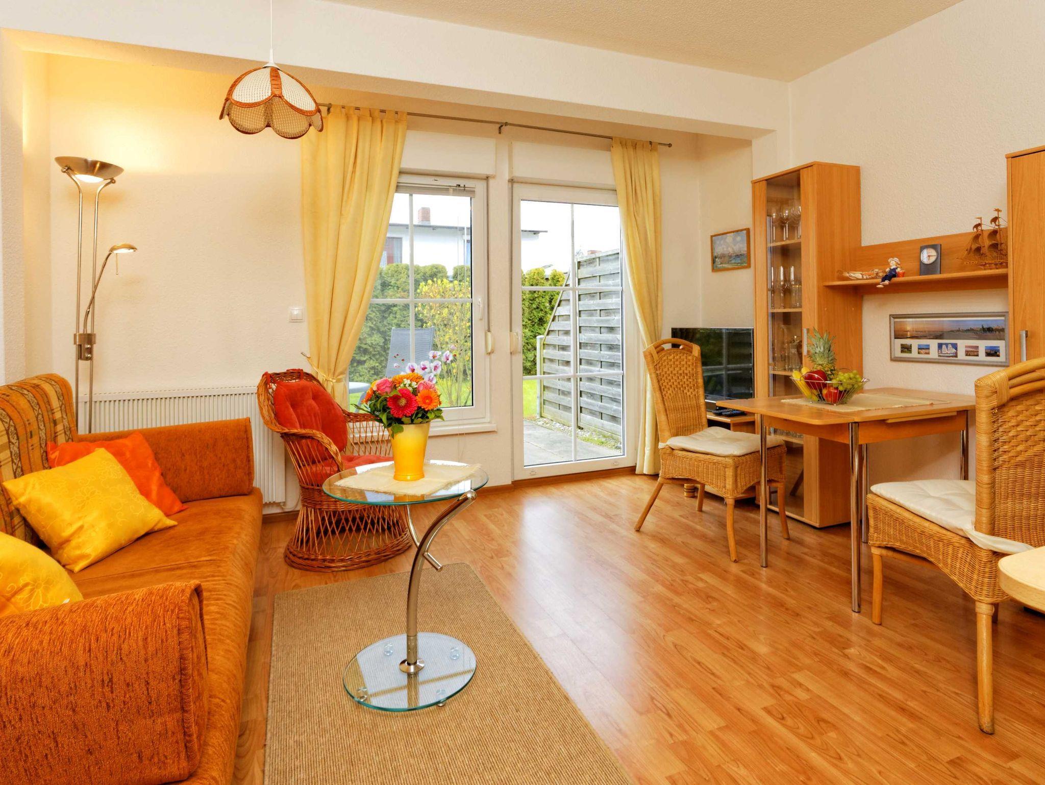 2-Zimmer Ferienwohnung im Erdgeschoss einer liebevoll angelegten Ferienanlage. Die Ferienwohnung ist im Wohnbereich ausgestattet mit einer gemütlichen Schlafcouch und einer offenen Küche mit Essbereich.
