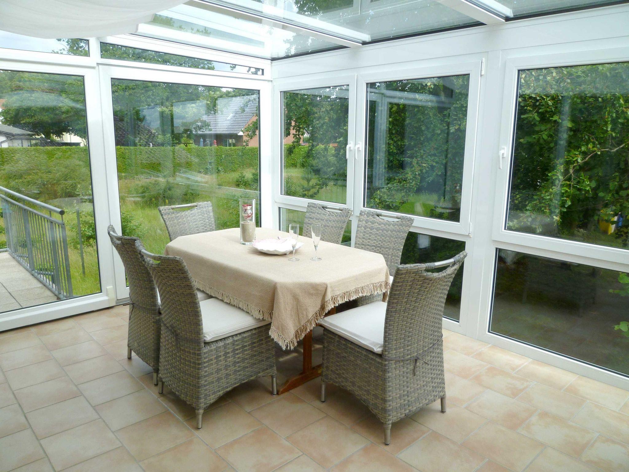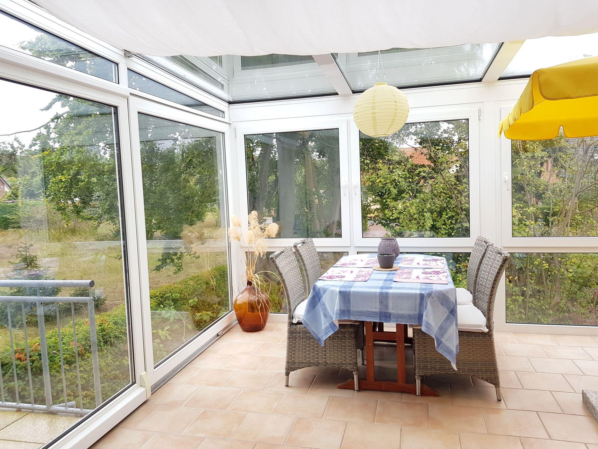 Der großzügige Wintergarten (20 m²) verfügt über zwei Schiebetüren zu den angrenzenden großen Balkonen inmitten wunderschöner Natur, bequeme Liegen laden zum Relaxen ein. Im Wintergarten kann man zu jeder Jahreszeit und bei jedem Wetter wunderbar relaxen. Vor allem im Frühjahr und im Herbst ist es hier besonders gemütlich. Schlafzimmer (massive Pinie) mit Doppelbett und zusätzlichem Einzelbett (1 Aufbettung auf Anfrage), Kinderzimmer mit hochwertigem Doppelbett (motorische Rahmenverstellung und Matratze mit mehreren Liegezonen) - Weitblick in den Garten aus 2 großen Fenstertüren. Großes Wohnzimmer mit komfortabler Ledergarnitur mit Funktionen und Essbereich, ein elektrisches Kaminfeuer mit tollem Flammeneffekt sorgt für Gemütlichkeit. Ein großer 55'' Fernseher mit Ambilight LED-Hintergrundbeleuchtung und Smart-TV Funktion steht zur Verfügung. Separate massive Küche aus Buche mit Ceran-Kochfeld, Spülmaschine und Mikrowelle, direkter Ausgang zum Wintergarten und Wohnzimmer, Bad in maritimem Design mit Runddusche, sehr ruhige Lage, nur 3 Gehminuten zum Strand.