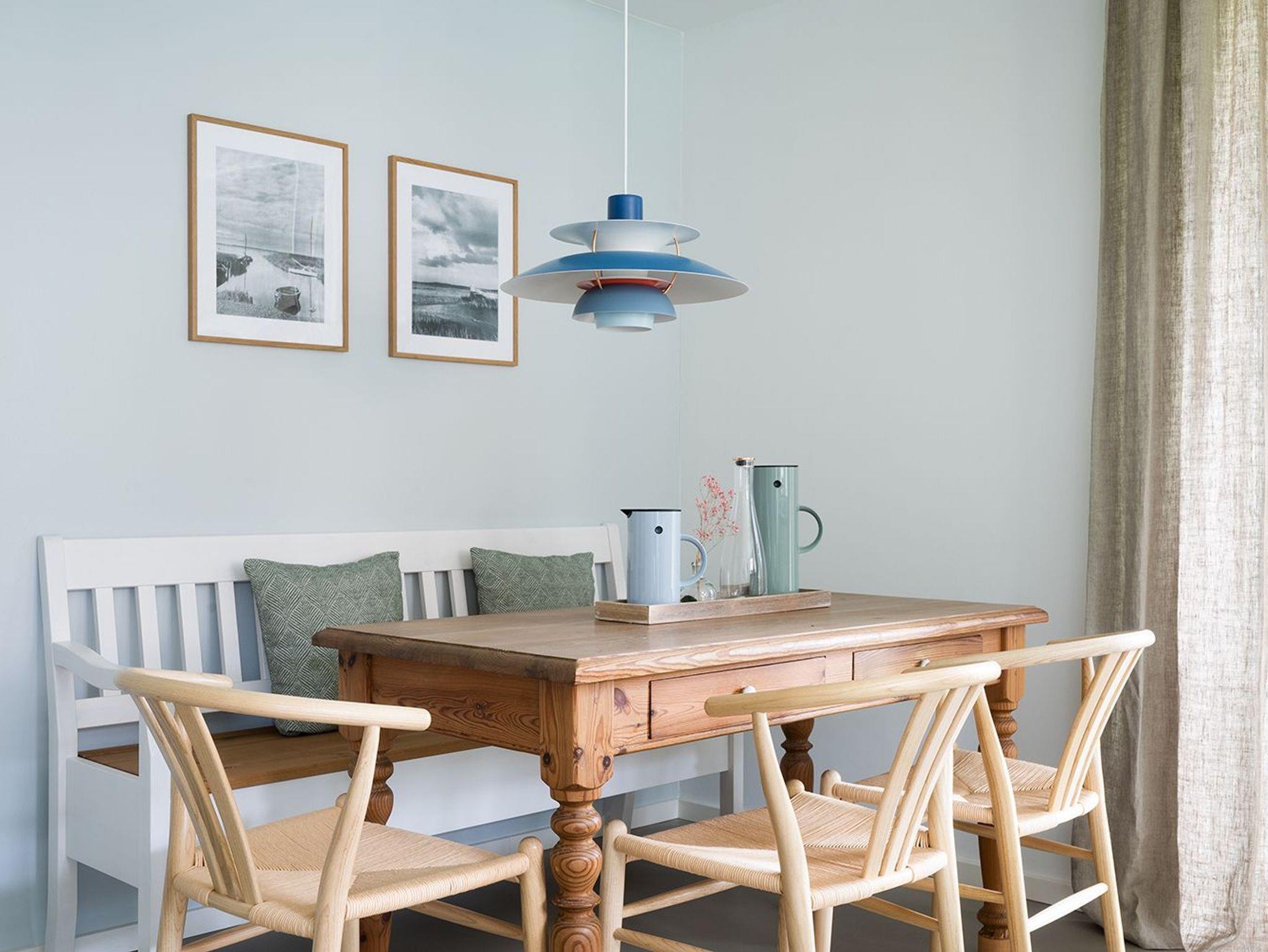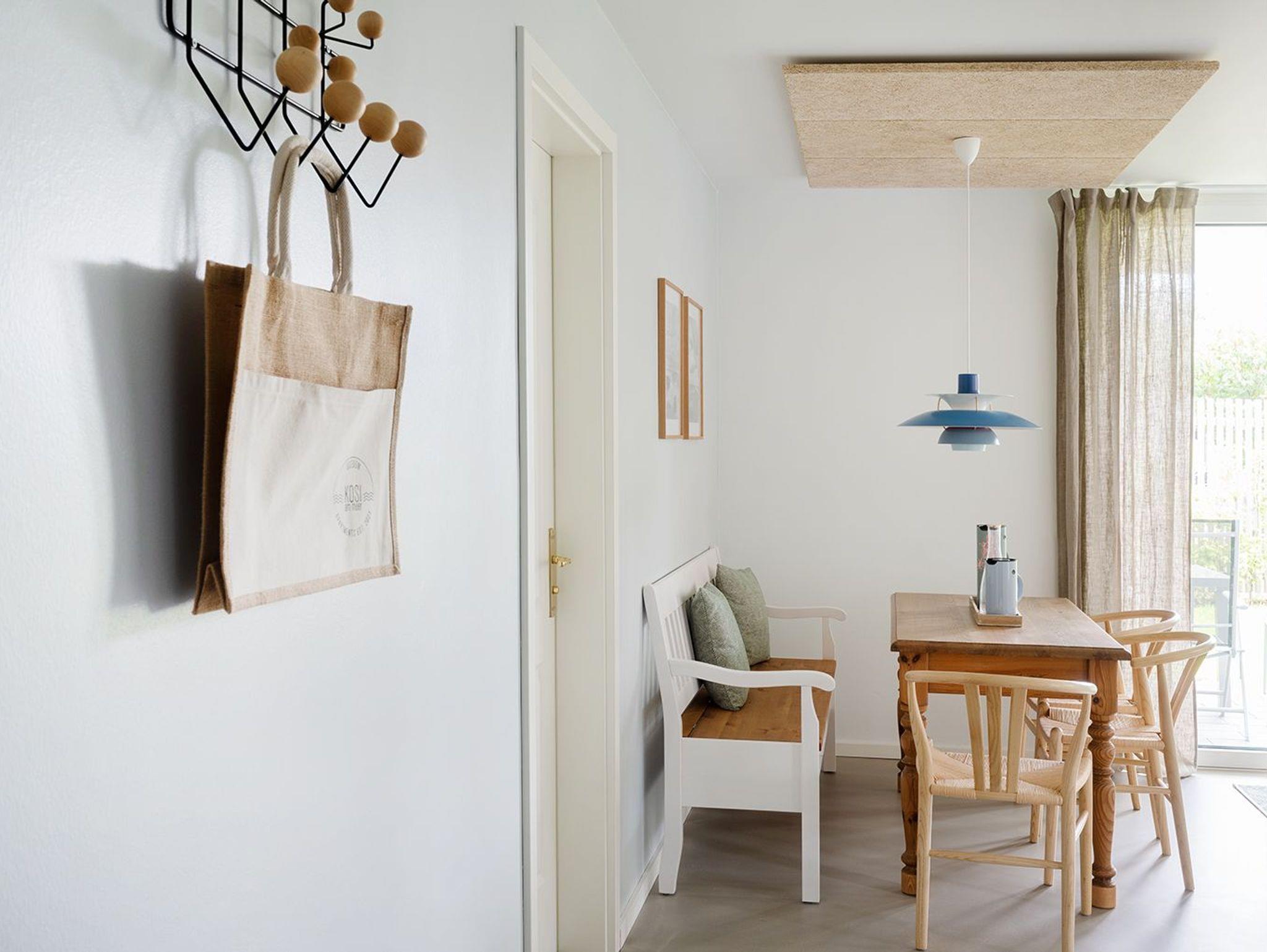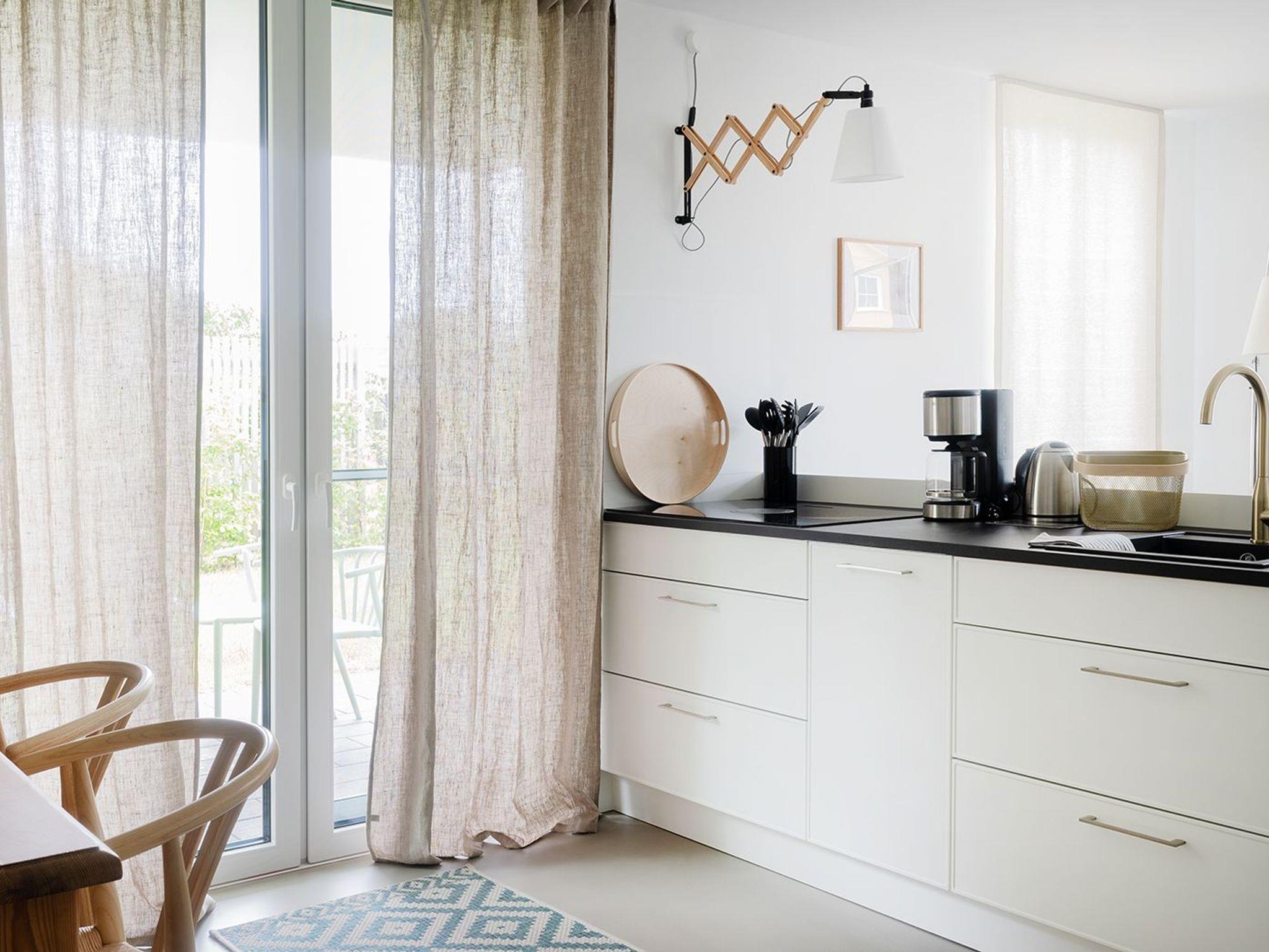 Bodentiefe Fenster ermöglichen einen direkten Zugang zur Terrasse, welche mit Gartenmöbeln ausgestattet ist. Ausgewählte Möbel und schlichte Oberflächen schaffen Gemütlichkeit und ein ruhiges Raumgefühl.
