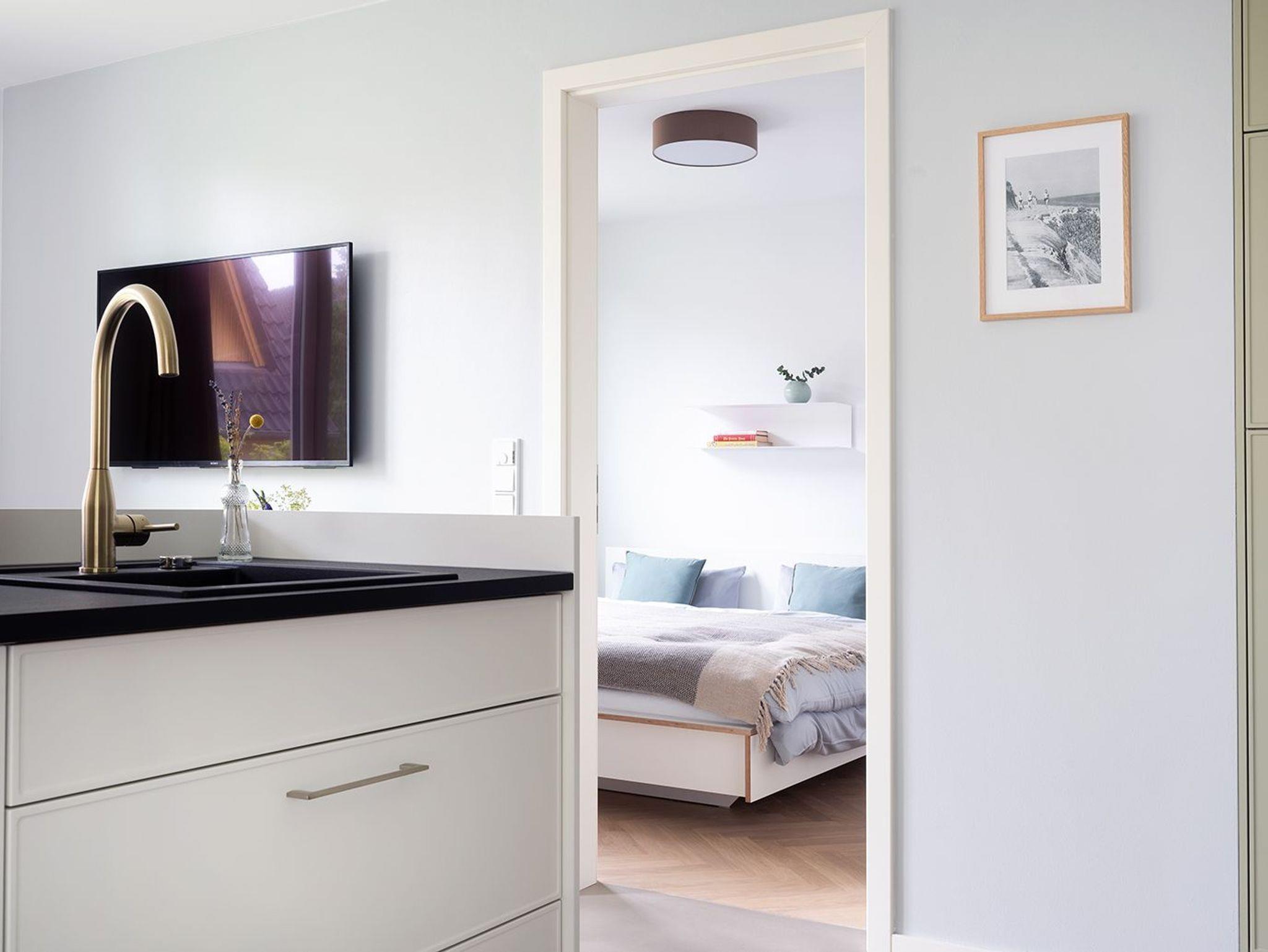 Mit einer Fläche von 45 m² bietet das großzügige 2-Zimmerapartment Aufenthaltsmöglichkeiten für 1-2 Personen. Eine offene, vollausgestattete Küche schafft hohe Transparenz zum lichtdurchfluteten Wohnraum und lädt zu gemeinsamer Wohlfühlzeit ein. Die Einrichtung der Wohnung fokussiert sich auf ein modernes, gleichzeitig gemütliches Interieur.