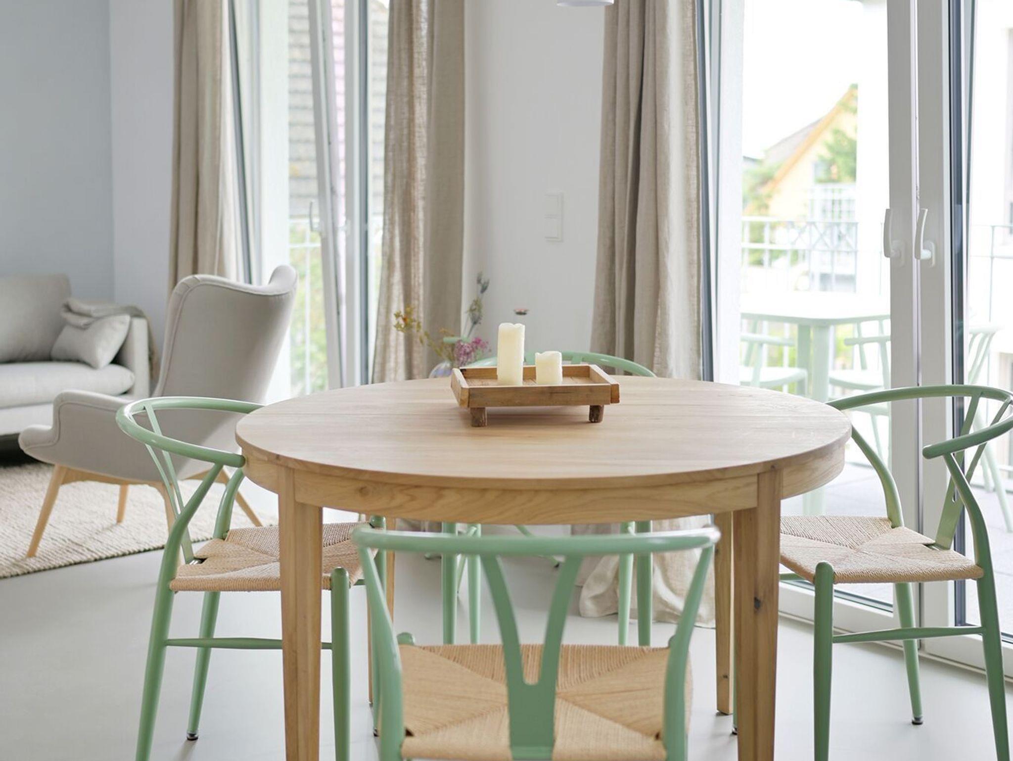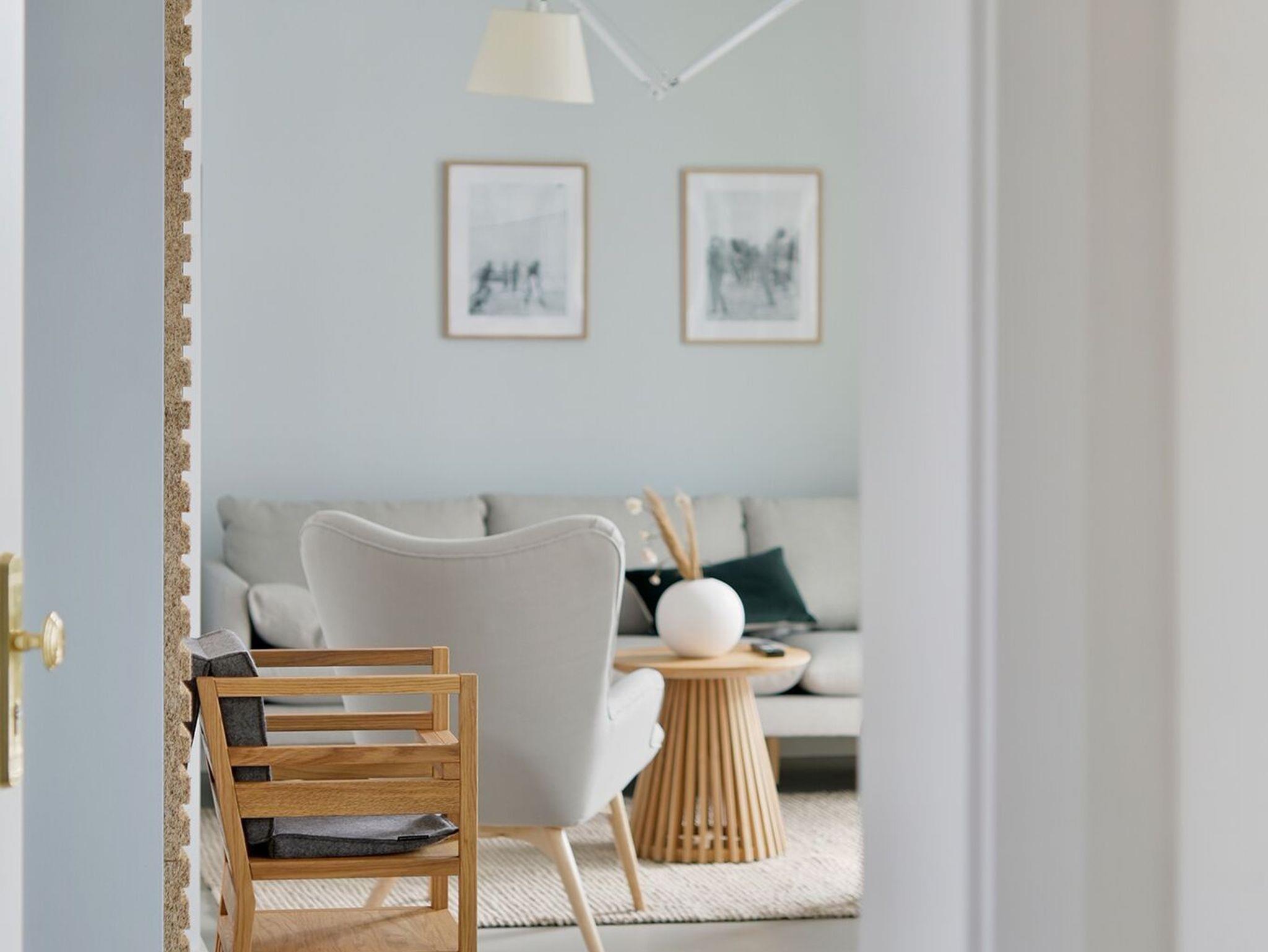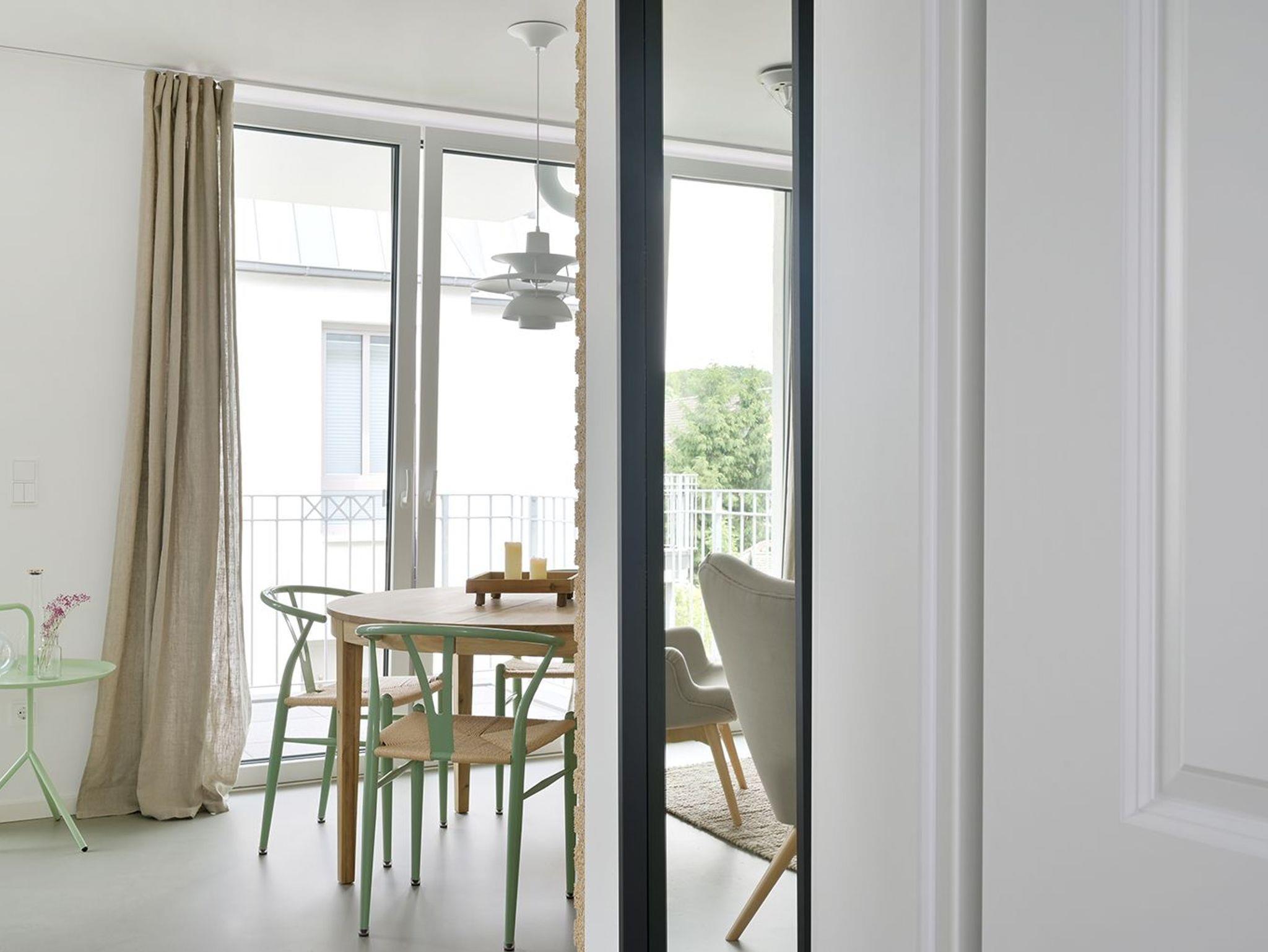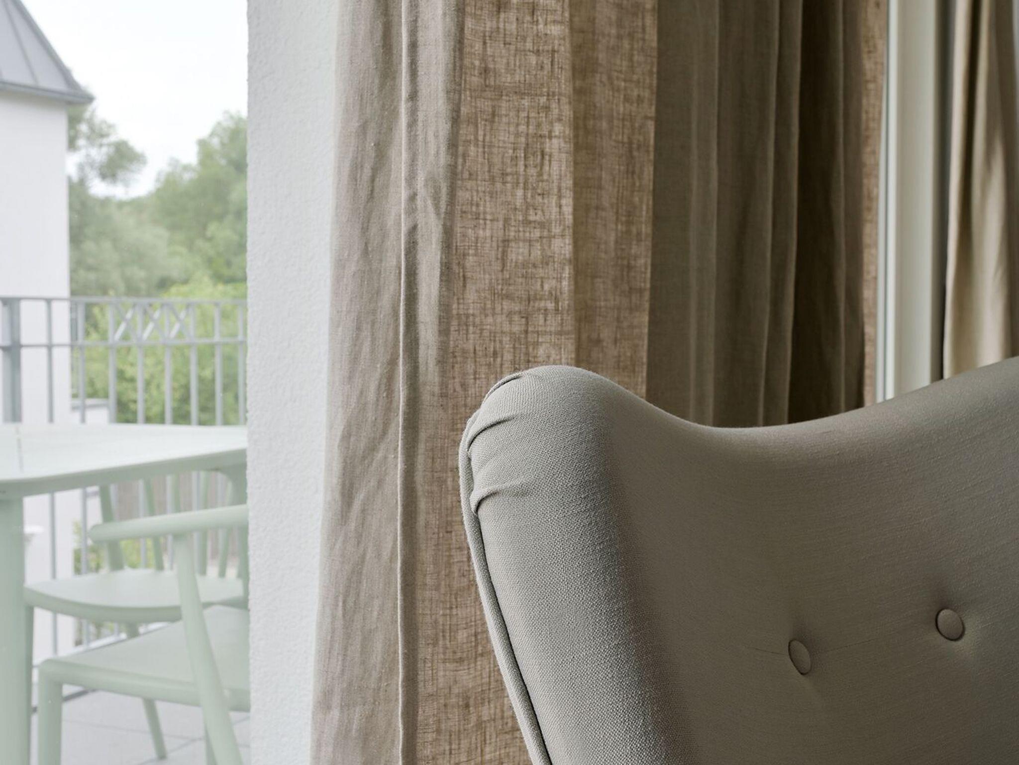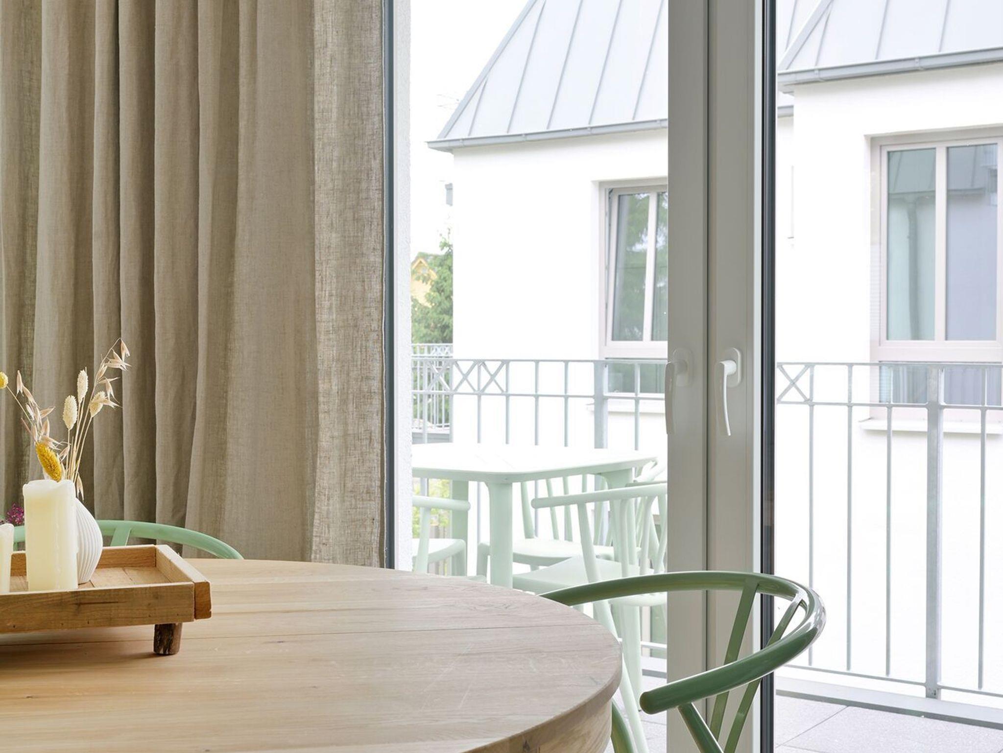 Bodentiefe Fenster ermöglichen einen direkten Zugang zum Balkon, welcher mit Gartenmöbeln ausgestattet ist. Ausgewählte Möbel und hochwertige Böden, schaffen Gemütlichkeit und ein ruhiges Raumgefühl.