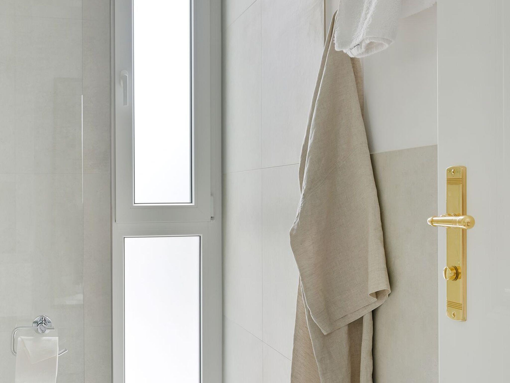 Das Badezimmer ist mit einer bodengleichen Dusche mit Regendusche ausgestattet.
