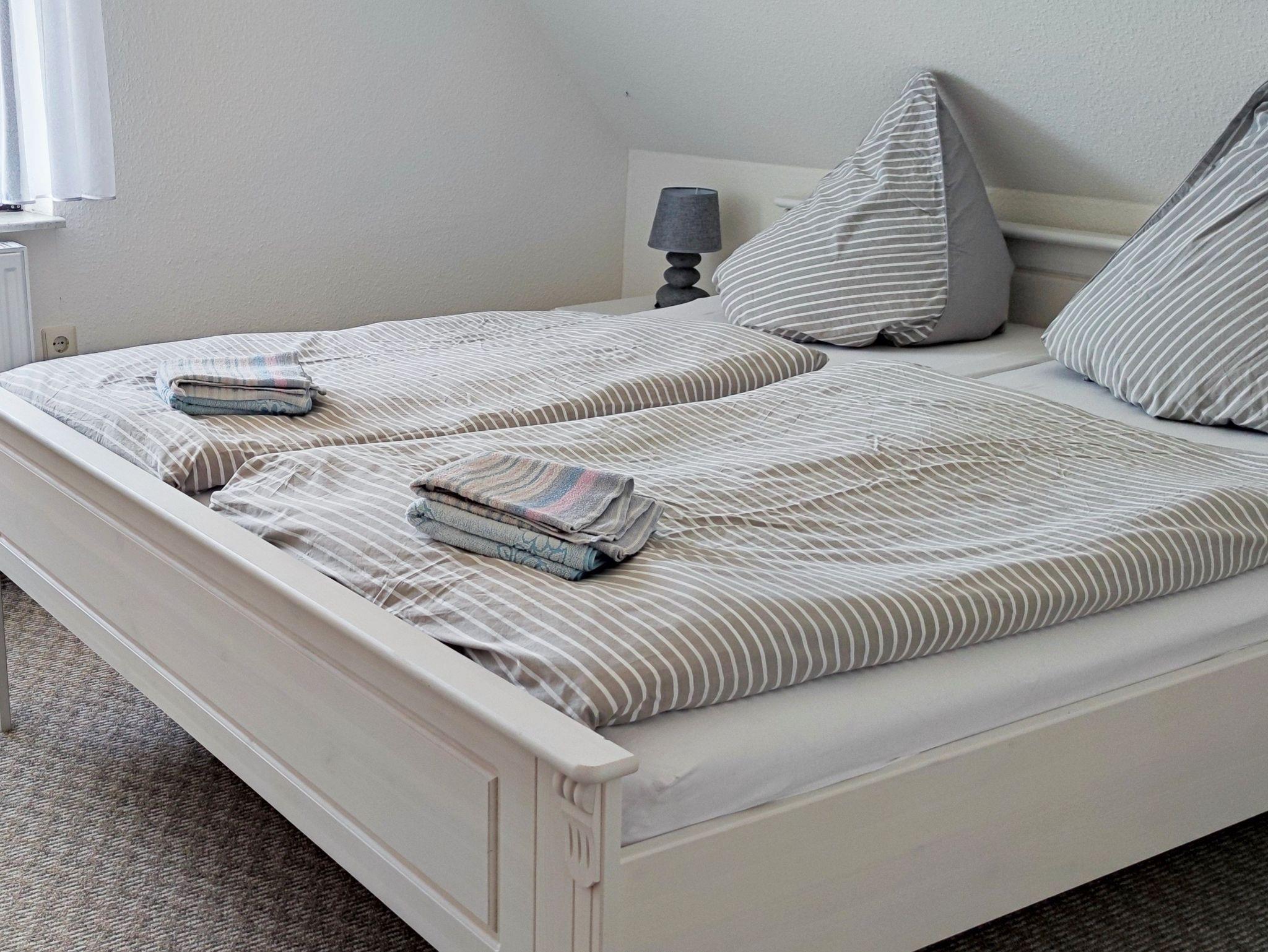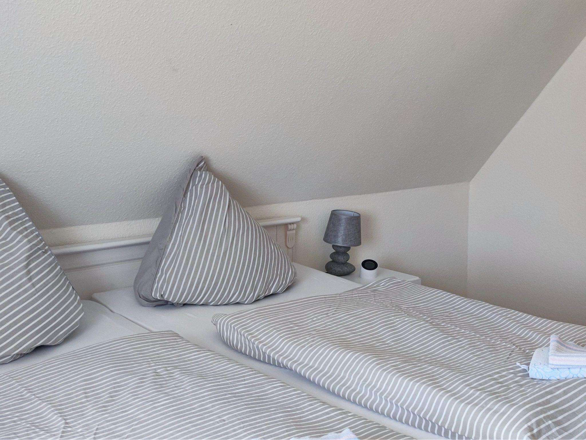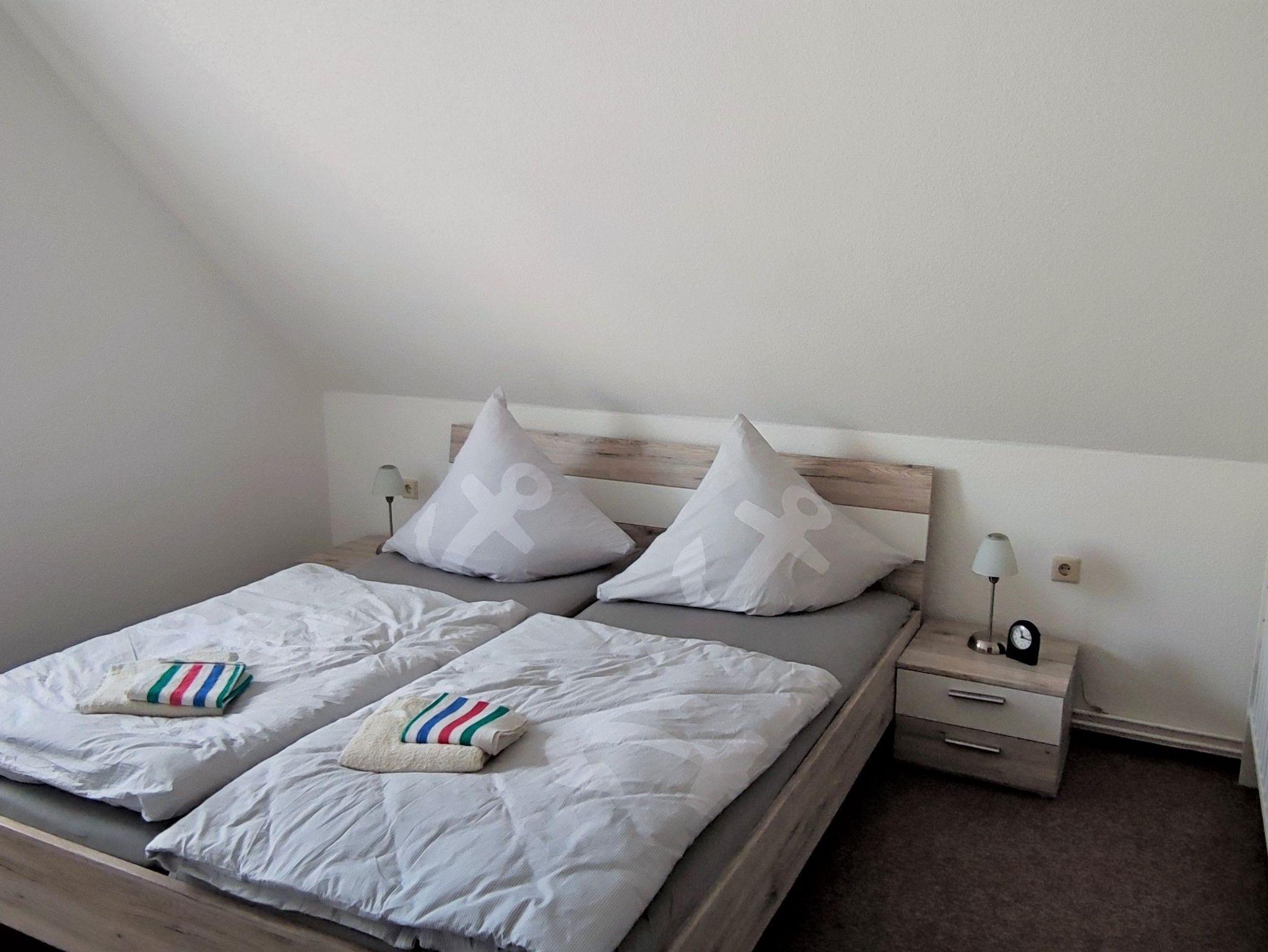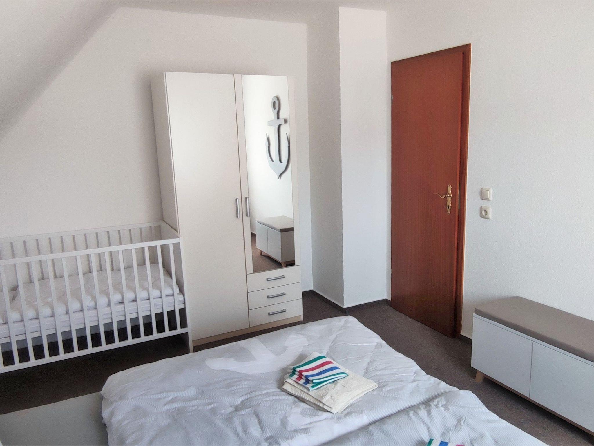Über einen separaten Eingang mit Treppe gelangen Sie in die maritime Unterkunft mit einem liebevoll eingerichteten Wohn- und Essbereich. Die beiden Schlafzimmer sind jeweils mit einem großzügigen Doppelbett und einem Kleiderschrank ausgestattet, wobei das Elternschlafzimmer zusätzlich noch mit einem festverbauten Kinderbett und Außenrollos ausgestattet ist.