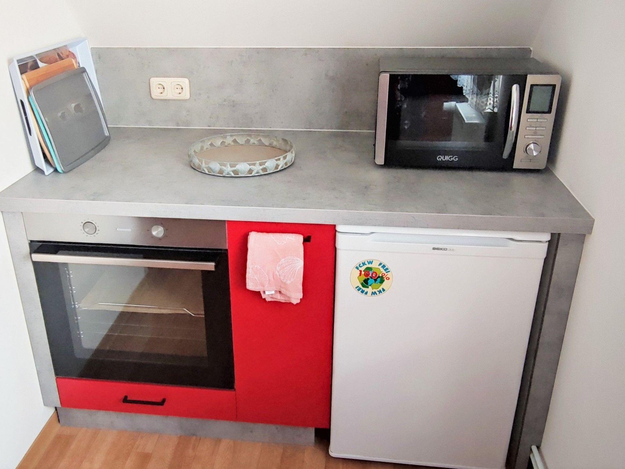 Bei der Küche handelt es sich um eine moderne zweigeteilte Einbauküche mit Herd und Backofen und einem Kühlschrank mit Gefriermöglichkeit, zusätzlich befindet sich in der Küche ein Wasserkocher, eine Kaffeemaschine und eine Mikrowelle.
