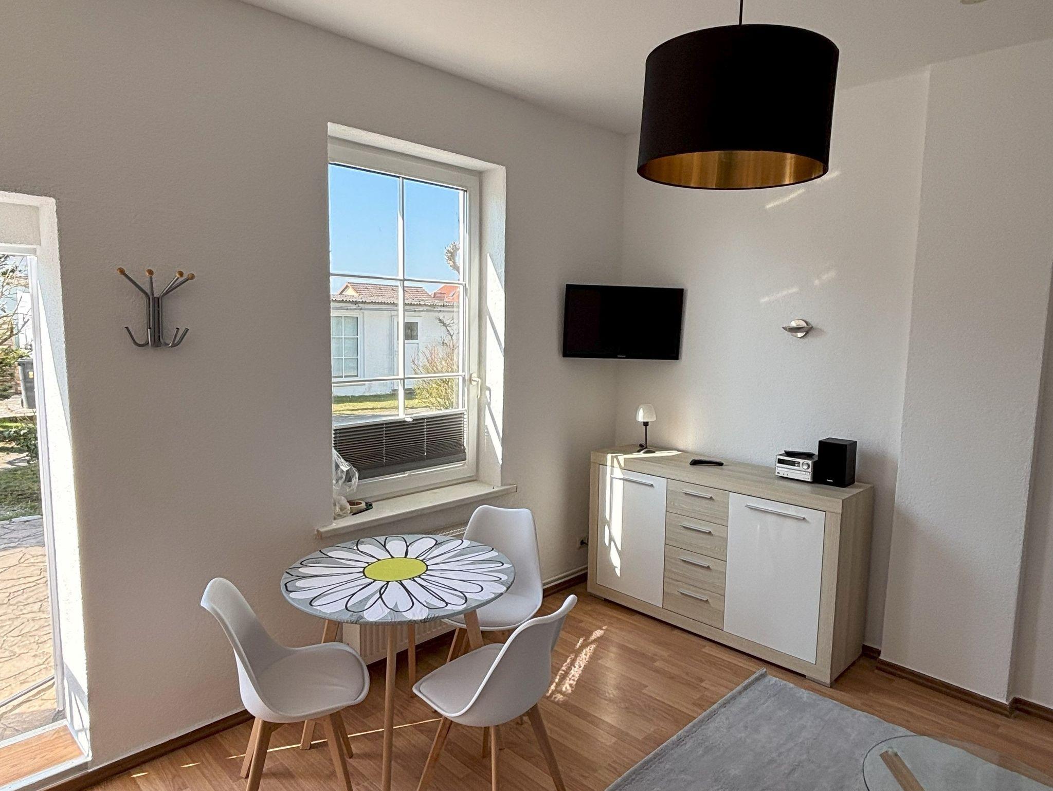 Unsere Ferienwohnung Genua ist ebenerdig im Apartmenthaus unseres Ferienobjektes gelegen und im Jahr 2025 neu aus der Zusammenlegung von 2 kleinen 1-Raum-Apartments entstanden. Nun präsentiert sie sich als kleine, feine 2-Raum-Wohnung mit gemütlichem Wohn-/ Essbereich, einem separatem Schlafraum, Tageslichtbad und Terrasse.