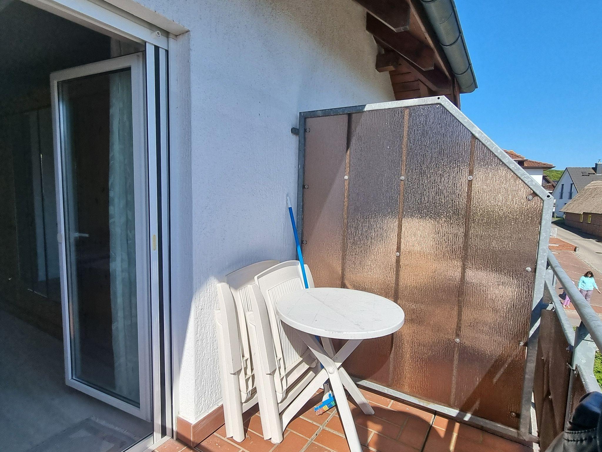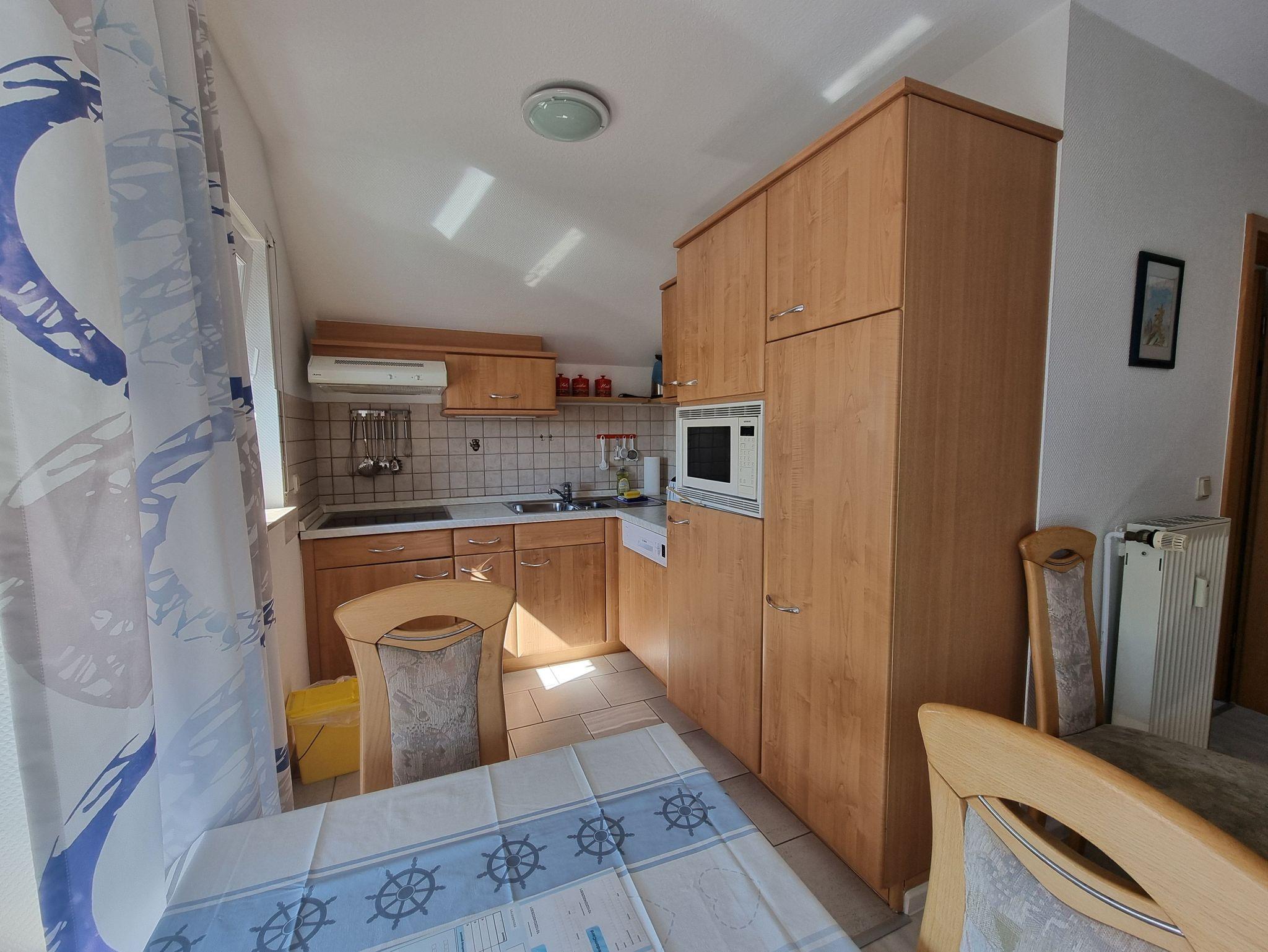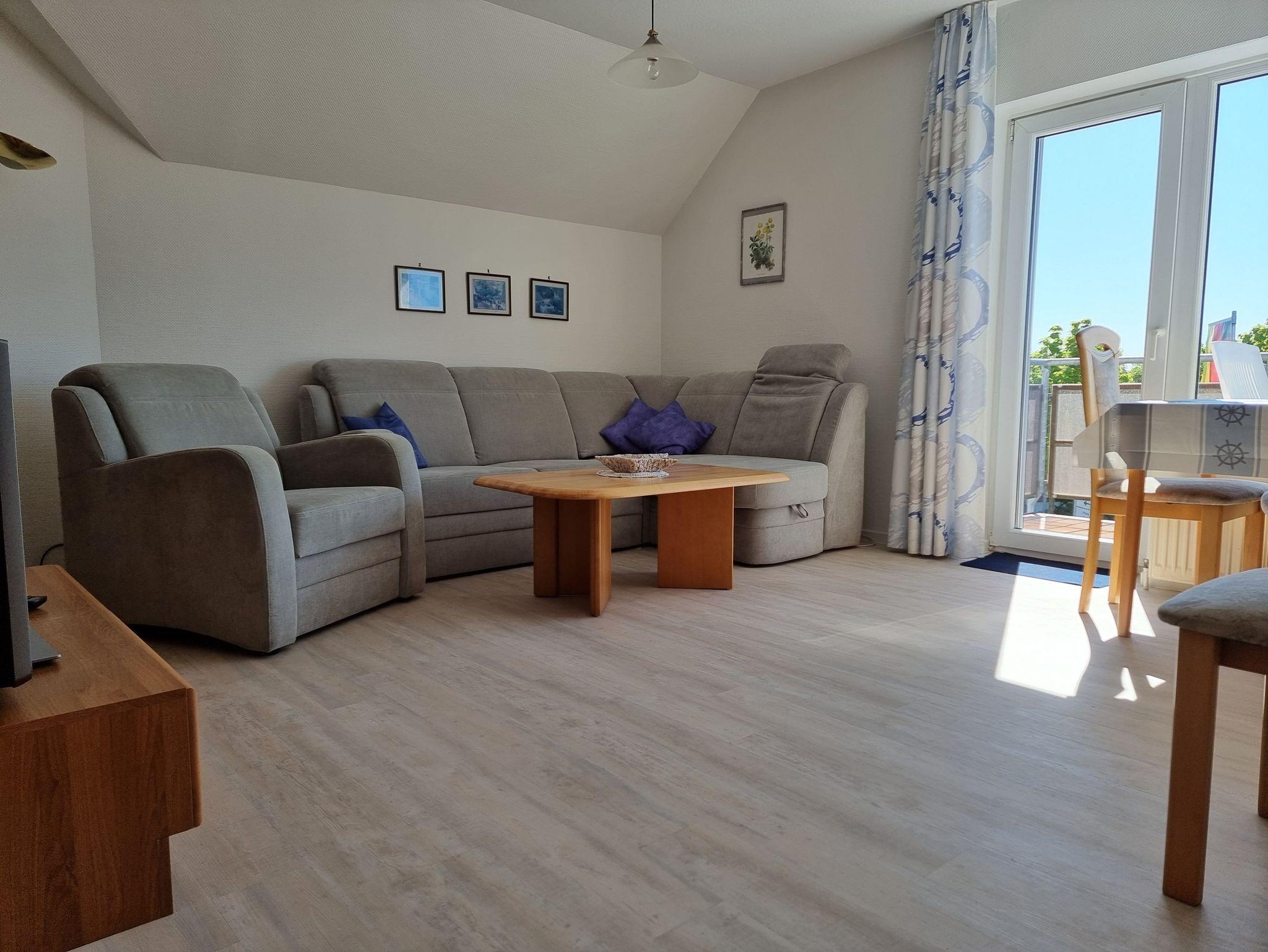 Die Wohnung verfügt über ein gemütliches Schlafzimmer mit Doppelbett sowie einen Wohnbereich mit kompletter Küchenzeile, Sitzecke, Spülmaschine und Waschmaschine. Zwei Balkone bieten unterschiedliche Blickrichtungen: Auf der Süd-Westseite genießen Sie am Nachmittag die Sonne und einen schönen Blick Richtung Achterwasser, während Sie vom Süd-Ost-Balkon das lebendige Treiben im Dorf beobachten können.