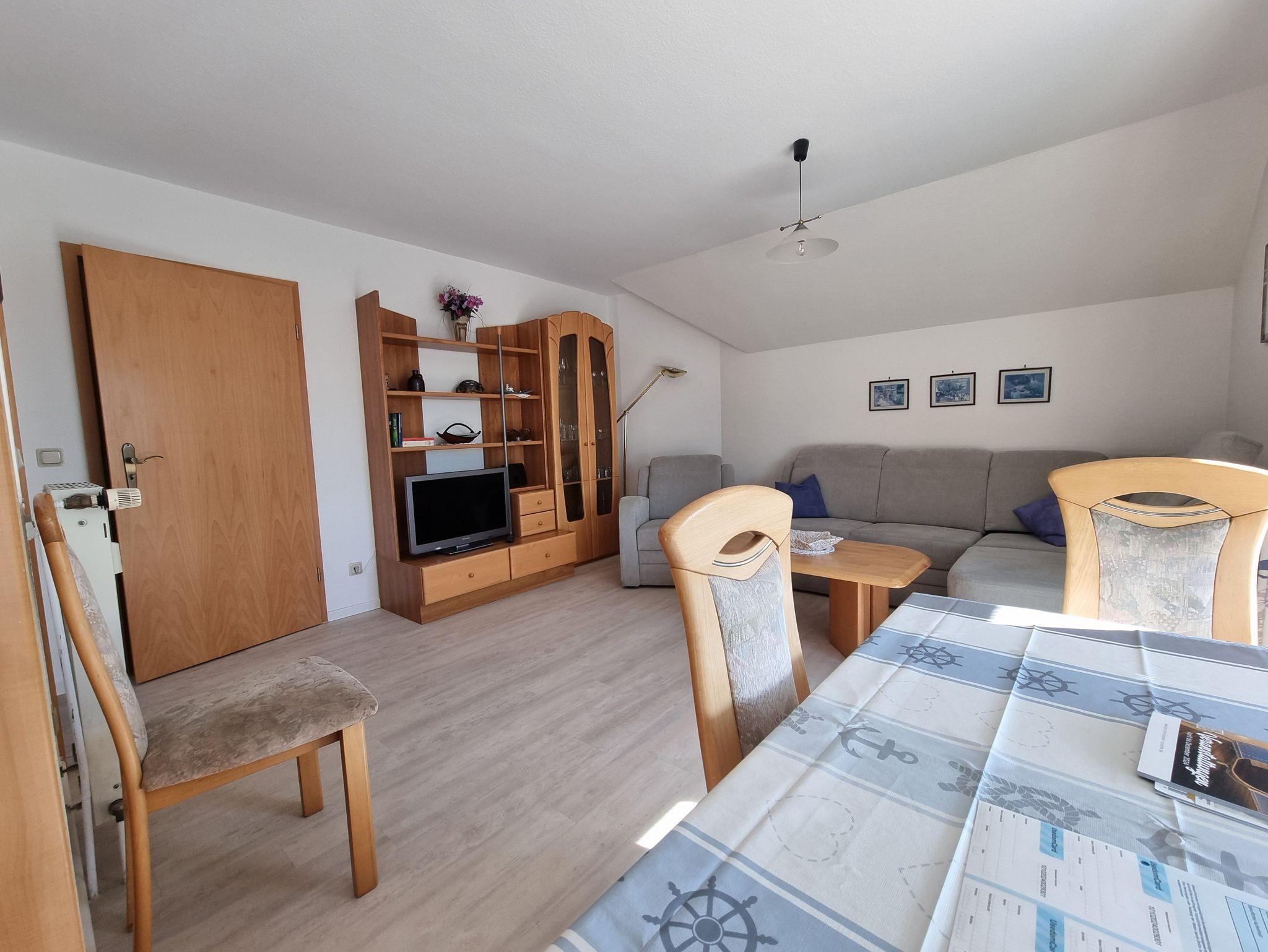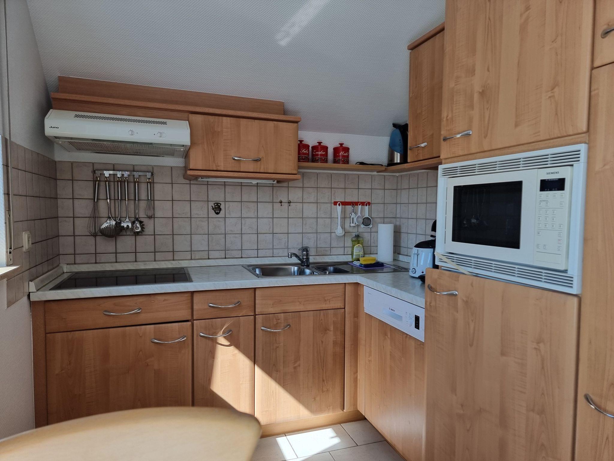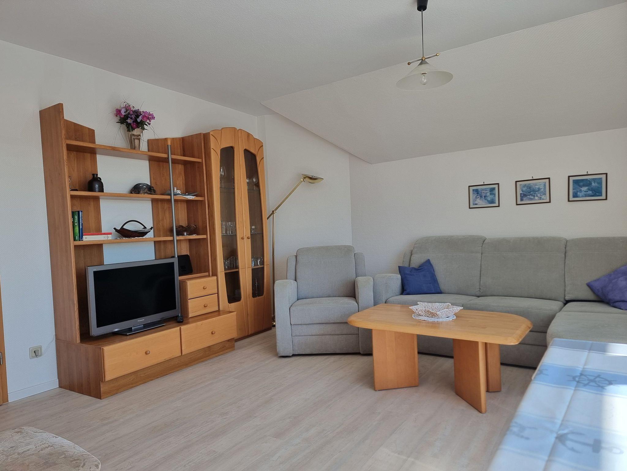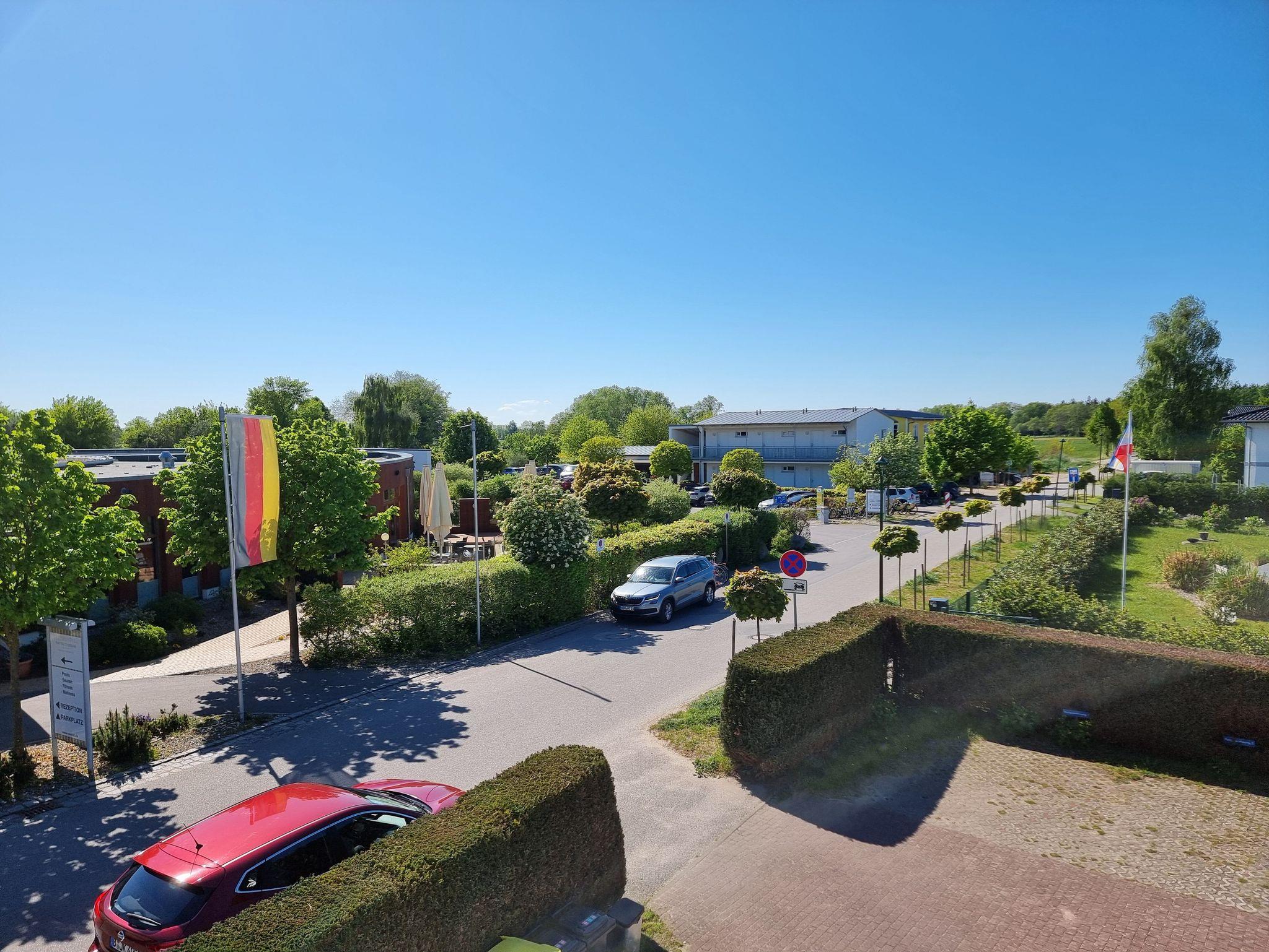Die Wohnung verfügt über ein gemütliches Schlafzimmer mit Doppelbett sowie einen Wohnbereich mit kompletter Küchenzeile, Sitzecke, Spülmaschine und Waschmaschine. Zwei Balkone bieten unterschiedliche Blickrichtungen: Auf der Süd-Westseite genießen Sie am Nachmittag die Sonne und einen schönen Blick Richtung Achterwasser, während Sie vom Süd-Ost-Balkon das lebendige Treiben im Dorf beobachten können.