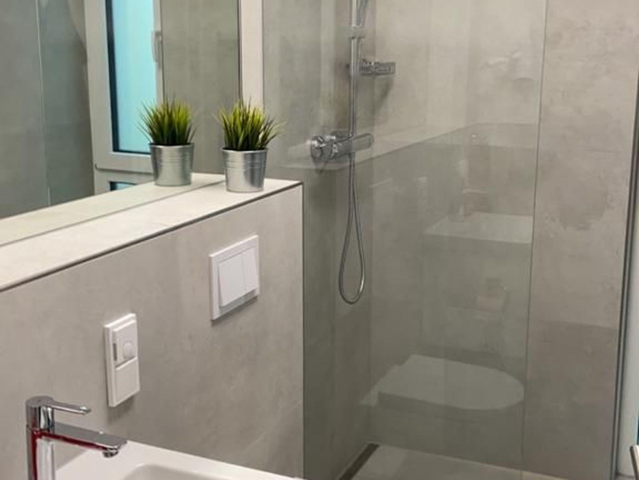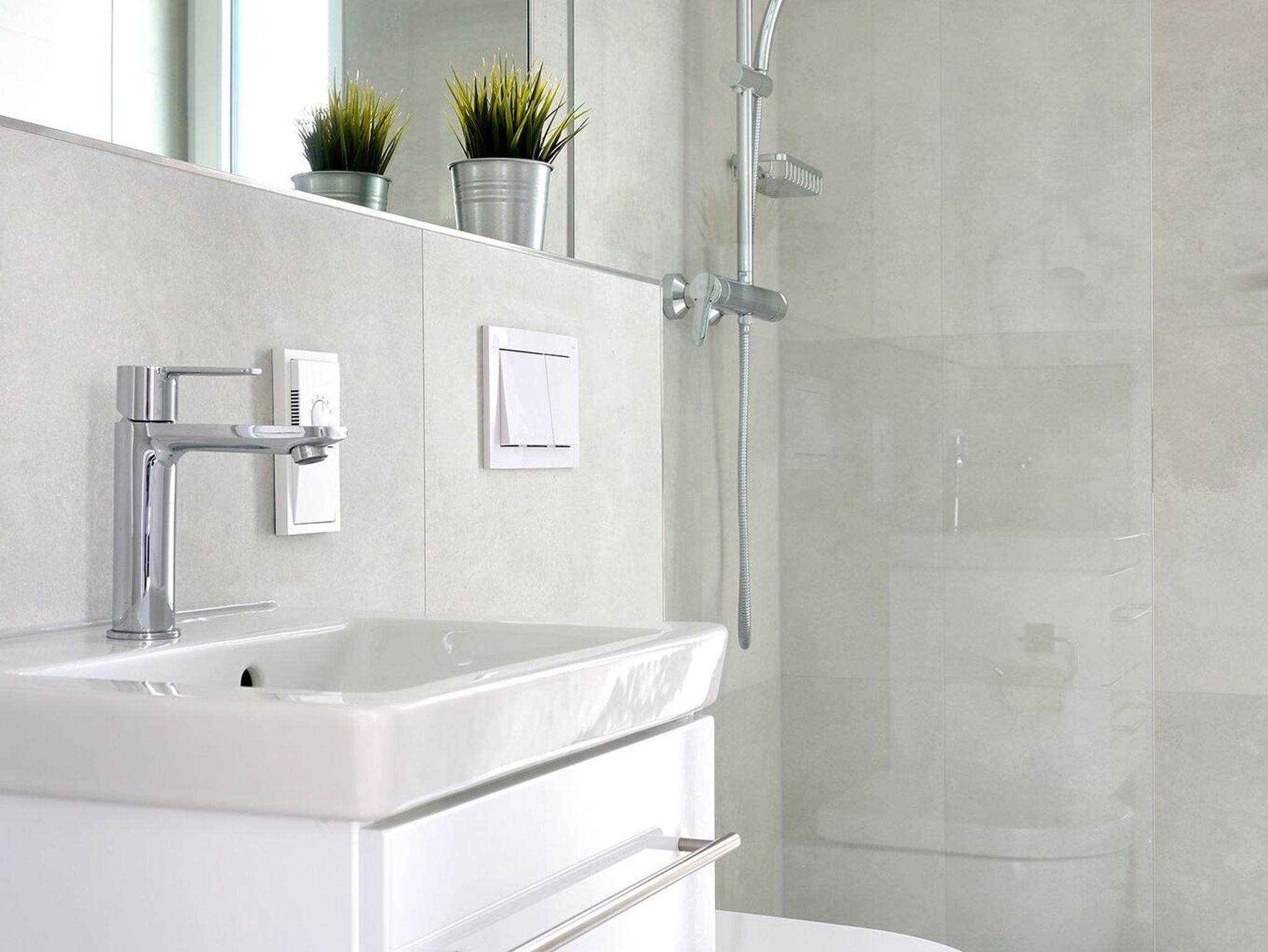Das Badezimmer ist mit einer bodengleichen Dusche mit Regendusche ausgestattet.