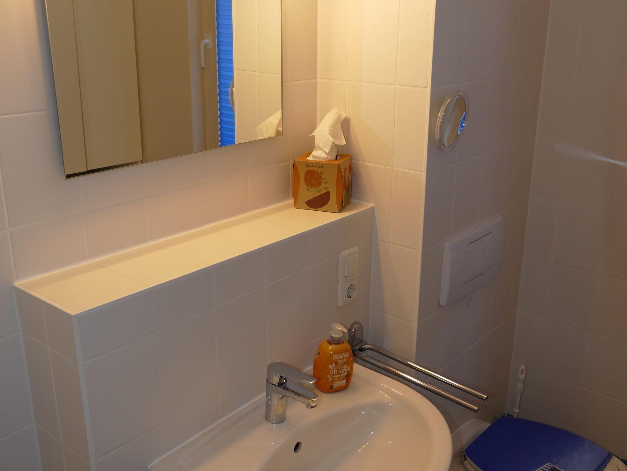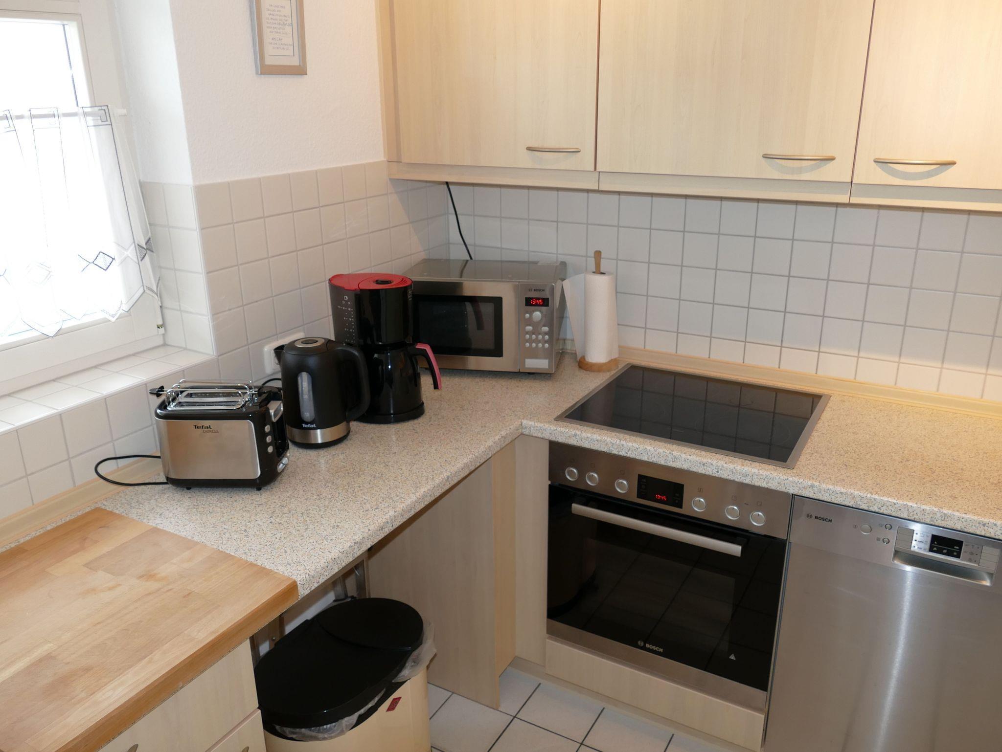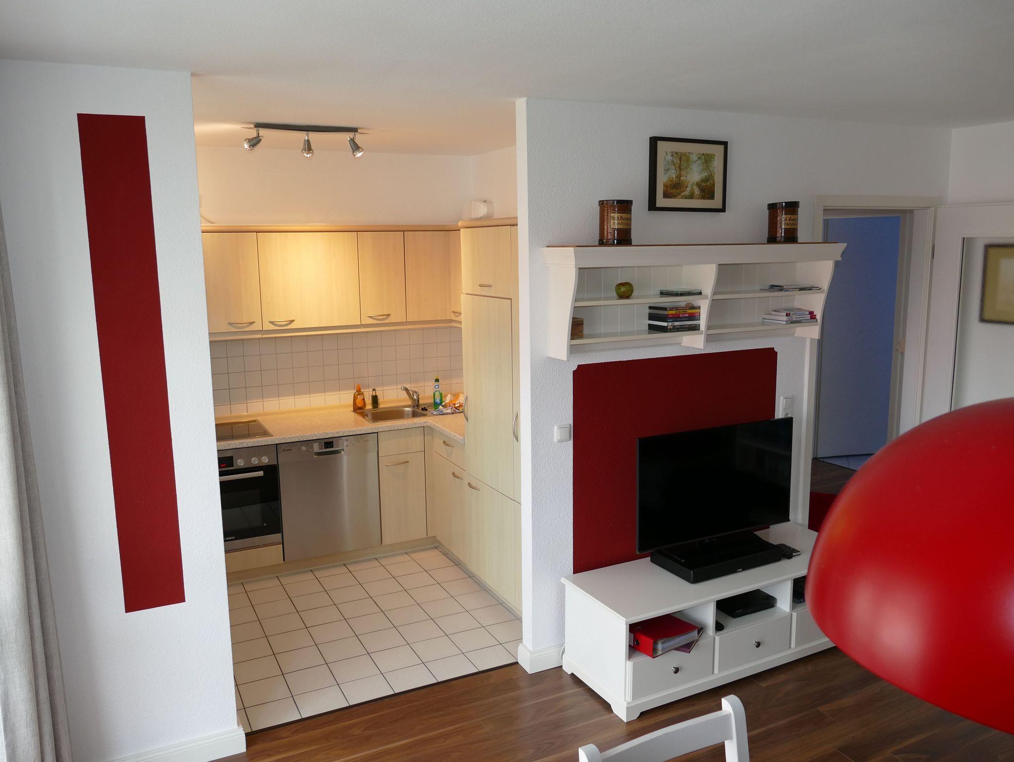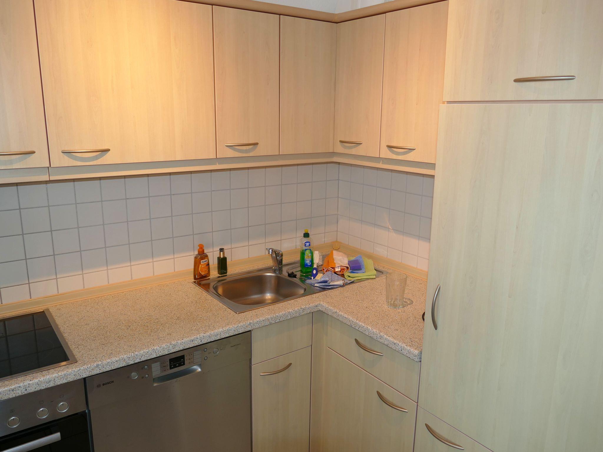 Vom Wohnzimmer gelangt man auf den Balkon in Südlage. Dieser ist je nach Jahreszeit mit Tisch und Stühlen so wie Auflagen ausgestattet. Die großzügige Einbauküche ist voll ausgestattet und beinhaltet u.a. Spülmaschine, Kühlschrank, Umluftherd mit Ceran- Kochfeld, Kaffeemaschine, Toaster, Wasserkocher und ein Microwellengerät.