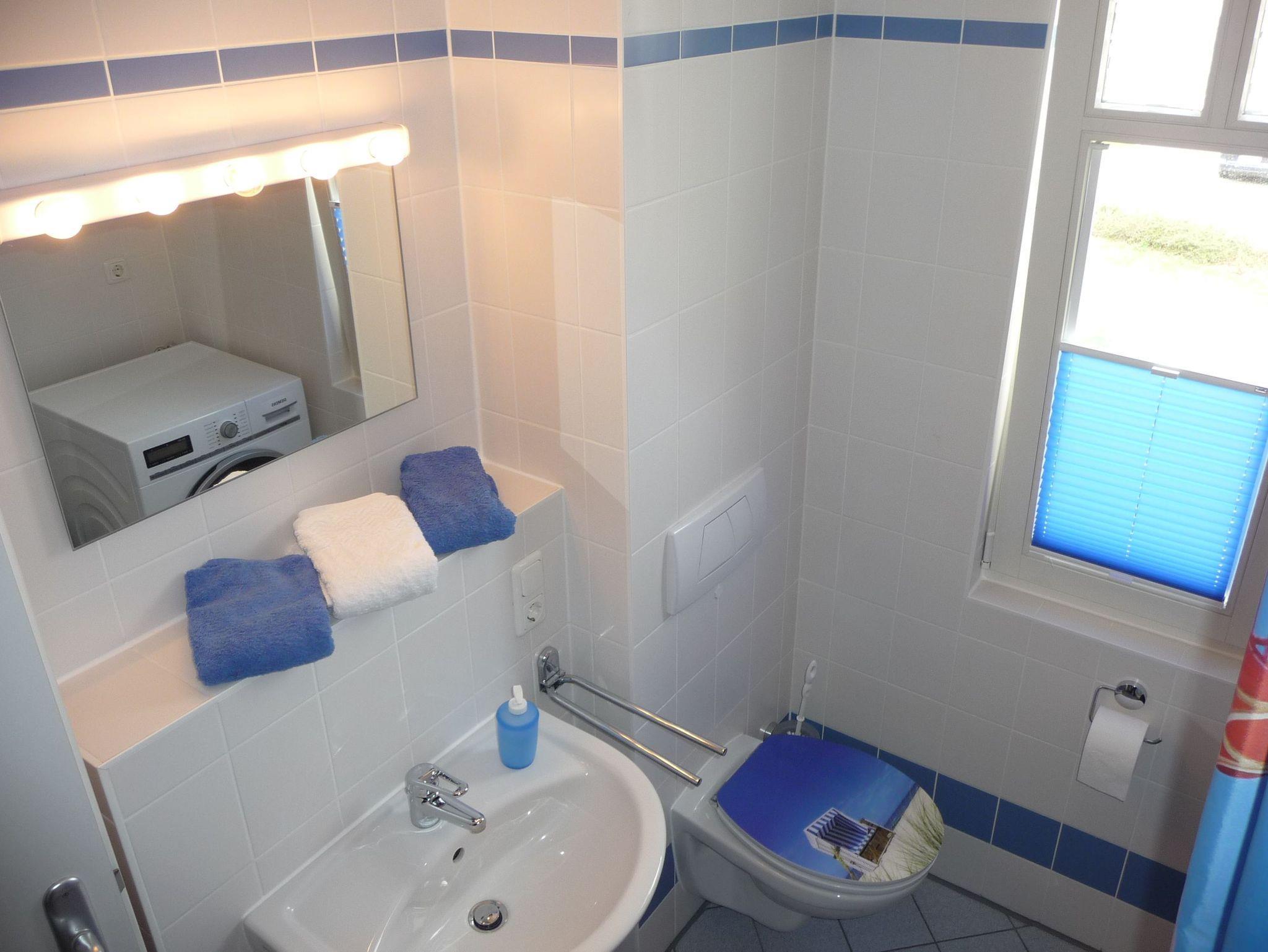 Das Bad hat ein Fenster und ist mit Wannendusche, Waschmaschine und Haartrockner ausgestattet.