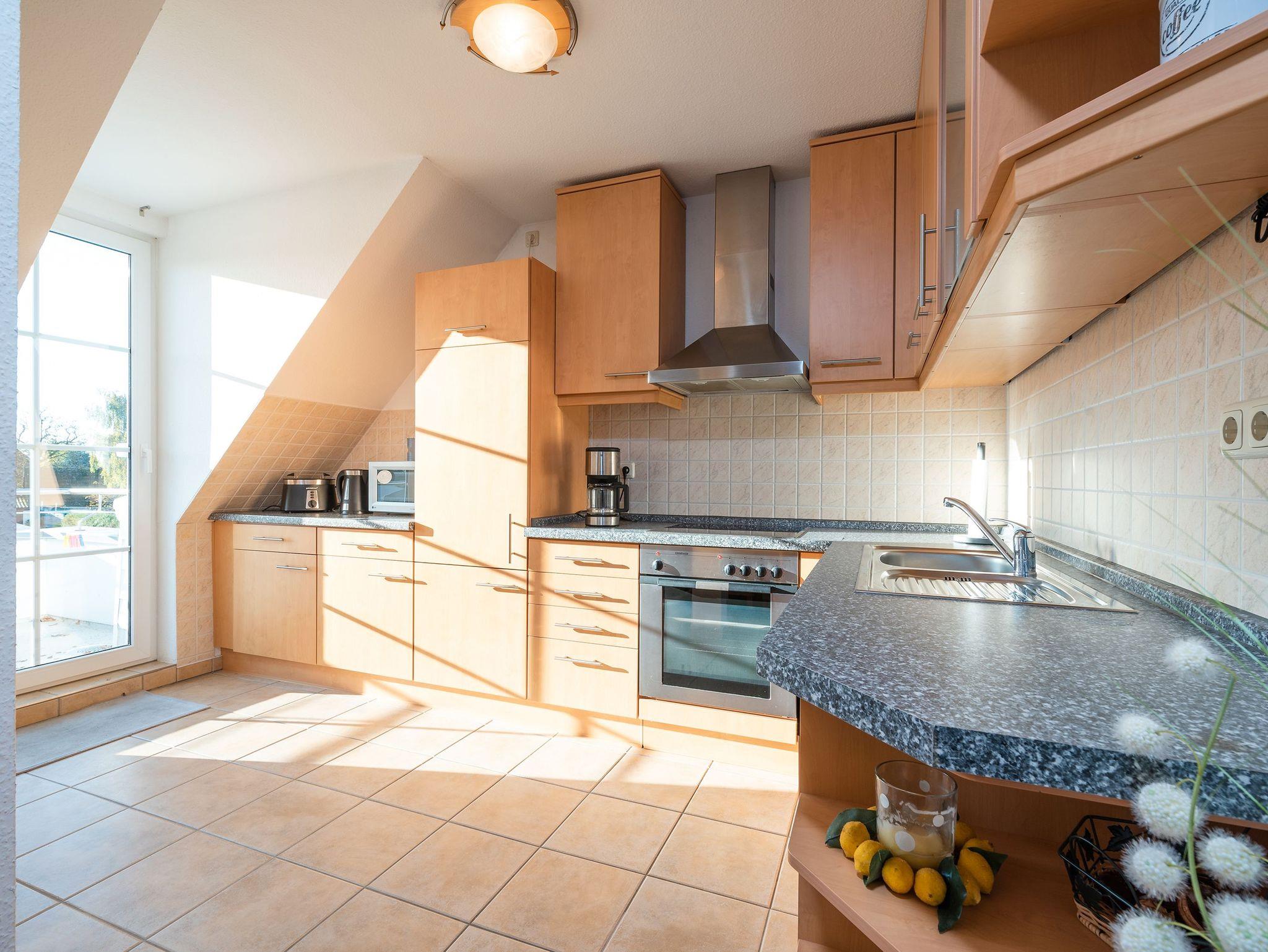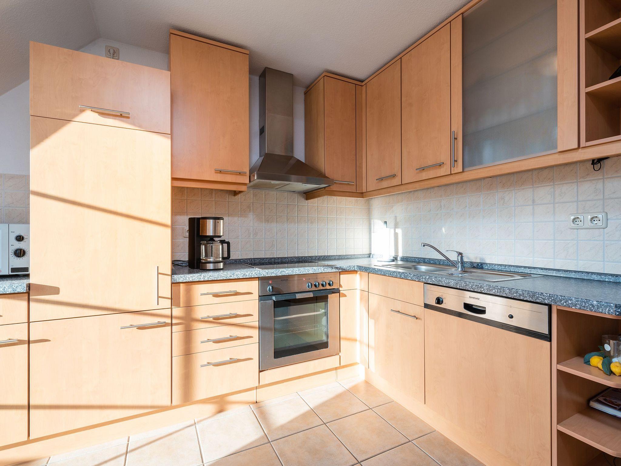 • Voll ausgestattete Küche inklusive 4-Plattenherd, Mikrowelle, Kaffeemaschine und Geschirrspüler.