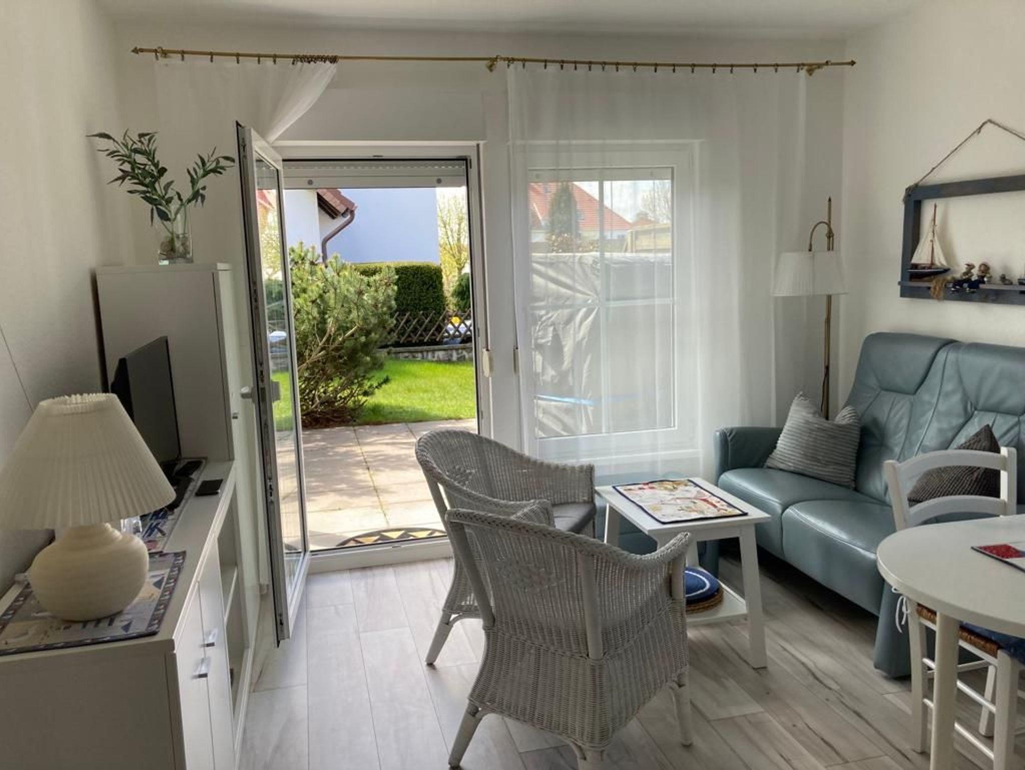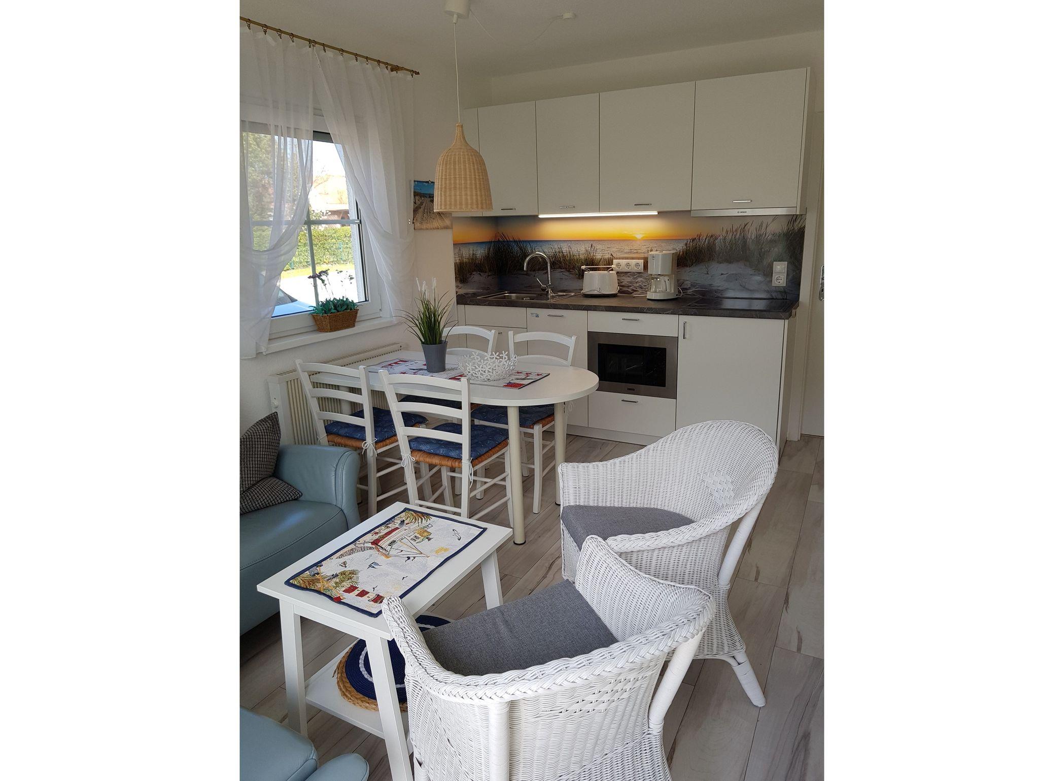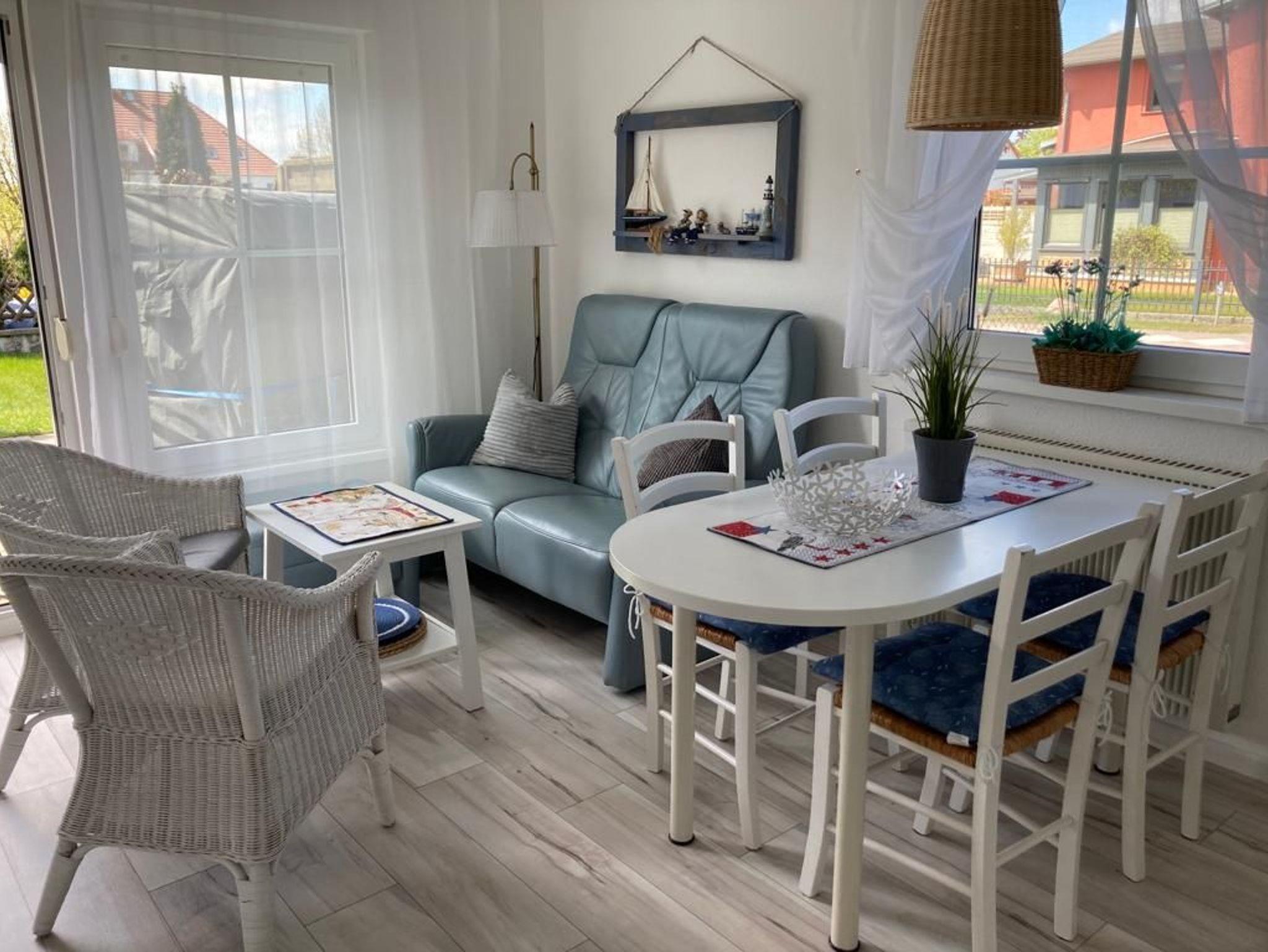 3-Zimmer Ferienwohnung im Erdgeschoss einer liebevoll angelegten Ferienanlage. Die Ferienwohnung ist im Wohnbereich ausgestattet mit einer gemütlichen Couch und einer offenen Küche mit Essbereich.