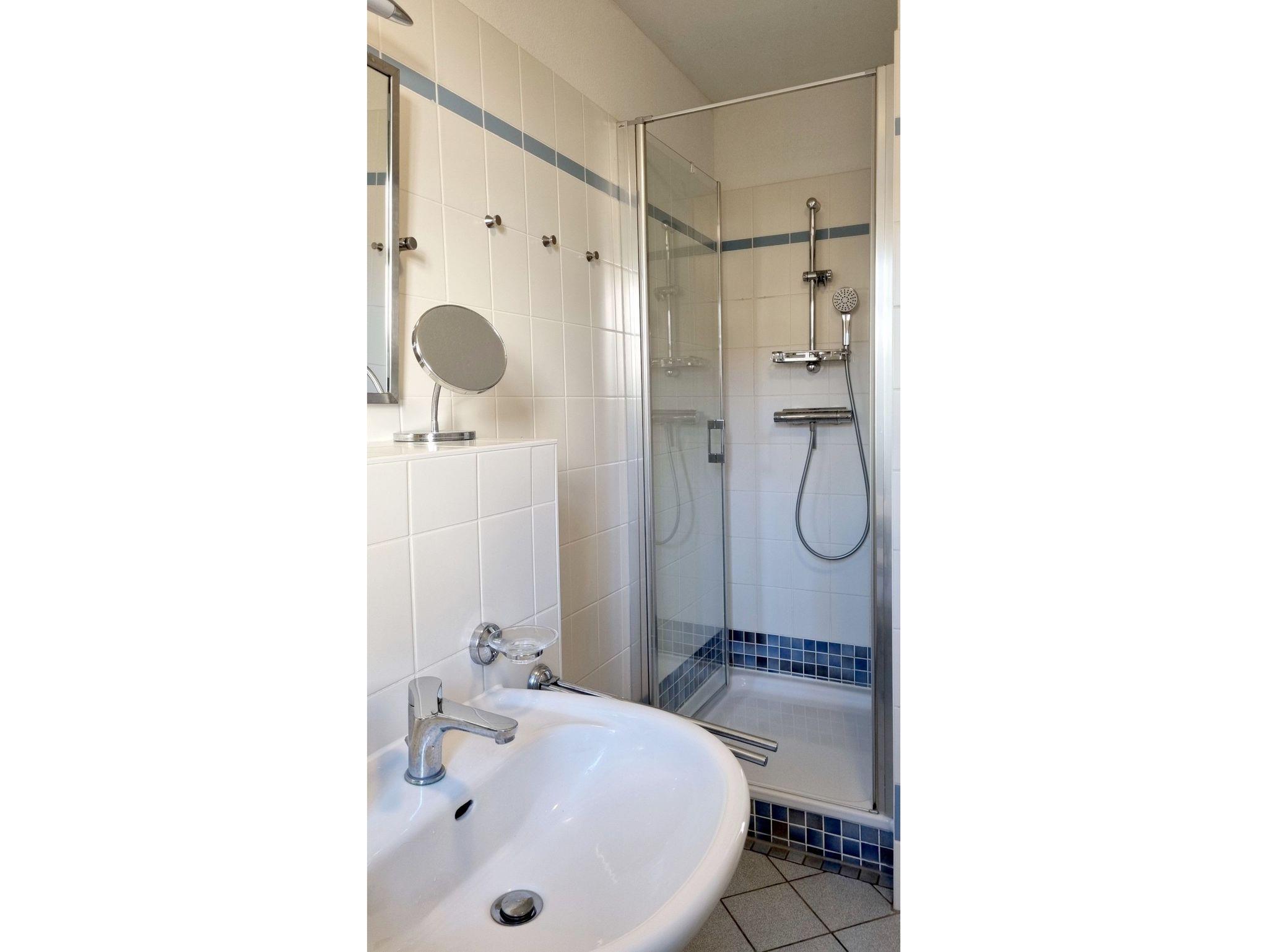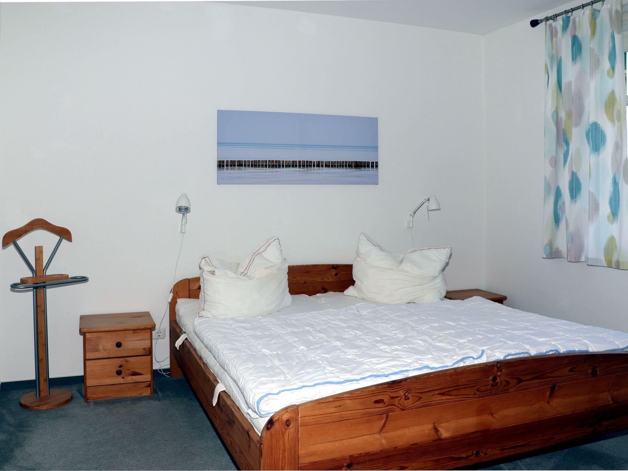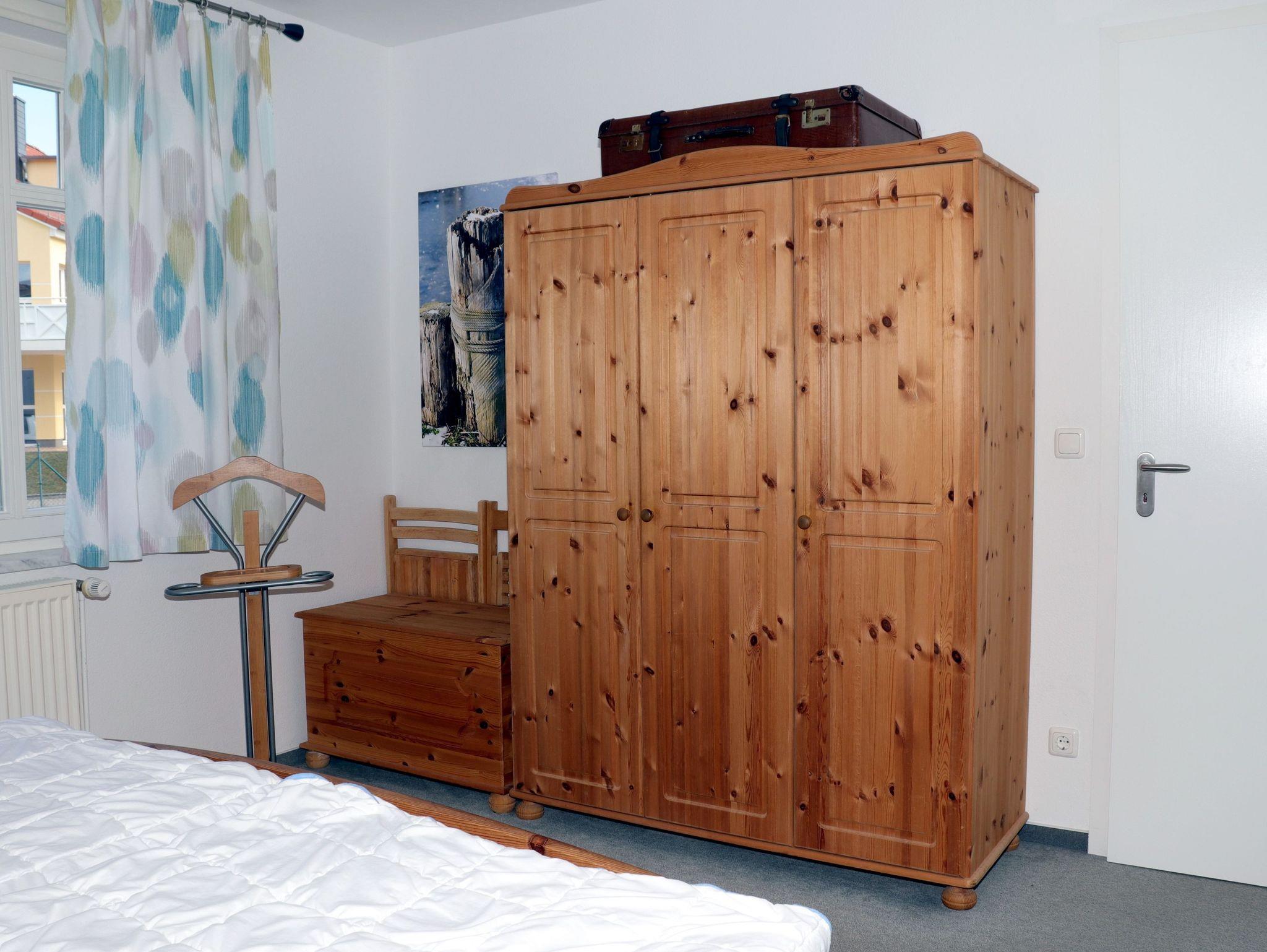 Im Schlafzimmer befindet sich ein Doppelbett (1,80x2,00 m, getrennte Matratzen) und ein Kleiderschrank. Ein Hochstuhl steht auf Anforderung kostenfrei zur Verfügung. Das Tageslicht-Badezimmer ist mit einem Waschbecken, Dusche, WC und einer Waschmaschine ausgestattet.