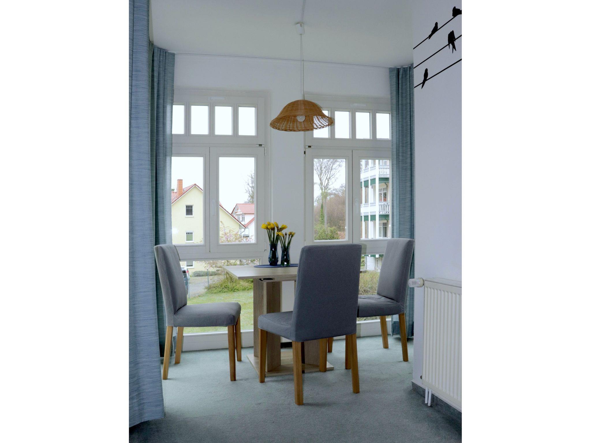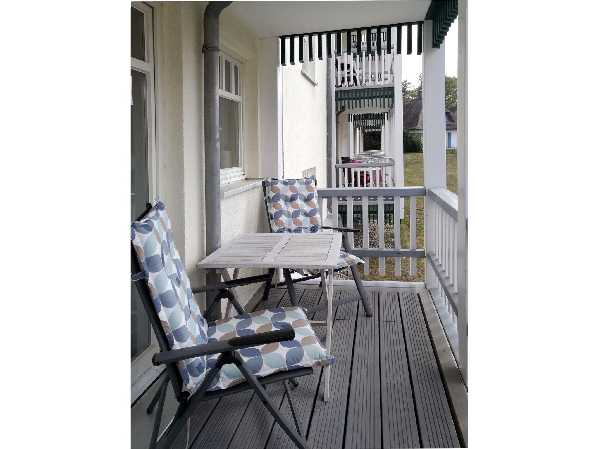 Sie verfügt über einen nach SW ausgerichteten möblierten Balkon sowie einen nach NW ausgerichteten Erker mit bodentiefen Fenstern. Die Wohnung befindet sich am Ortsrand von Koserow.