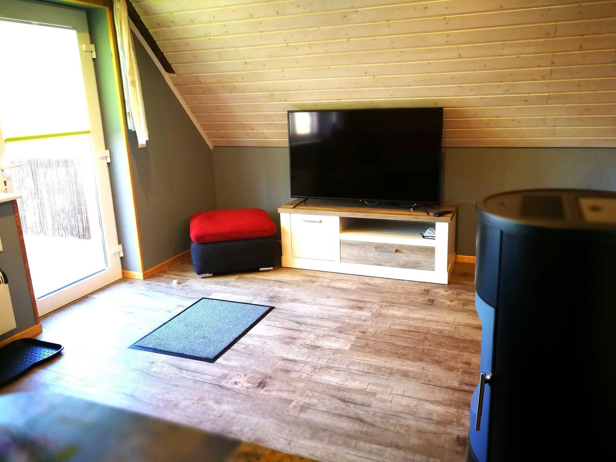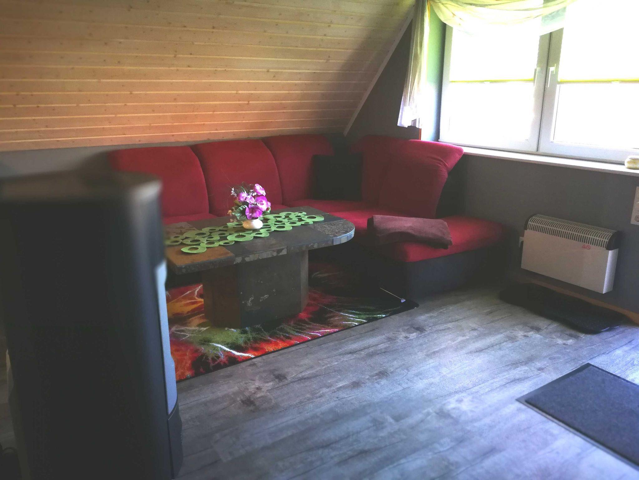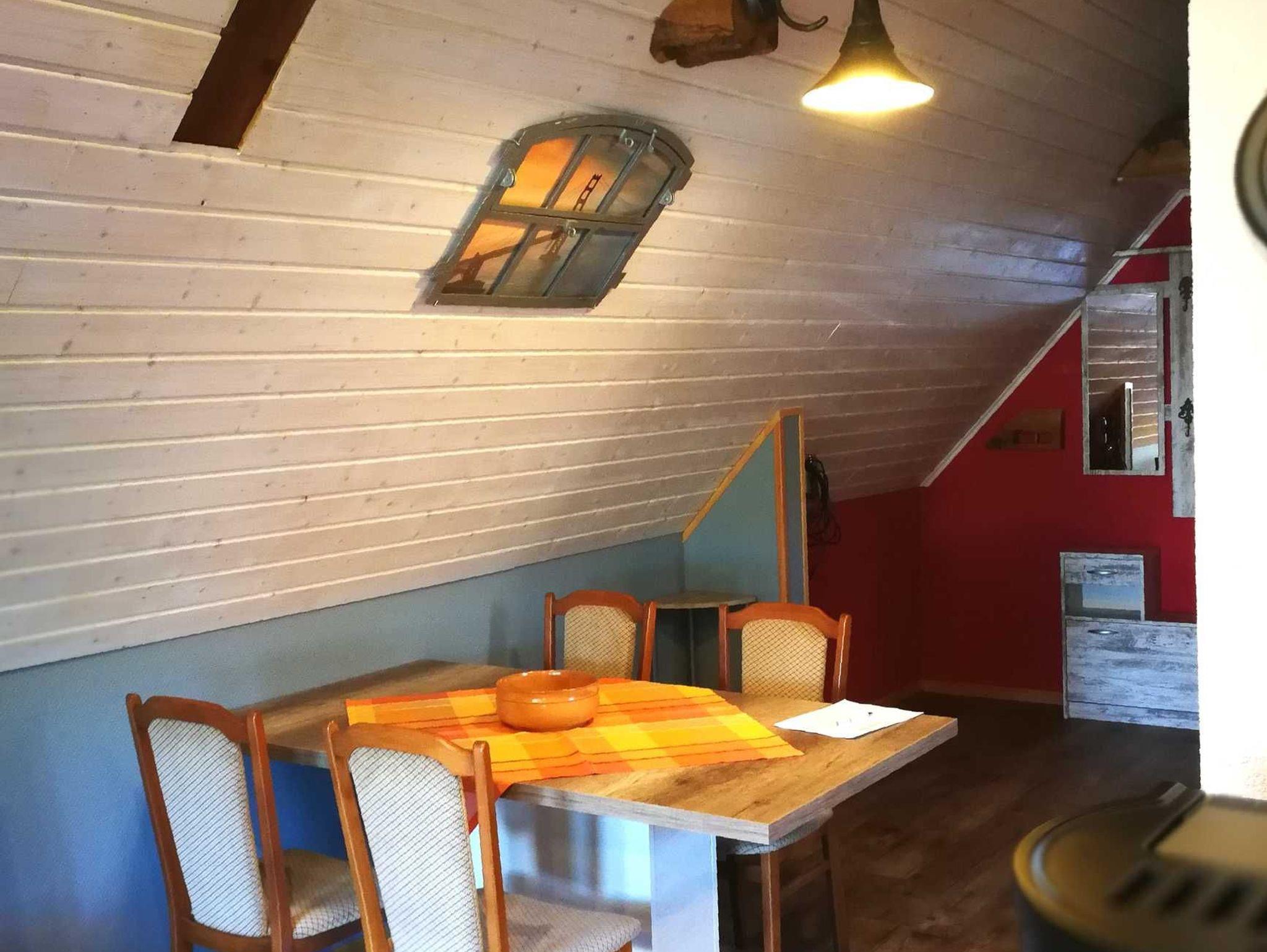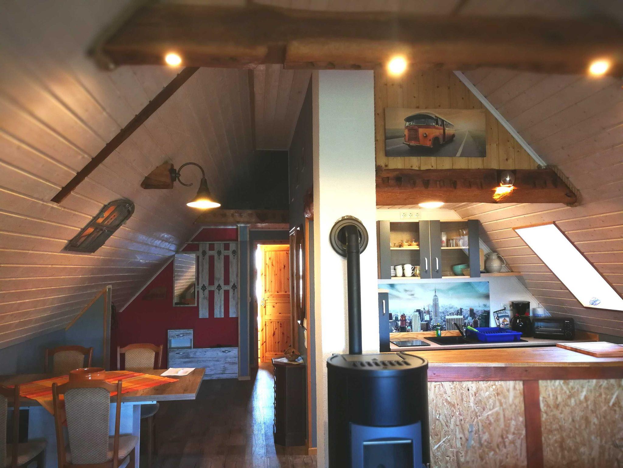 Besonderes Highlight in der Ferienwohnung: Im ausgebauten Spitzboden befindet sich zwei weiterere Schlafplätze - diese sind über eine steile Holzleiter zu erreichen. Möchten Sie für 6 Personen (2 Aufbettungen im Spitzboden) buchen, kontaktieren Sie uns bitte telefonisch. Damit es zu jeder Jahreszeit schön kuschelig ist, sorgt ein Pelletofen für romantische Stimmung. Im Mietpreis ist ein Sack Pellets enthalten, weitere können jederzeit beim Vermieter gegen Entgelt erworben werden. Die offene Küche ist mit Kaffeemaschine, Wasserkocher, Toaster und Mini-Ofen ausgestattet. Das Bad mit Dusche und WC. Haustiere sind nicht gestattet.