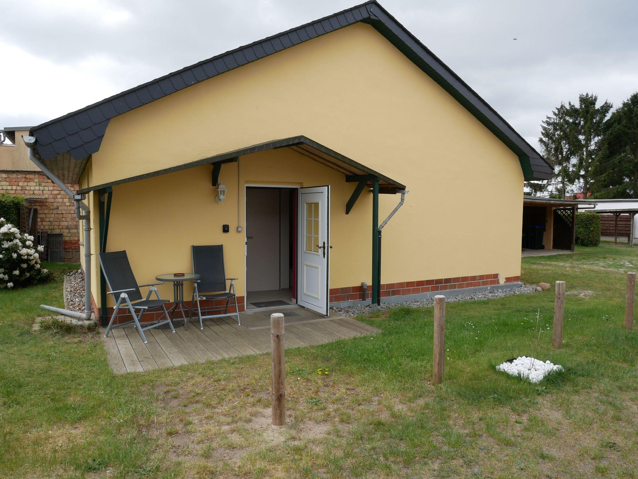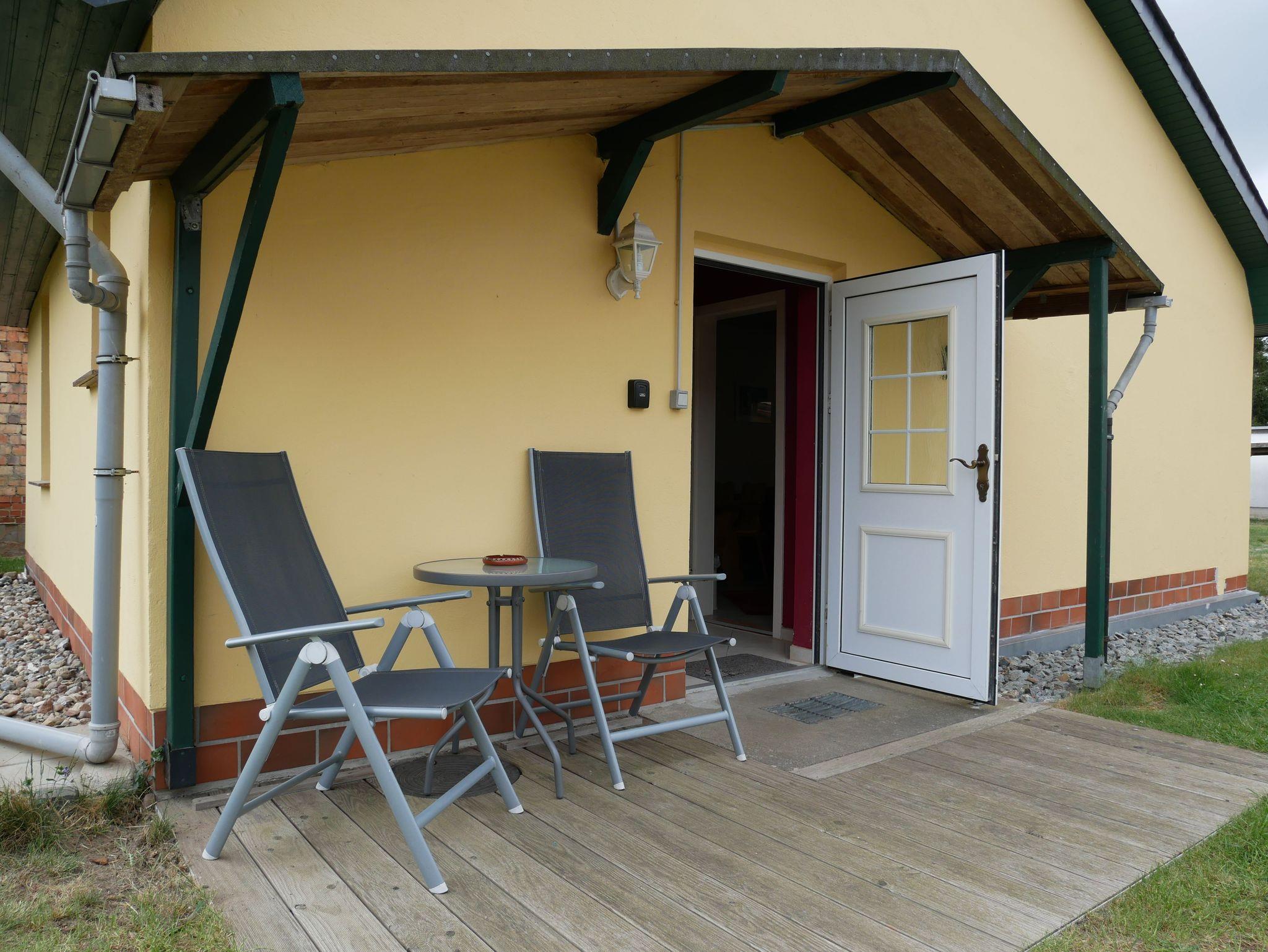 Genießen Sie die Sonne und die frische Luft auf der kleinen Terrasse direkt vor dem Häuschen, perfekt für entspannte Momente im Grünen.