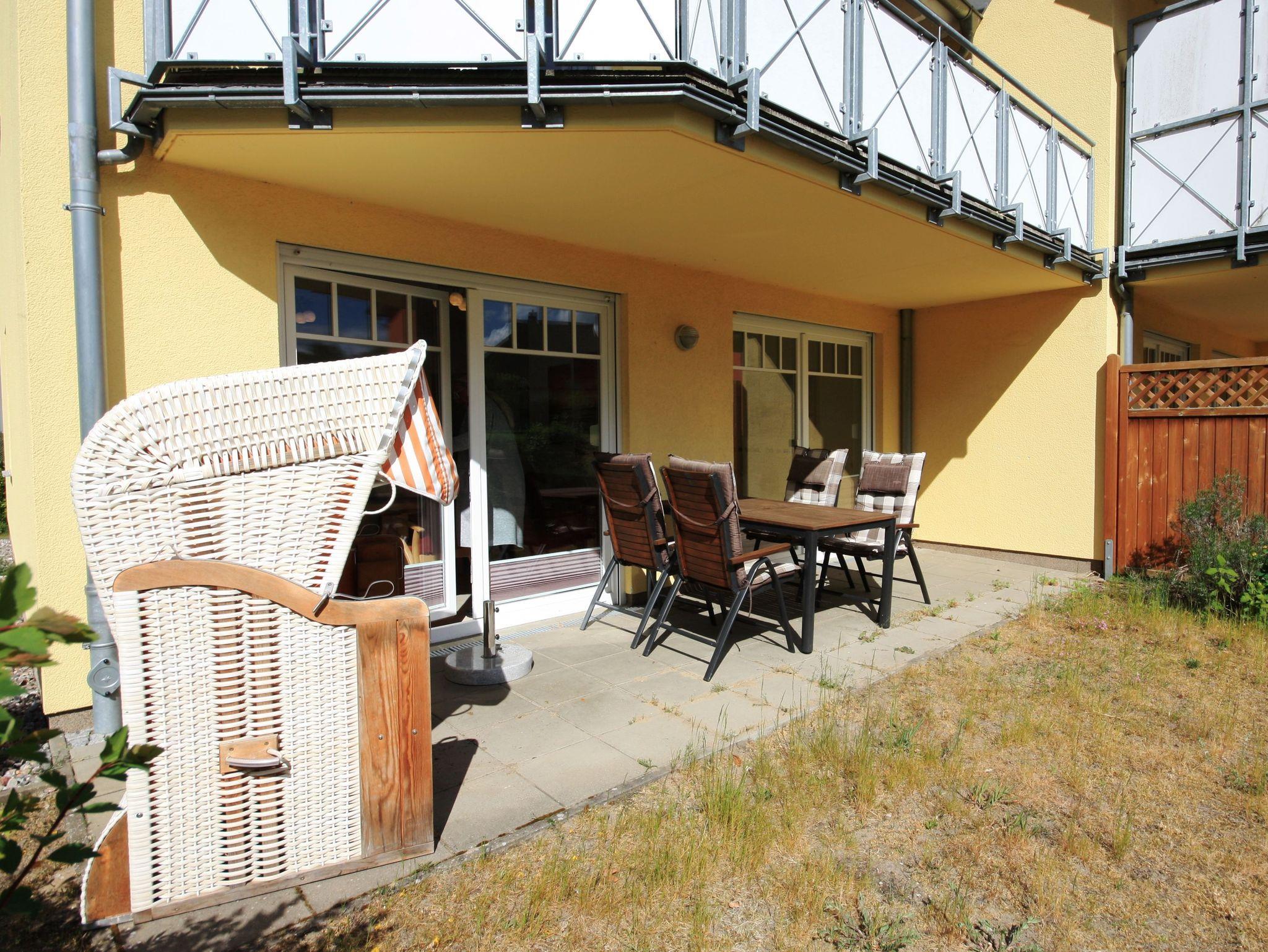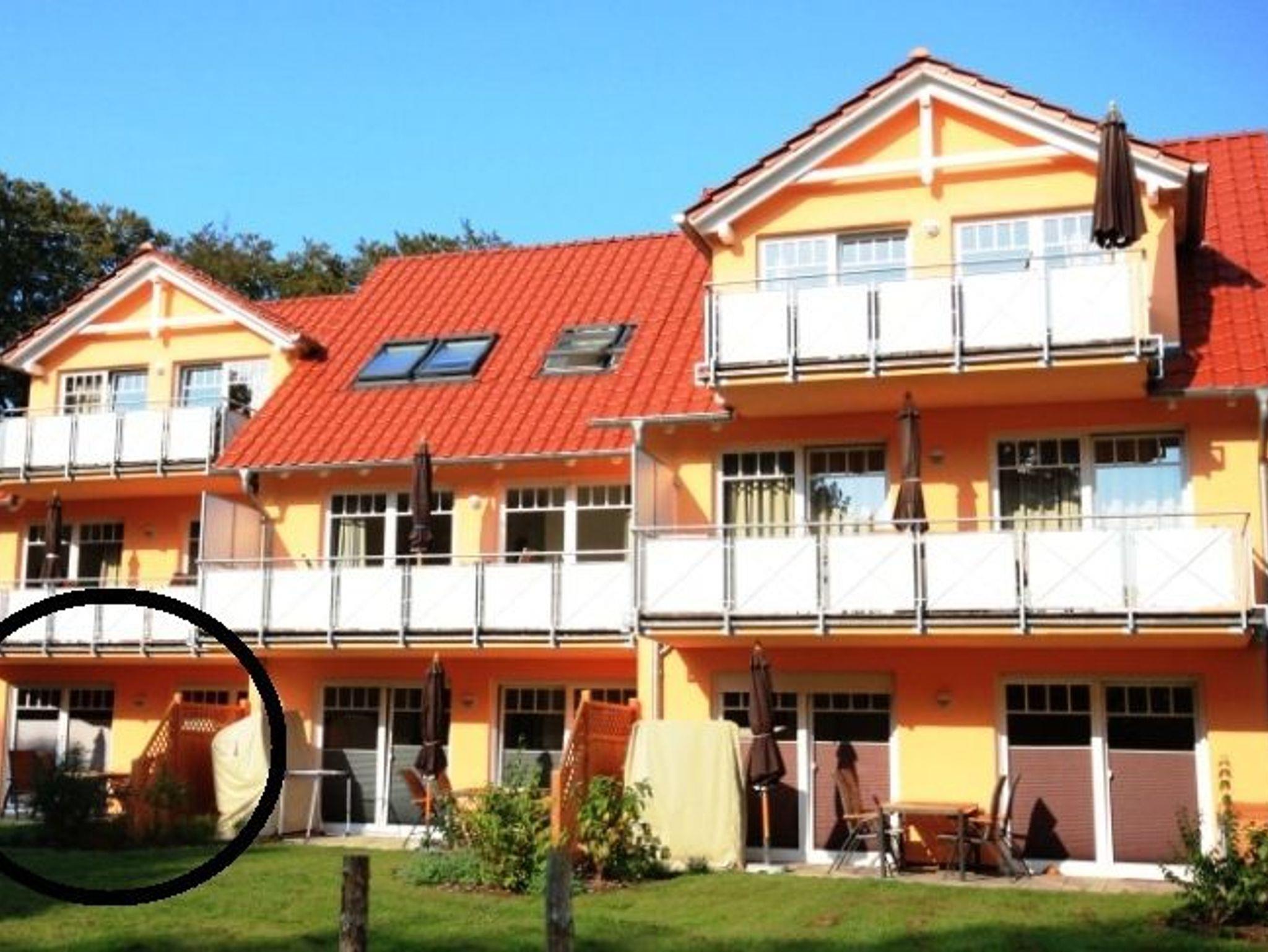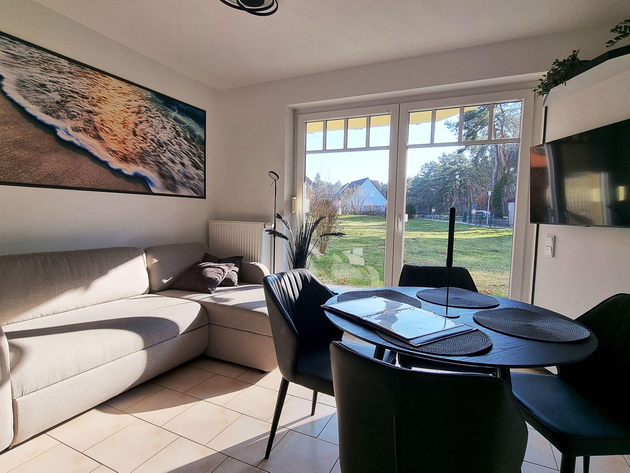 Moderne Ferienwohnung im Ferienpark Streckelsberg, 10 Min. zum Ostseestrand, mit Terrasse und Blick auf den Küstenwald.