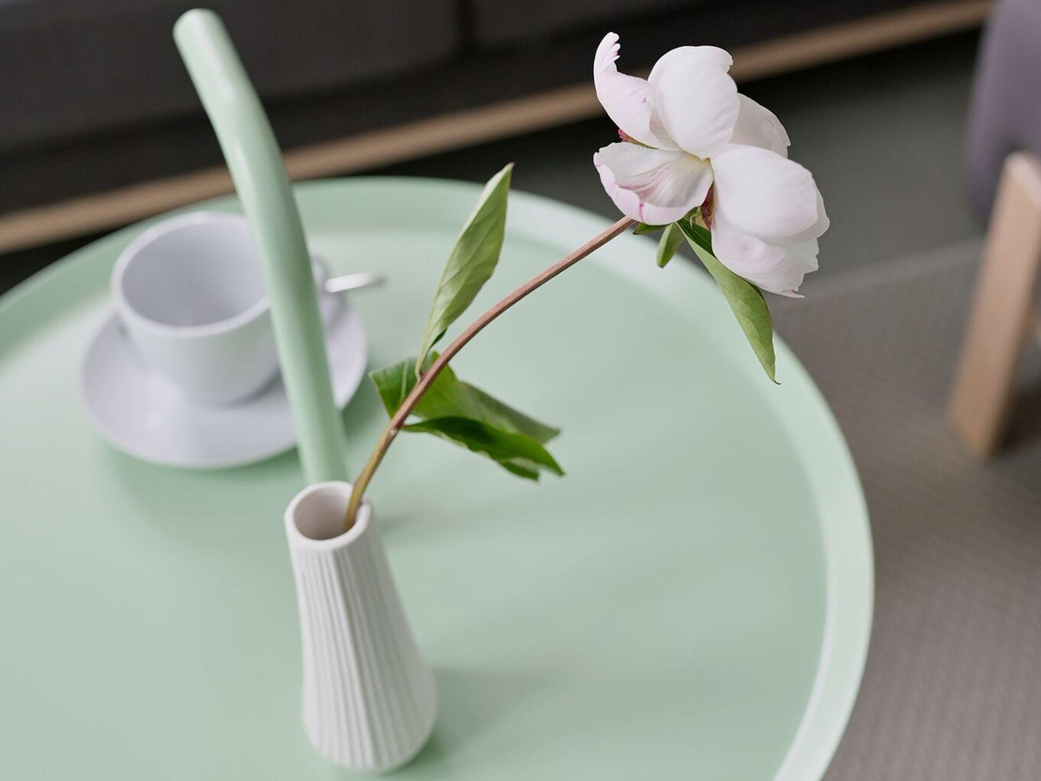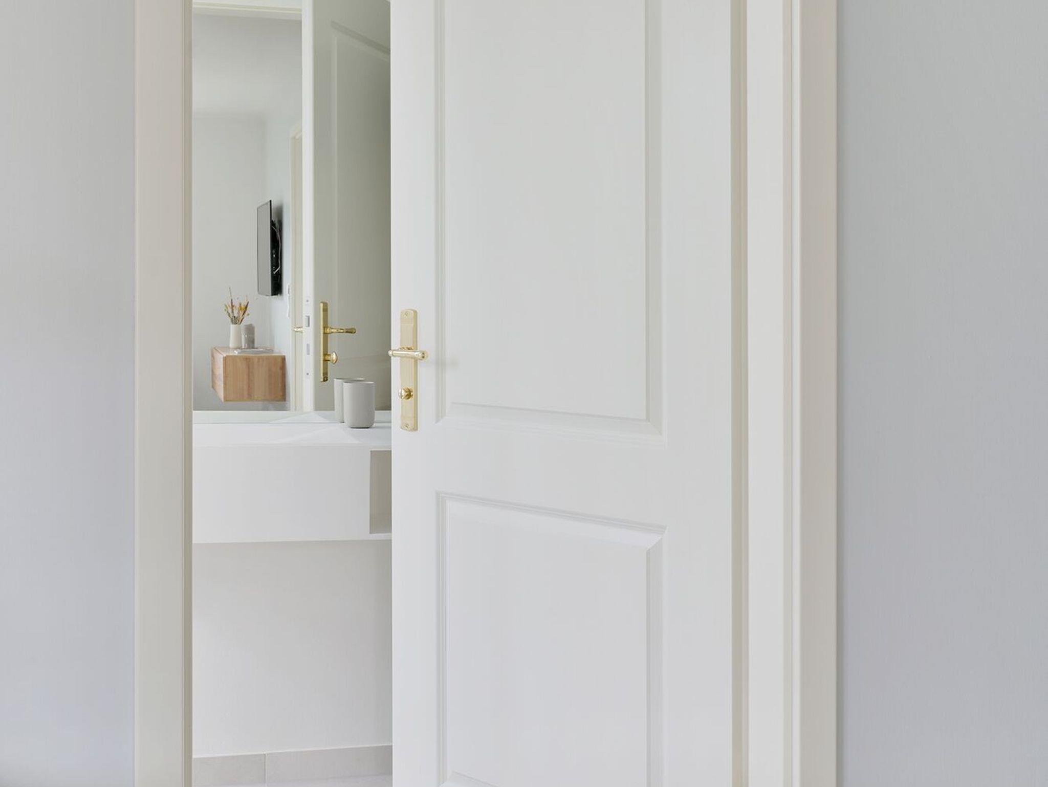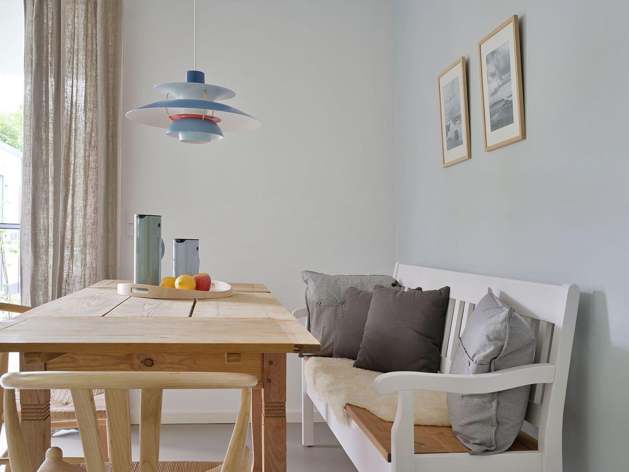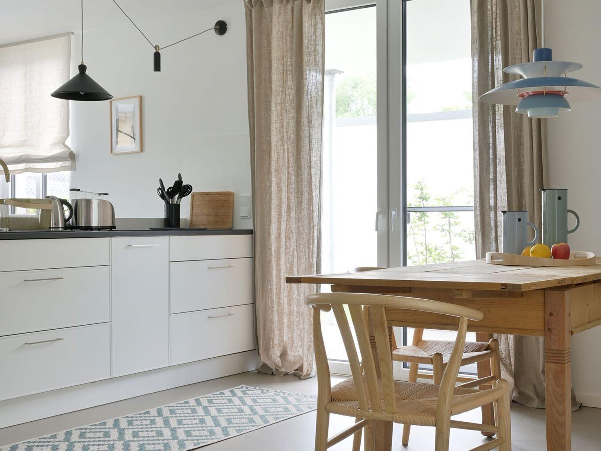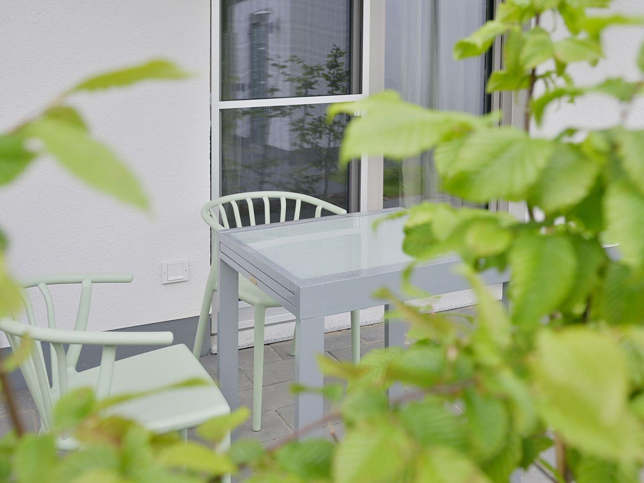 Bodentiefe Fenster ermöglichen einen direkten Zugang zur Terrasse, welche mit Gartenmöbeln ausgestattet ist. Ausgewählte Möbel und schlichte Oberflächen schaffen Gemütlichkeit und ein ruhiges Raumgefühl.