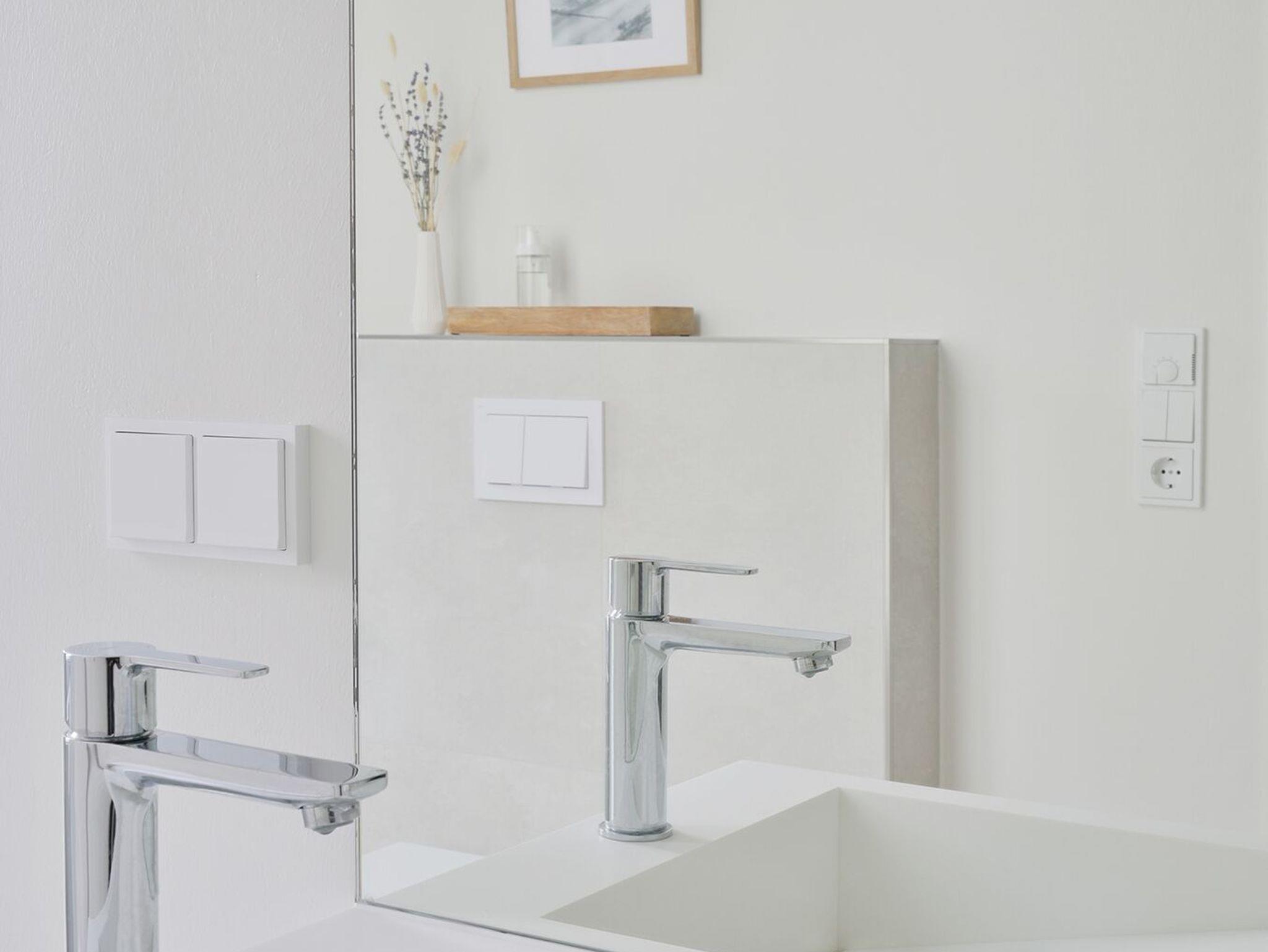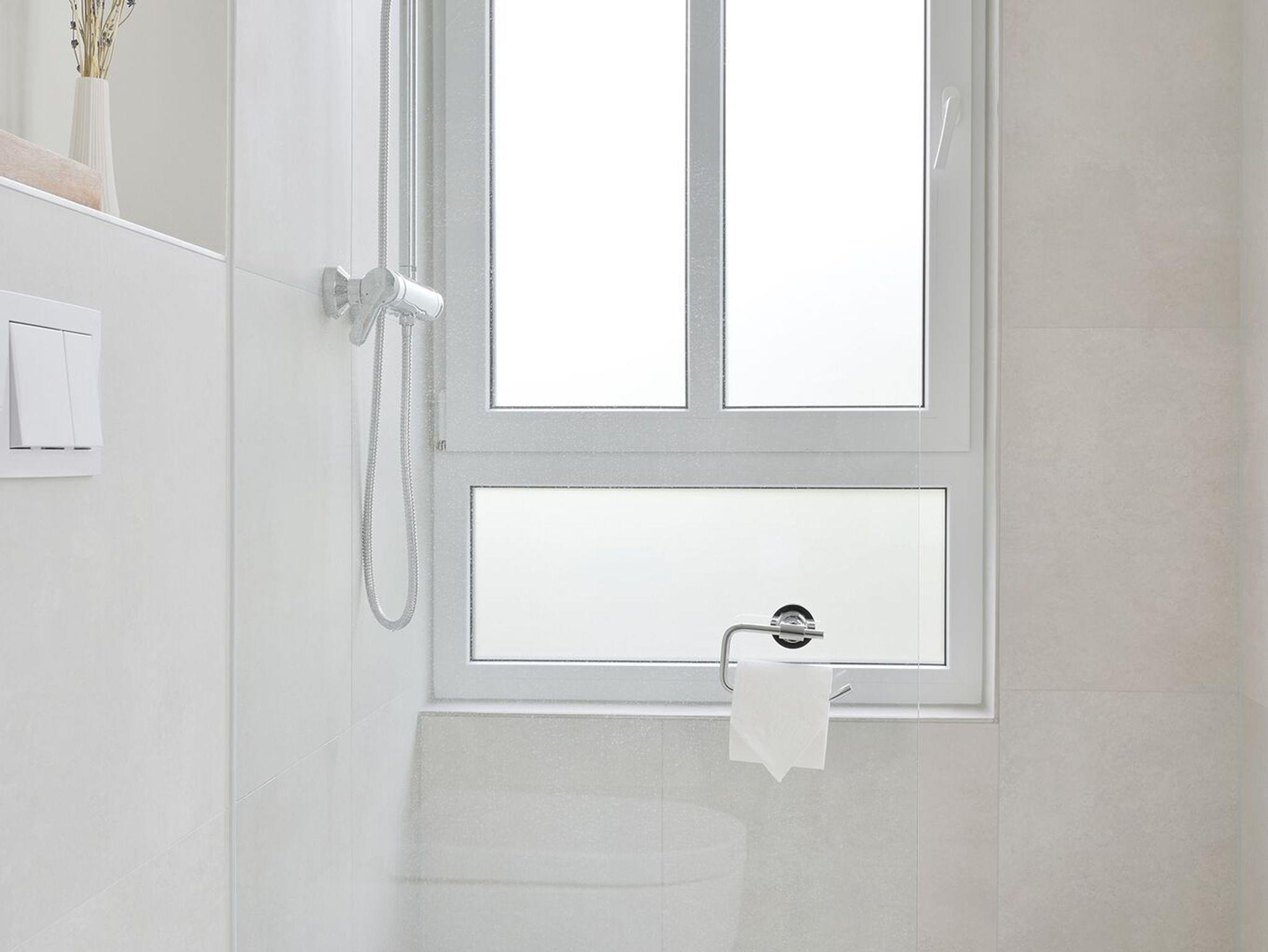 Das Badezimmer ist mit einer bodengleichen Dusche mit Regendusche ausgestattet.