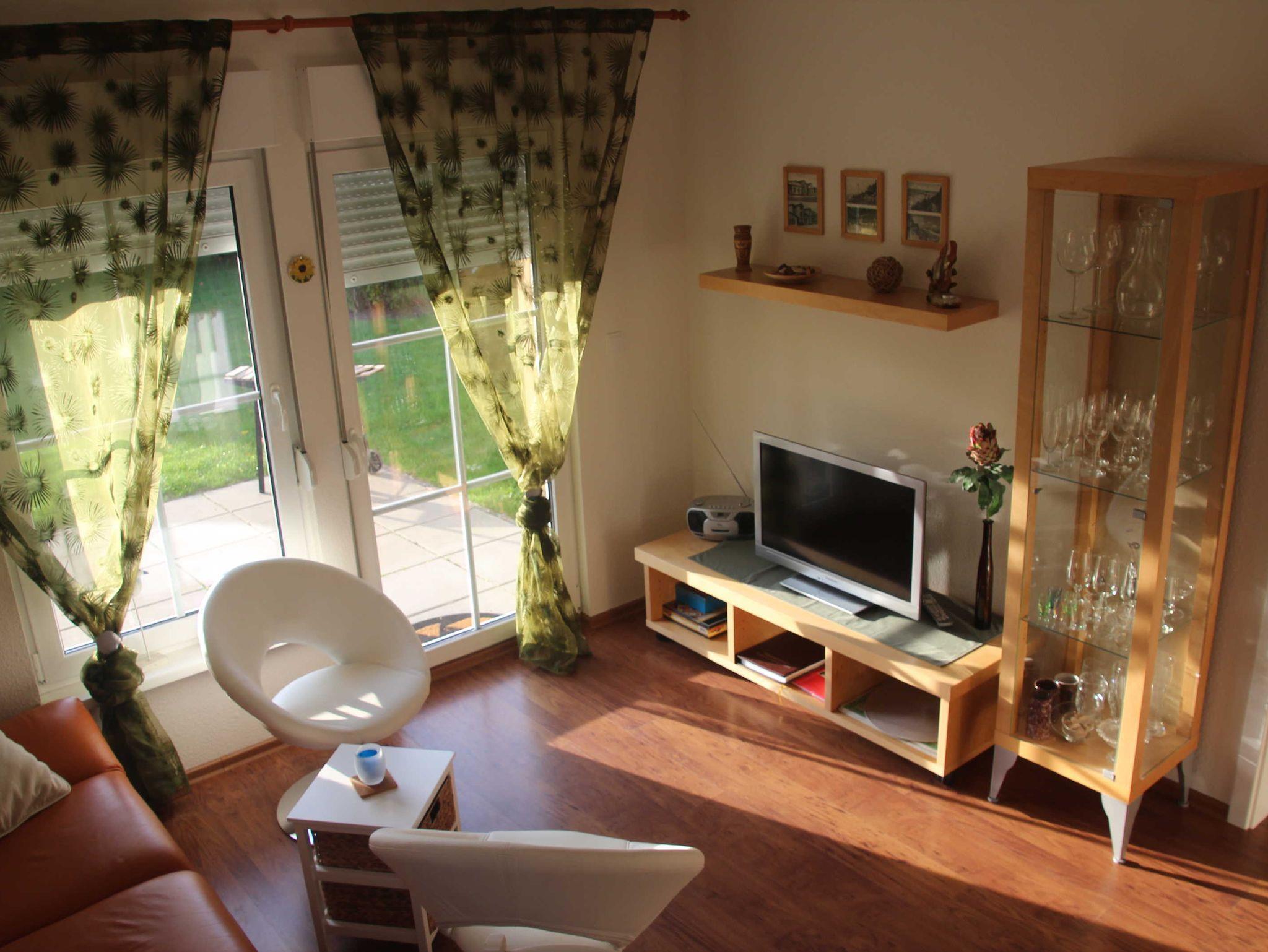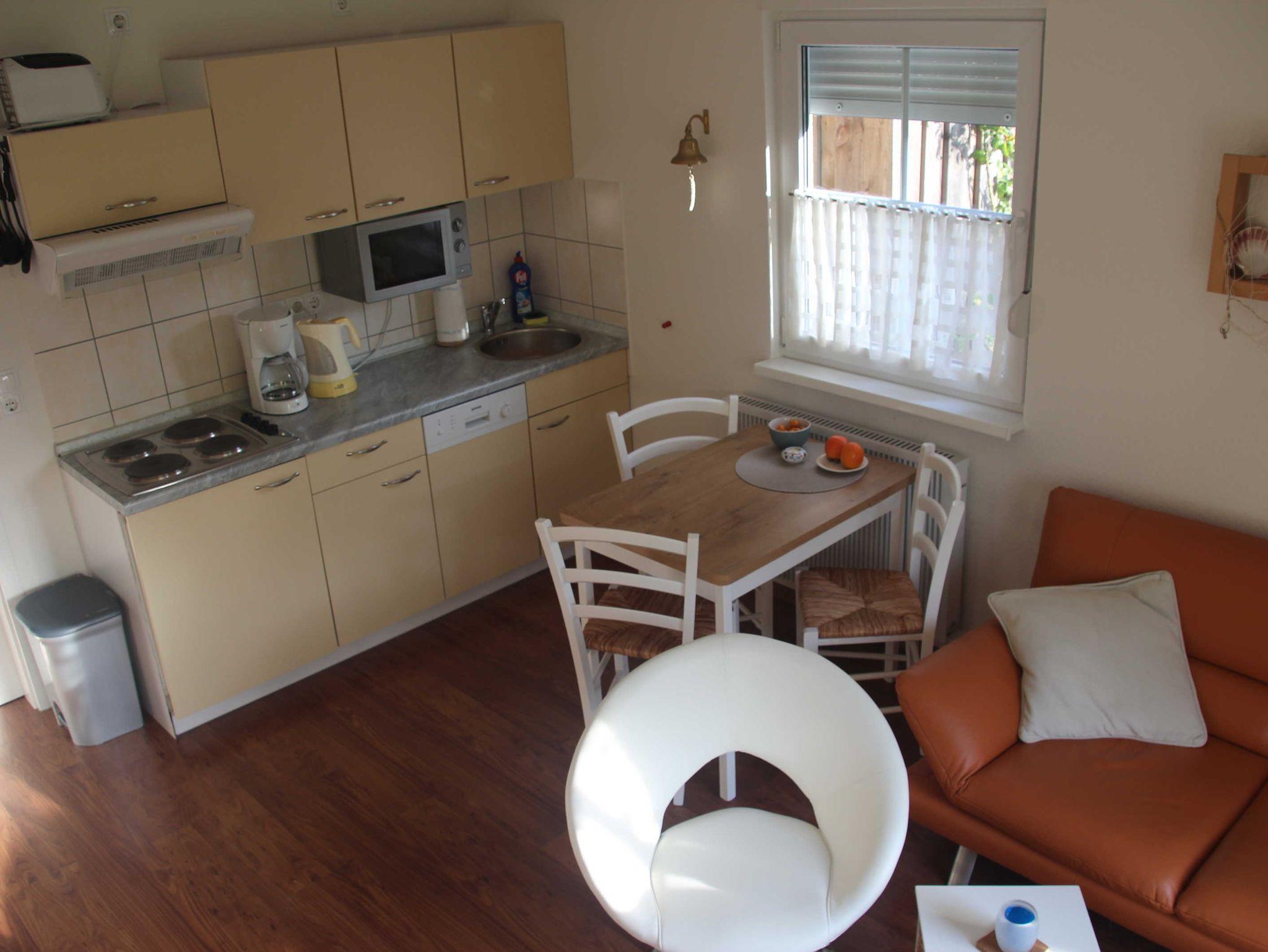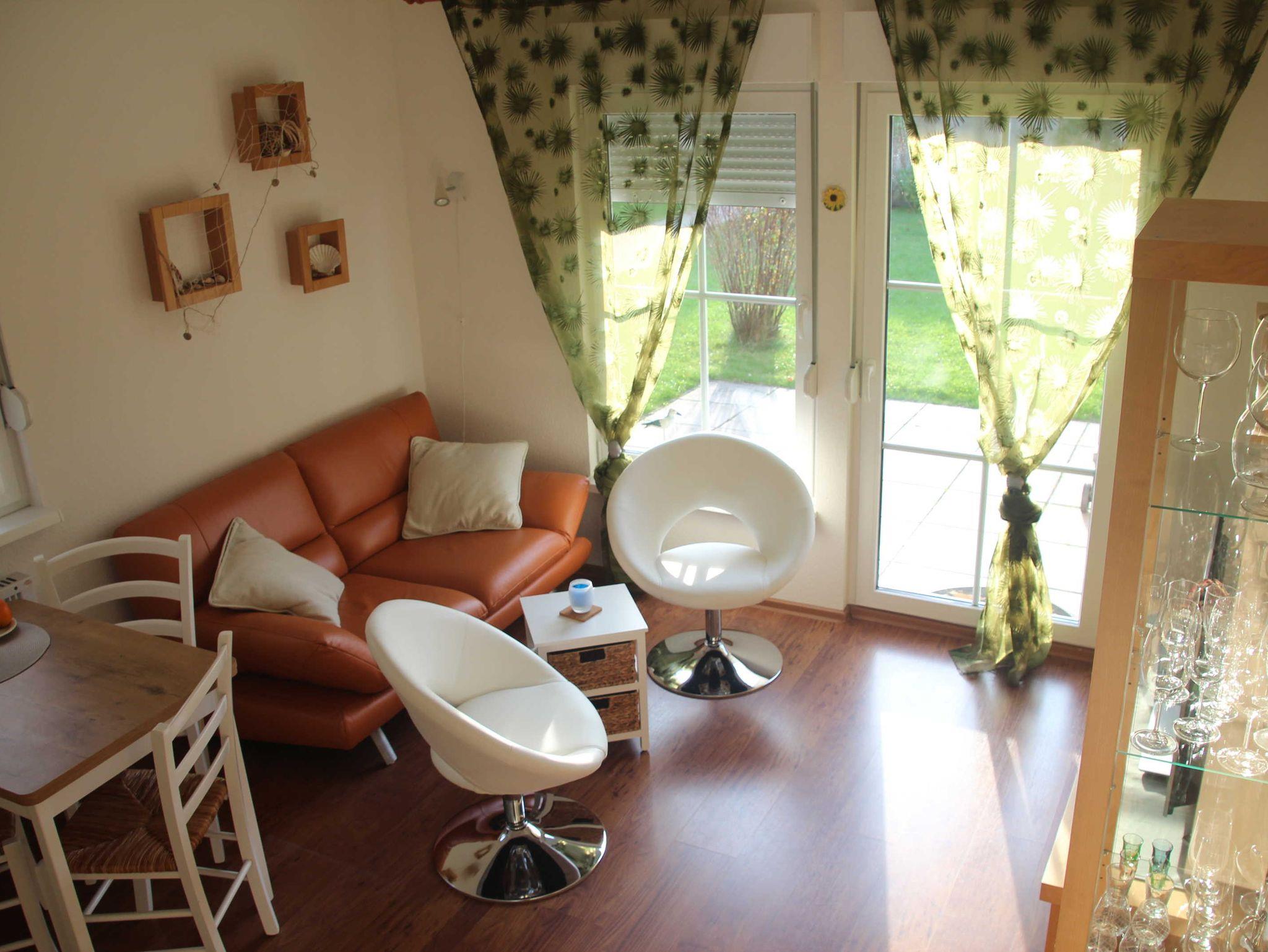 3-Zimmer Ferienwohnung im Erdgeschoss einer liebevoll angelegten Ferienanlage. Die Ferienwohnung ist im Wohnbereich ausgestattet mit einer gemütlichen Couch und einer offenen Küche mit Essbereich.