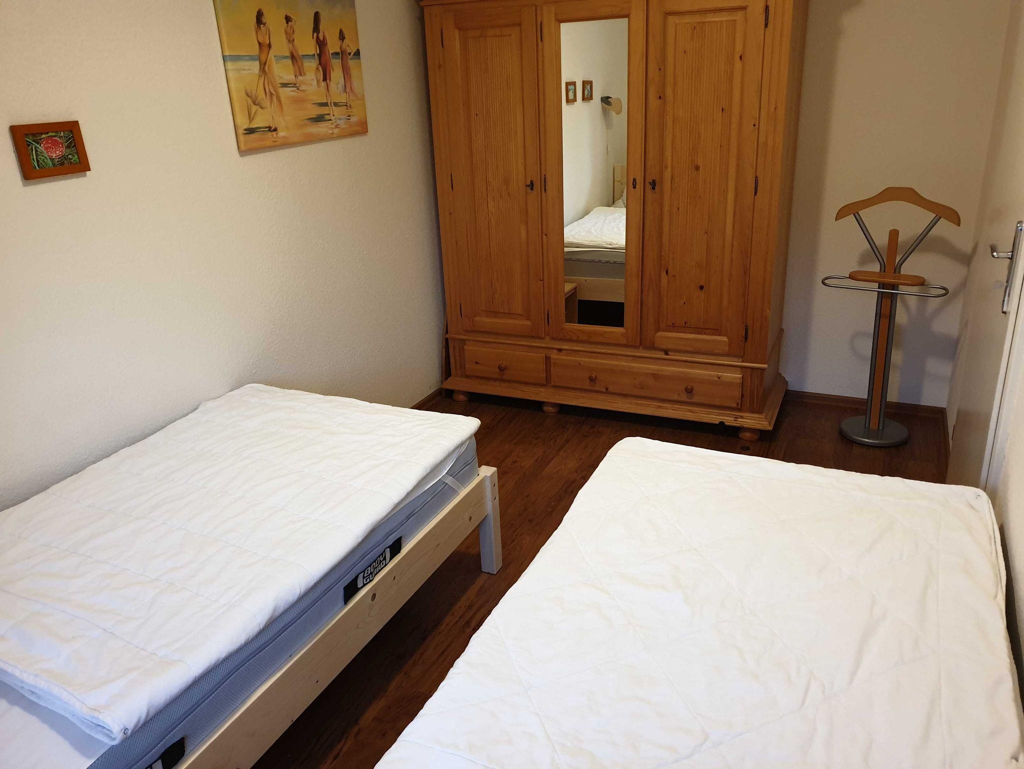 1 Schlafzimmer mit zwei Einzelbetten (lassen sich zu einem Doppelbett zusammenschieben) und Schrank