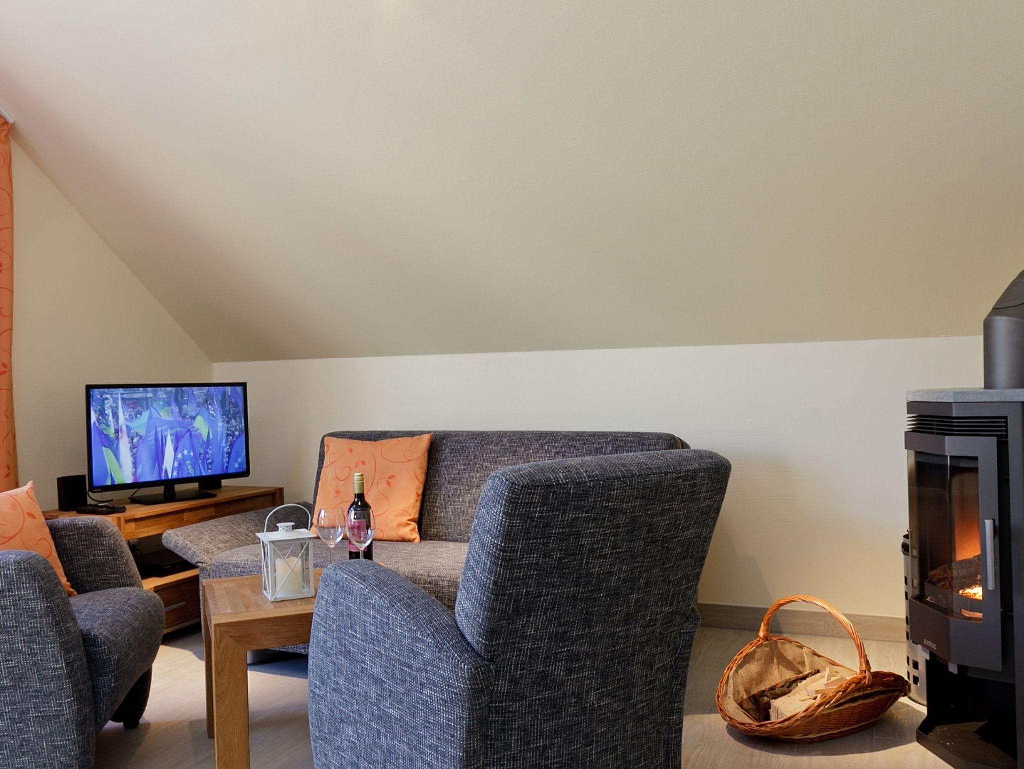 Ca. 50 m² im 2.OG für 2-4 Personen, 1 Schlafzimmer mit Qualitätsbett, 1 Schlafcouch im Wohnzimmer, Diele, Bad mit Wellnessdusche oder Whirlwanne, Wohnzimmer mit HDTV, BluRay und Kaminofen. Möblierter Balkon, freier WLAN Empfang, Safe. Empfohlene Belegung 2 Personen.