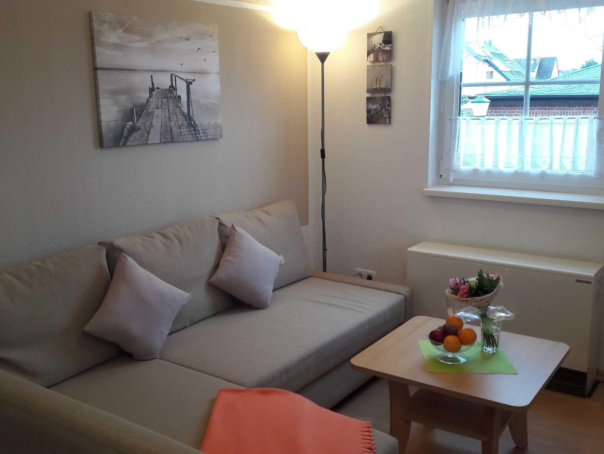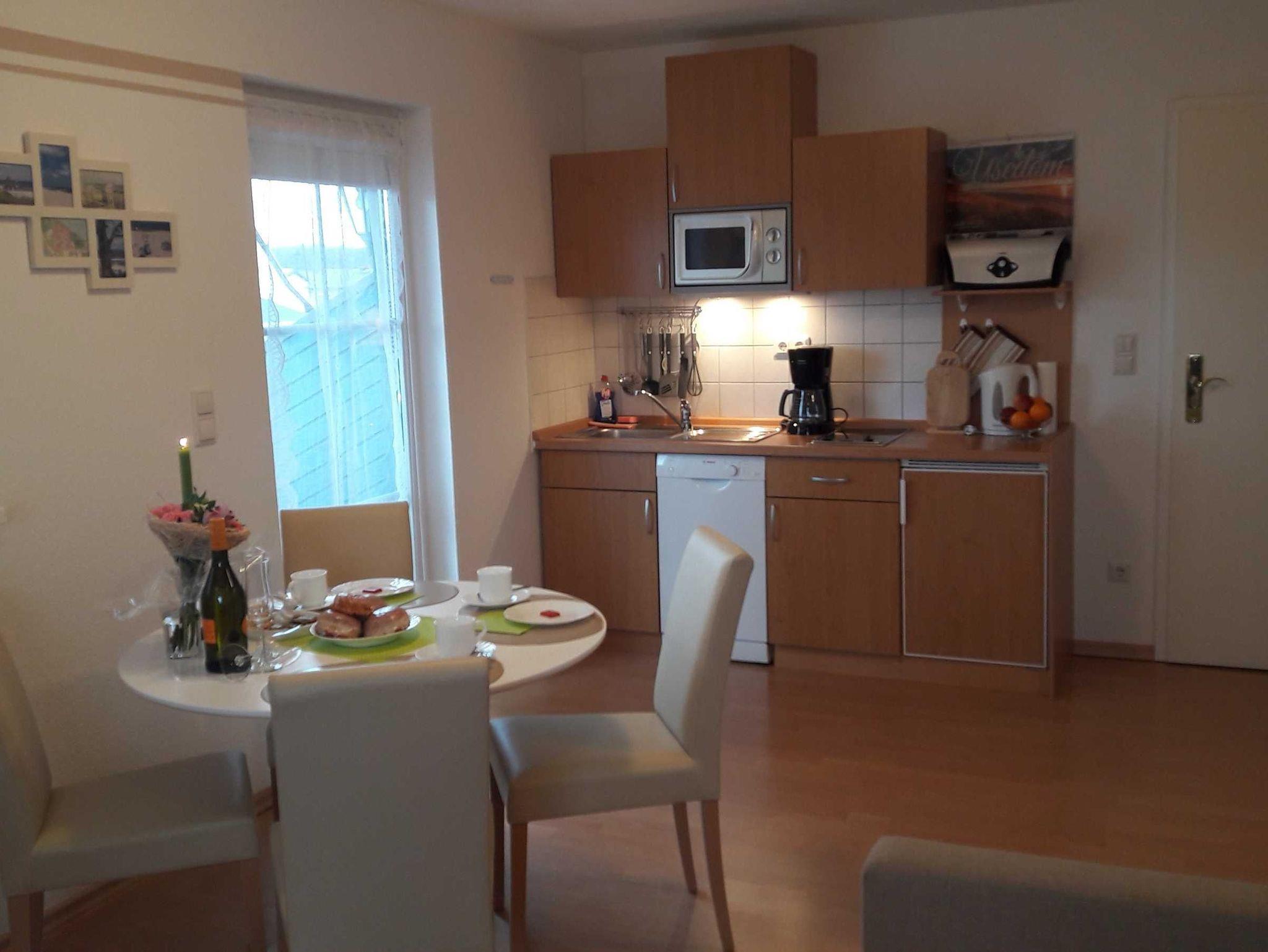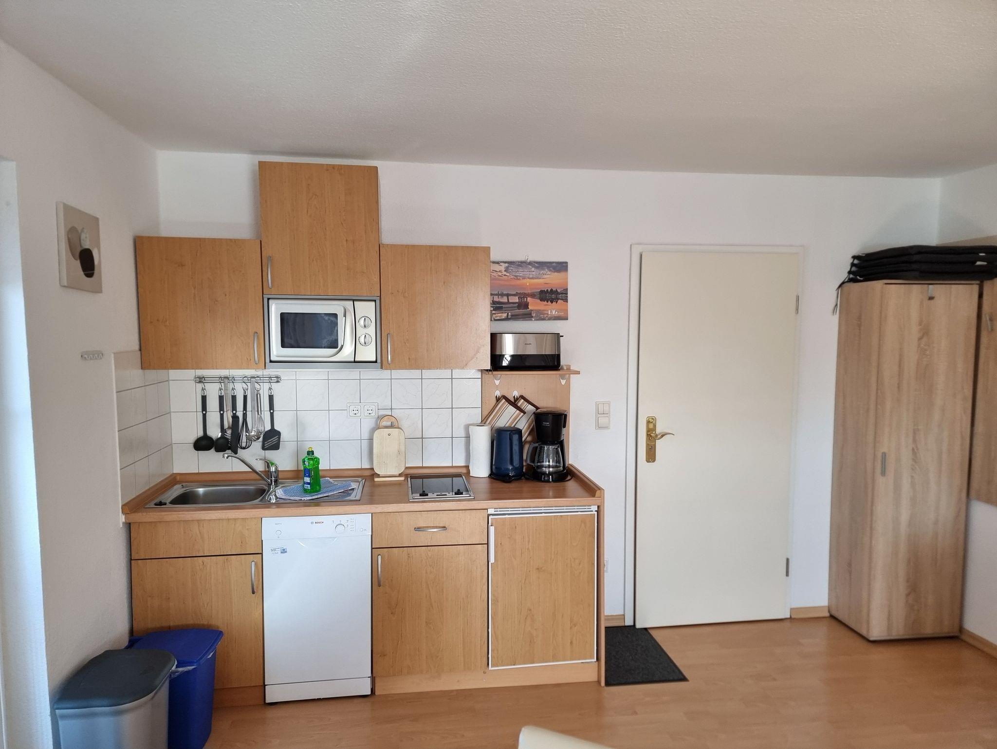 Schöne 2-Zimmer Ferienwohnung im 1. Obergeschoss einer freundlich angelegten Ferienanlage. Die Ferienwohnung ist im Wohnbereich ausgestattet mit einer gemütlichen ausziehbaren Eckcouch und einer offenen Küche mit Essbereich.