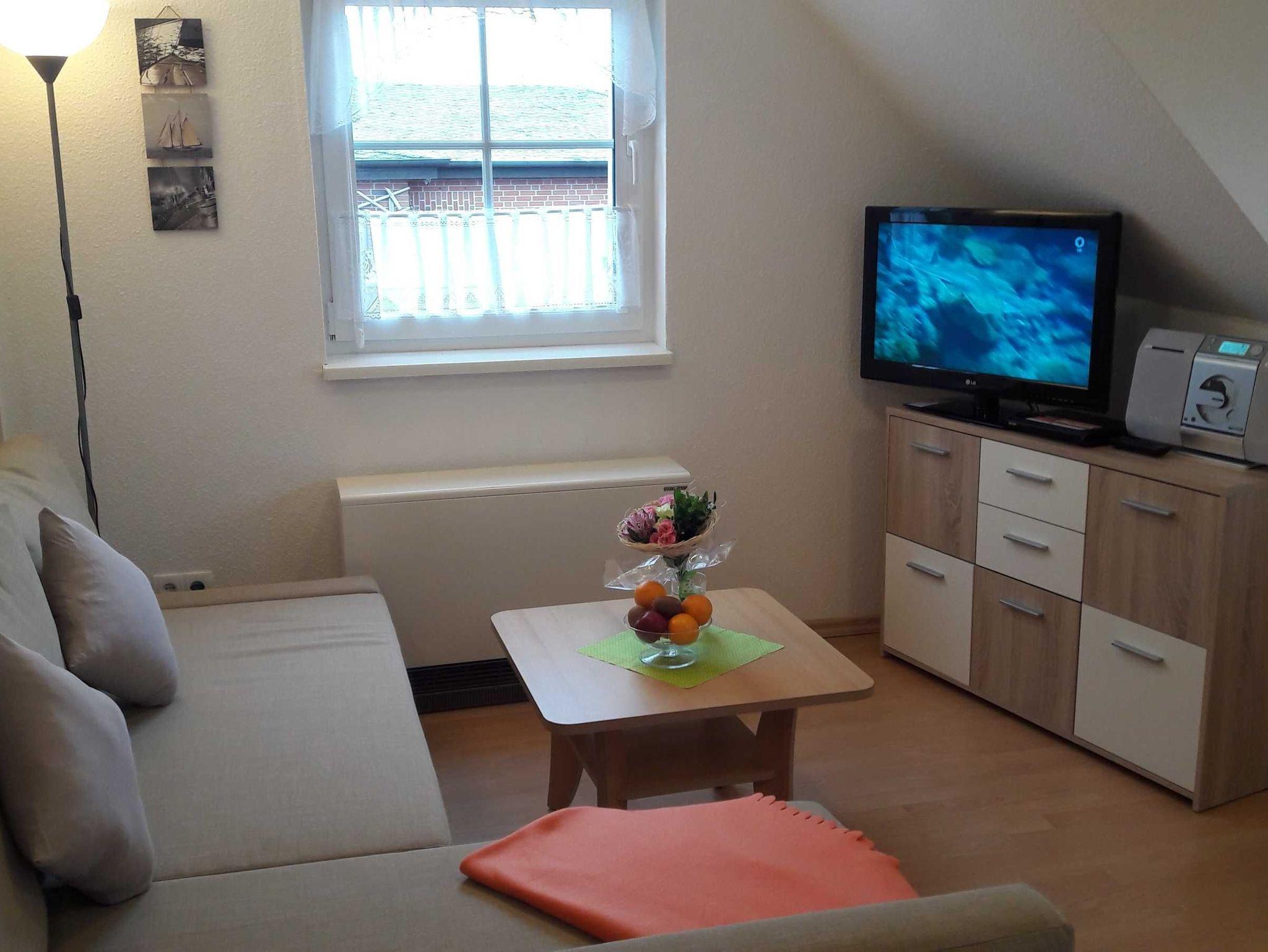 Wohnzimmer mit Flachbild-TV, DVD Player und Radio.