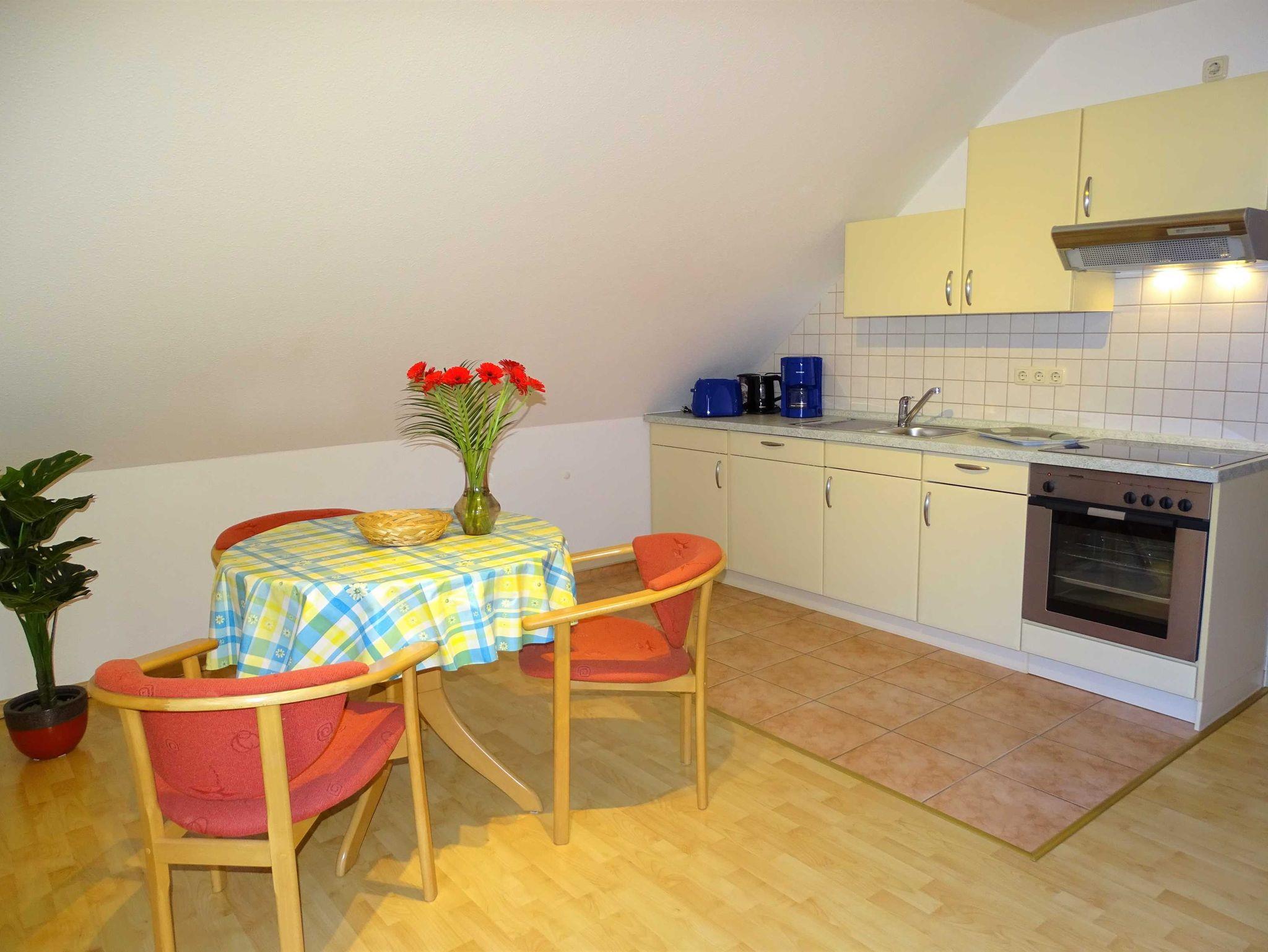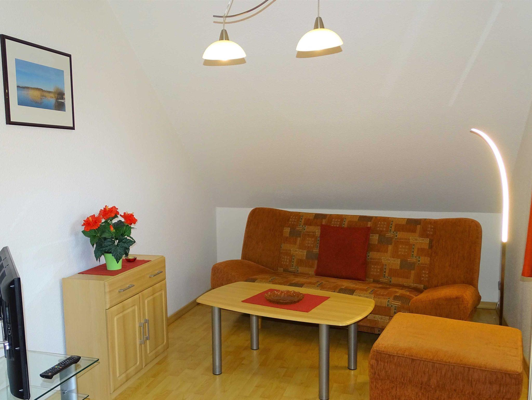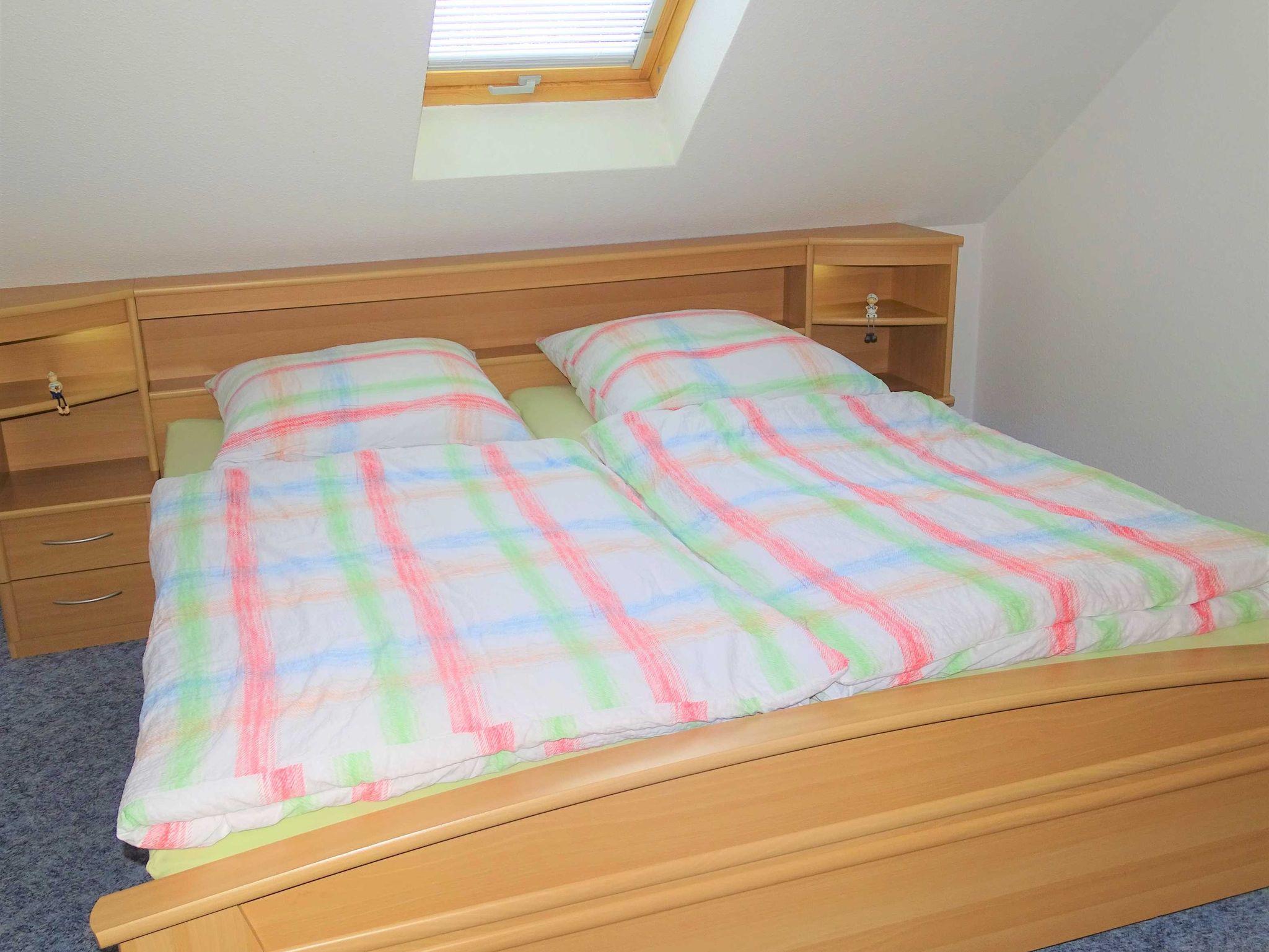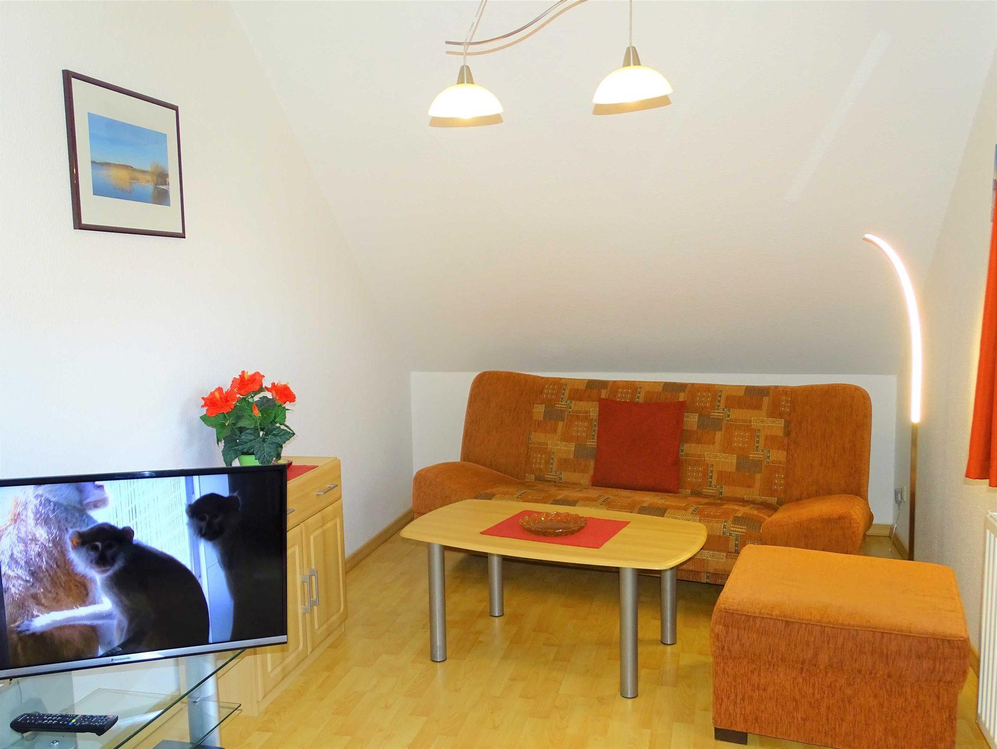 Die gemütlich eingerichtete Ferienwohnung liegt im ersten Stock des Ferienhauses mit vier Partien. Das großzügige Wohnzimmer mit Küchenzeile und Essecke lädt zum Verweilen ein. Von hier aus betreten Sie den Balkon, auf dem Sie den Abend in Ruhe ausklingen lassen können. Im Schlafzimmer befindet sich ein Doppelbett. Die Couch im Wohnzimmer kann für die dritte Person ausgeklappt werden. Die Erstausstattung Bettwäsche ist inklusive, Handtücher können Sie für 5,00 Euro/Person dazu buchen.