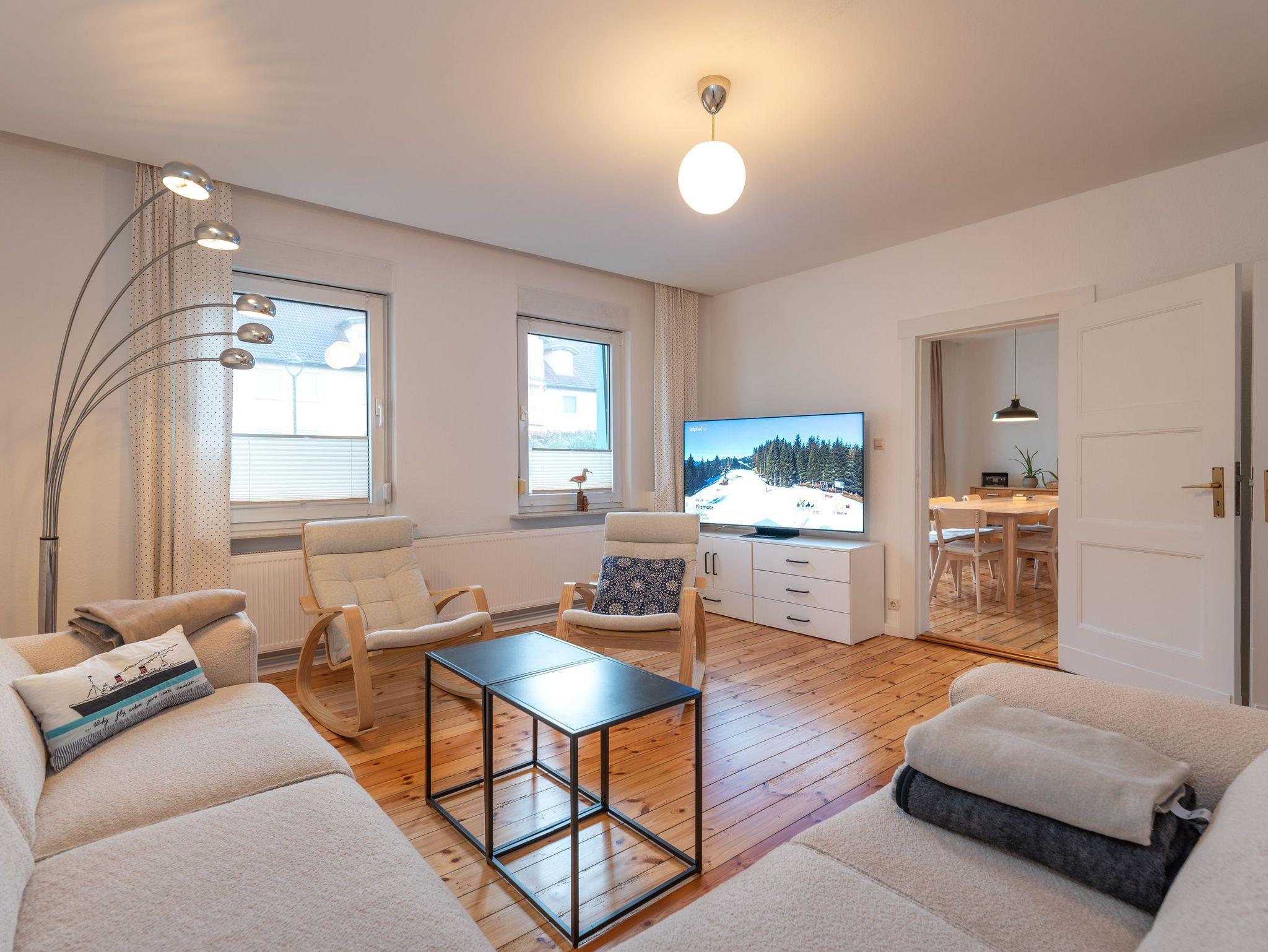 • großes Wohnzimmer mit Couch, Sesseln und Smart-TV