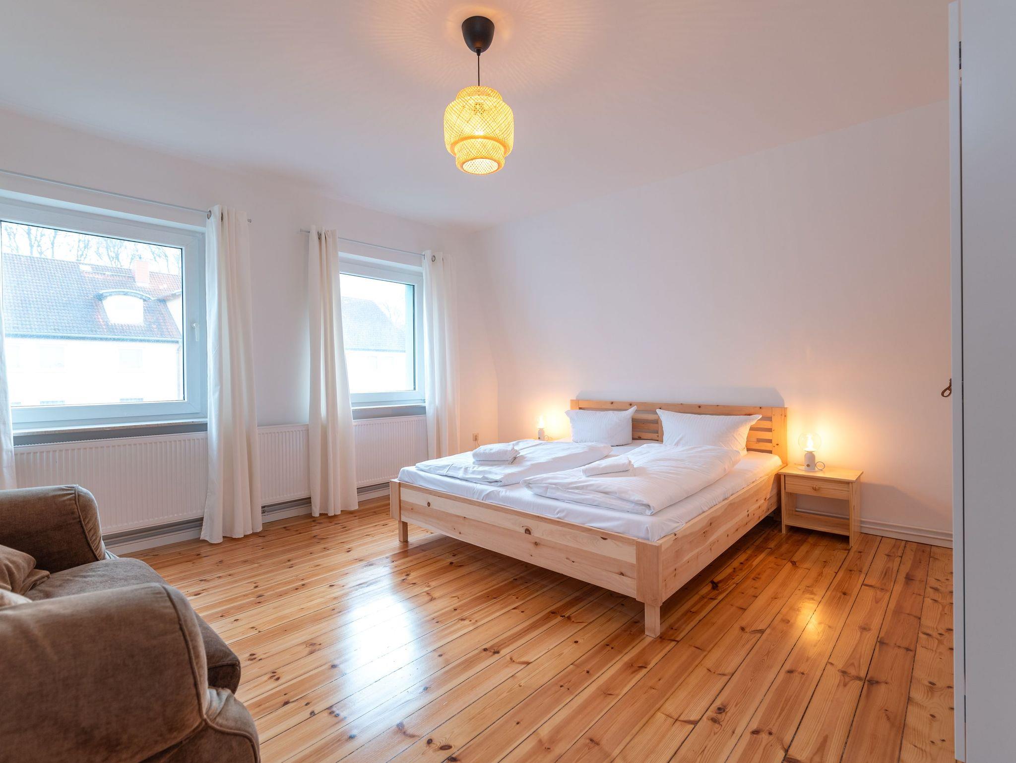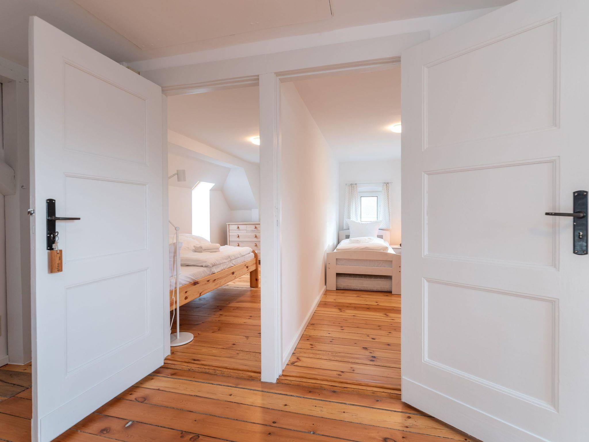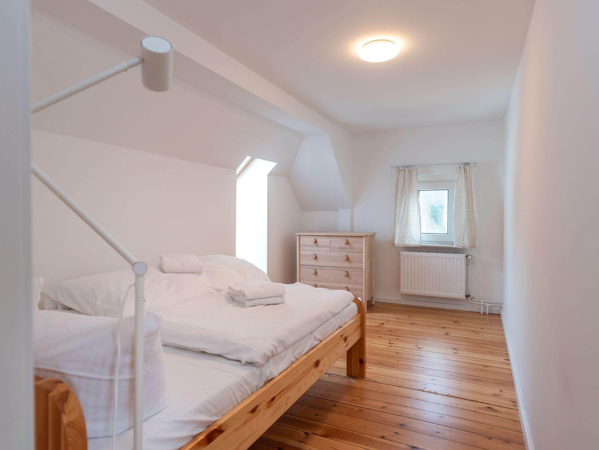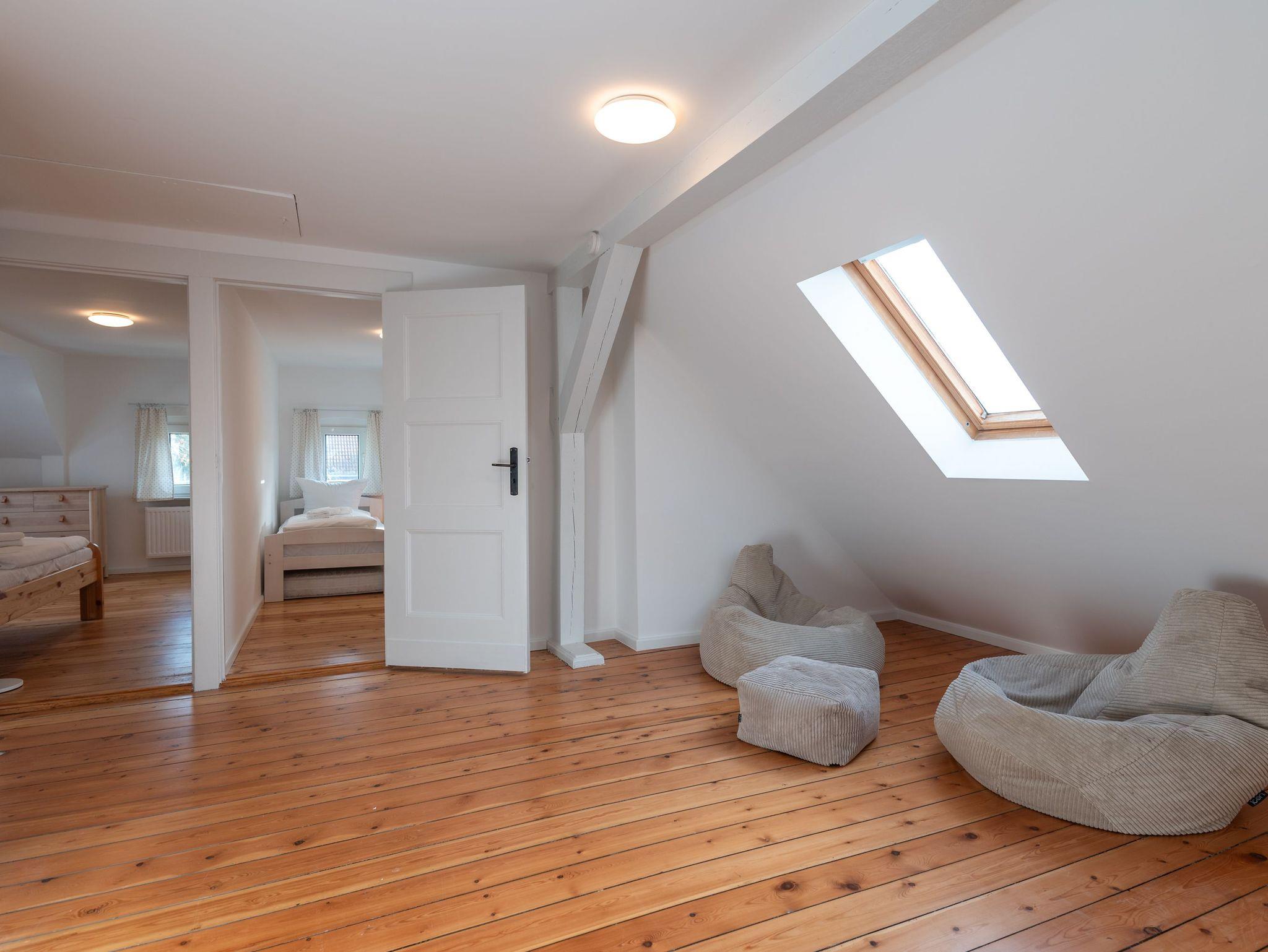 Die obere Etage hält einen Aufenthaltsraum bereit, ein Schlafzimmer mit einem Doppelbett (1,40m) sowie ein Schlafzimmer mit zwei Einzelbetten, ergänzt durch ein zusätzliches Gäste-WC, was die räumliche Flexibilität des Hauses unterstreicht.