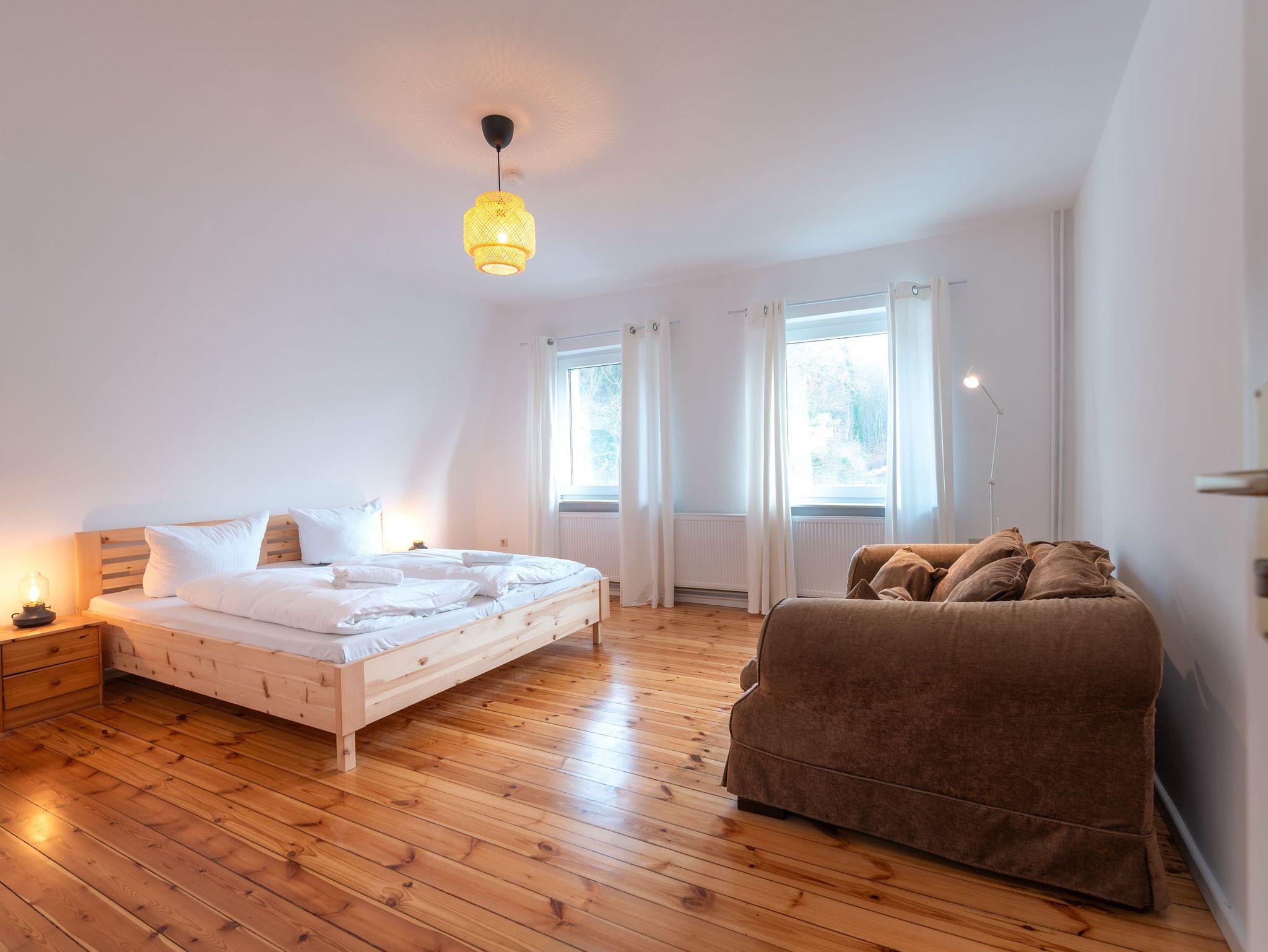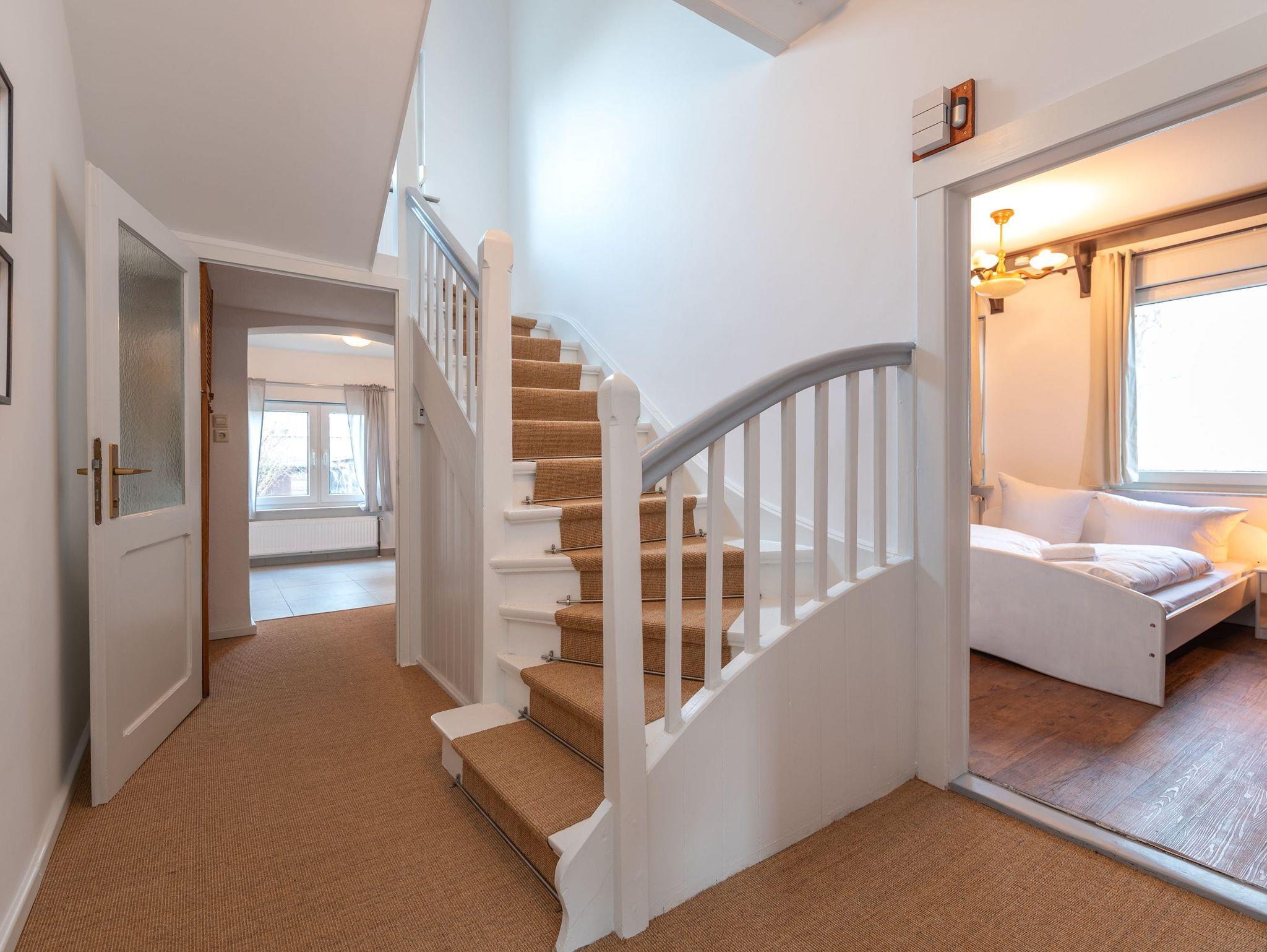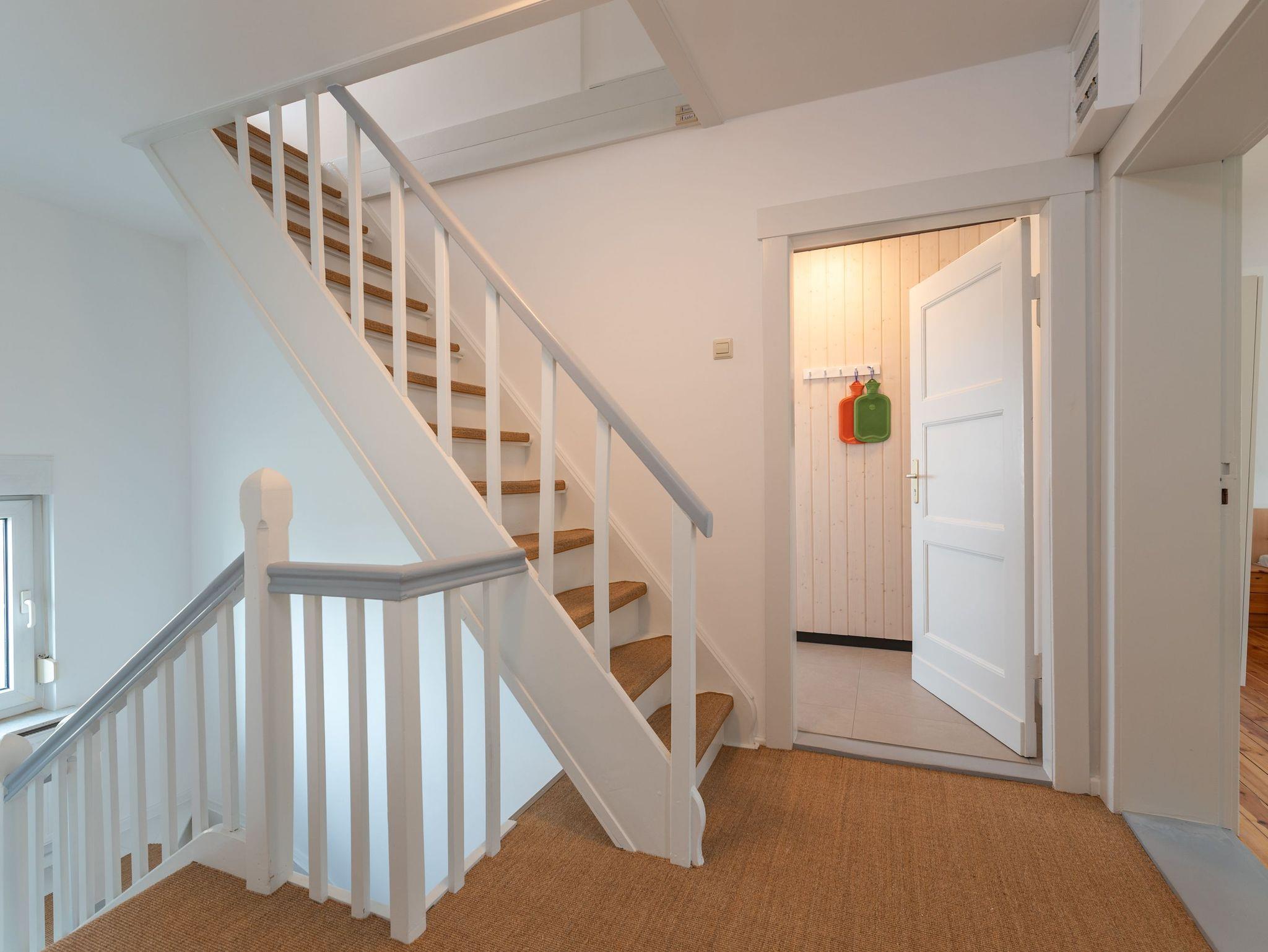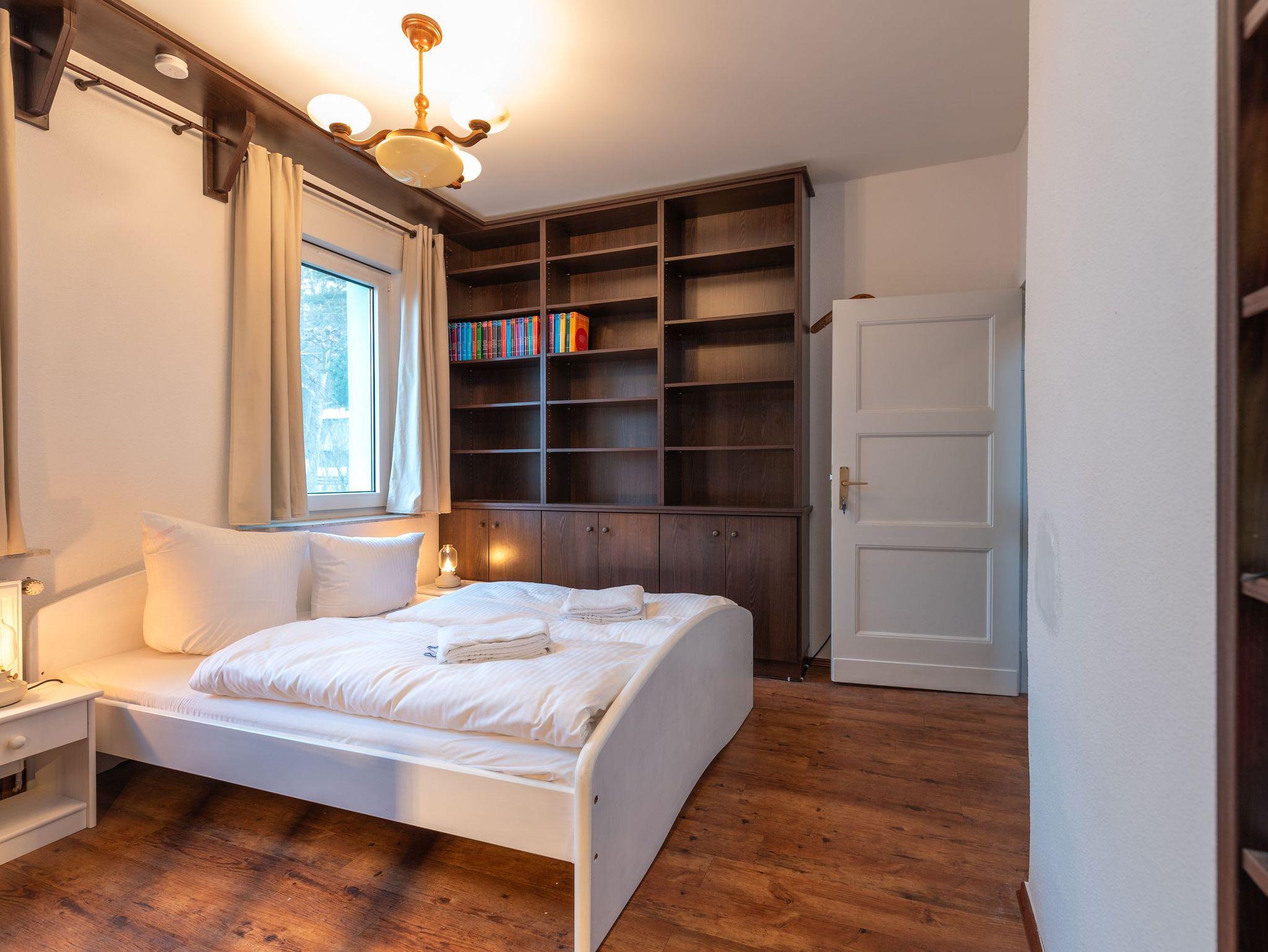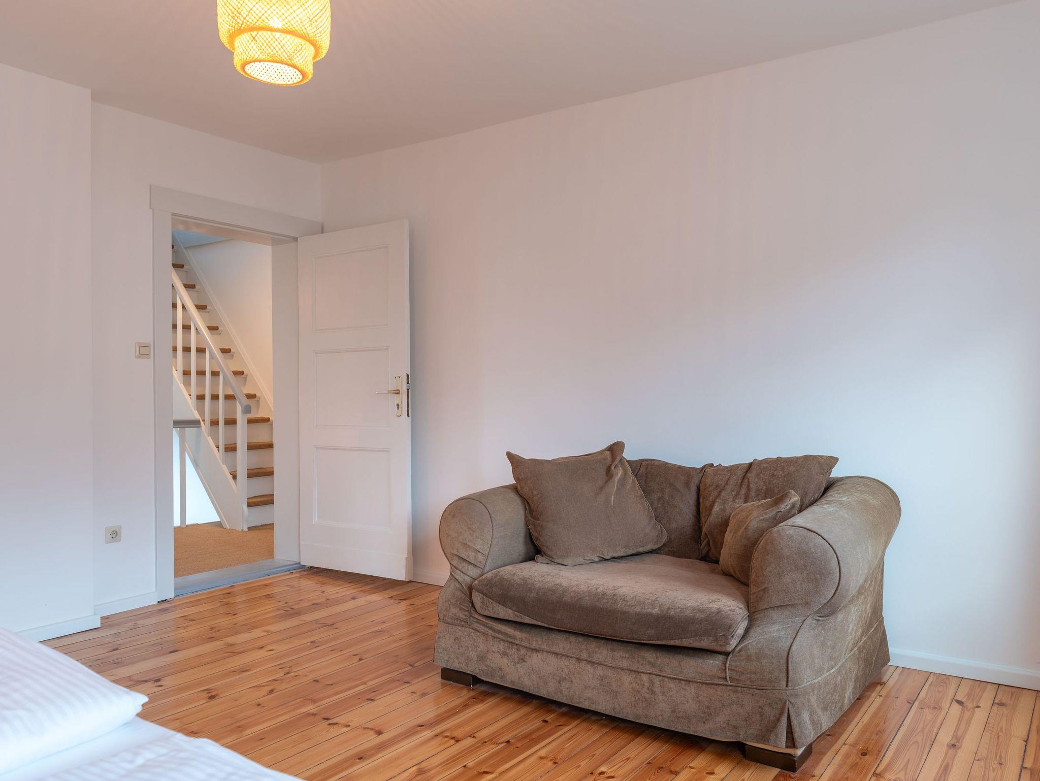 Die obere Etage hält einen Aufenthaltsraum bereit, ein Schlafzimmer mit einem Doppelbett (1,40m) sowie ein Schlafzimmer mit zwei Einzelbetten, ergänzt durch ein zusätzliches Gäste-WC, was die räumliche Flexibilität des Hauses unterstreicht.
