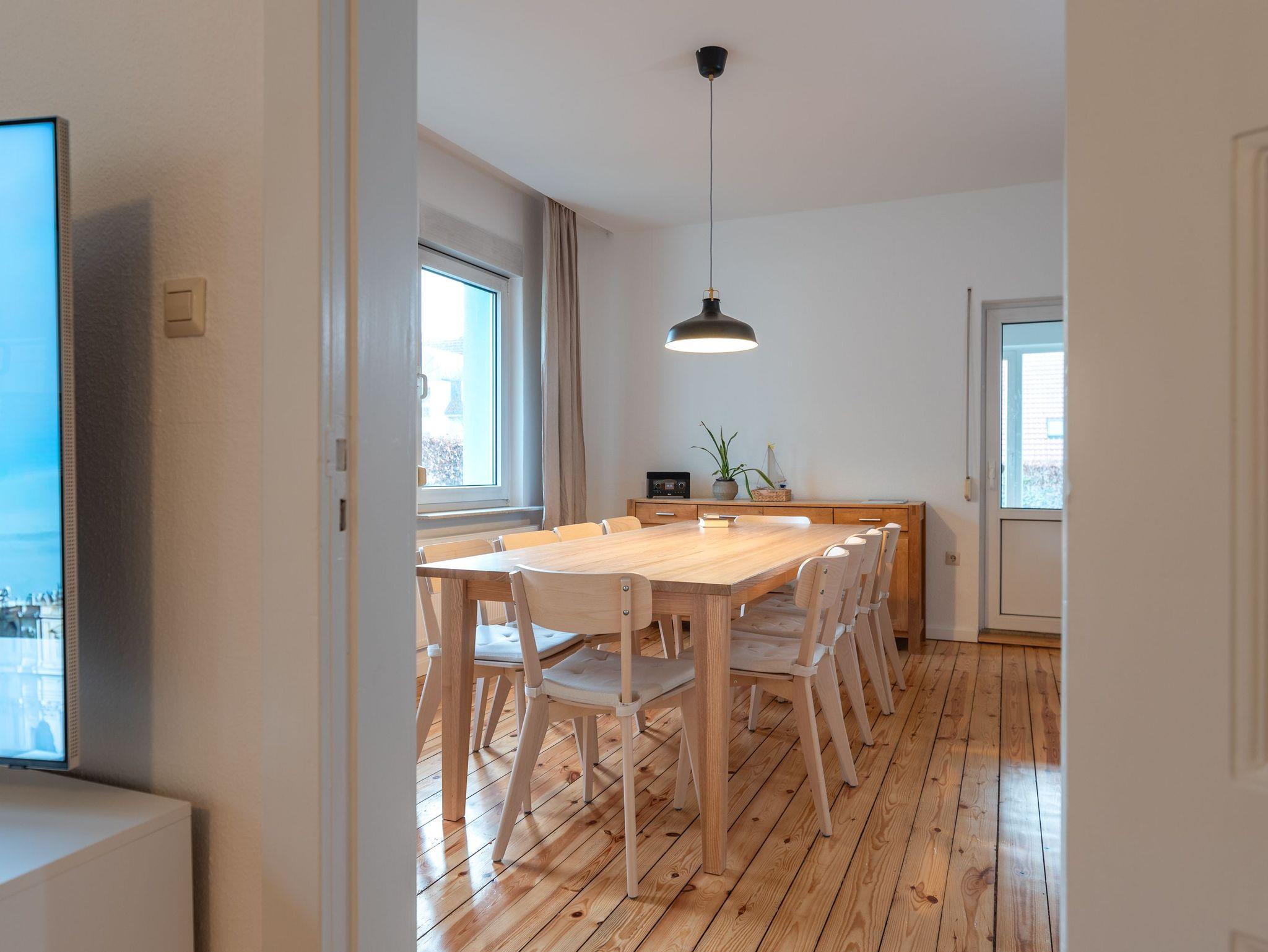 • Esszimmer mit großem Tisch für 12 Personen und Kamin