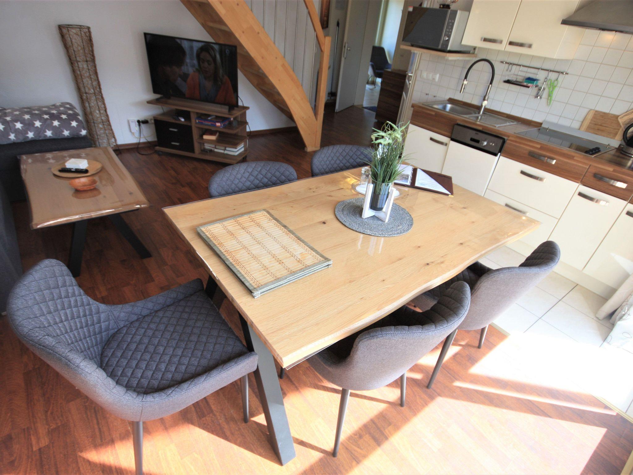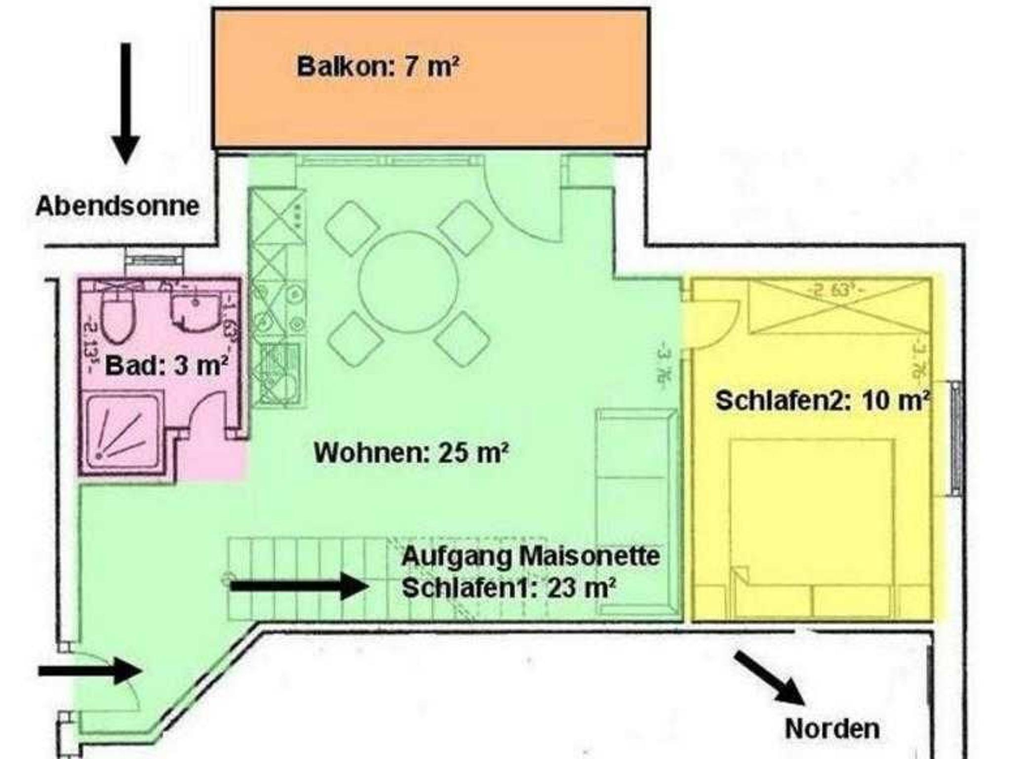 Die Ferienwohnung liegt im Obergeschoß des Ferienhauses rechts hinten. Sie besteht aus Wohnzimmer, kompl. ausgestatteter Küche, Balkon mit Sitzmöbeln, Schlafzimmer und Tageslichtbad. Neben zwei Schlafzimmern mit Doppelbetten steht im Maisonette-Schlafzimmer noch ein drittes Bett zur Verfügung.