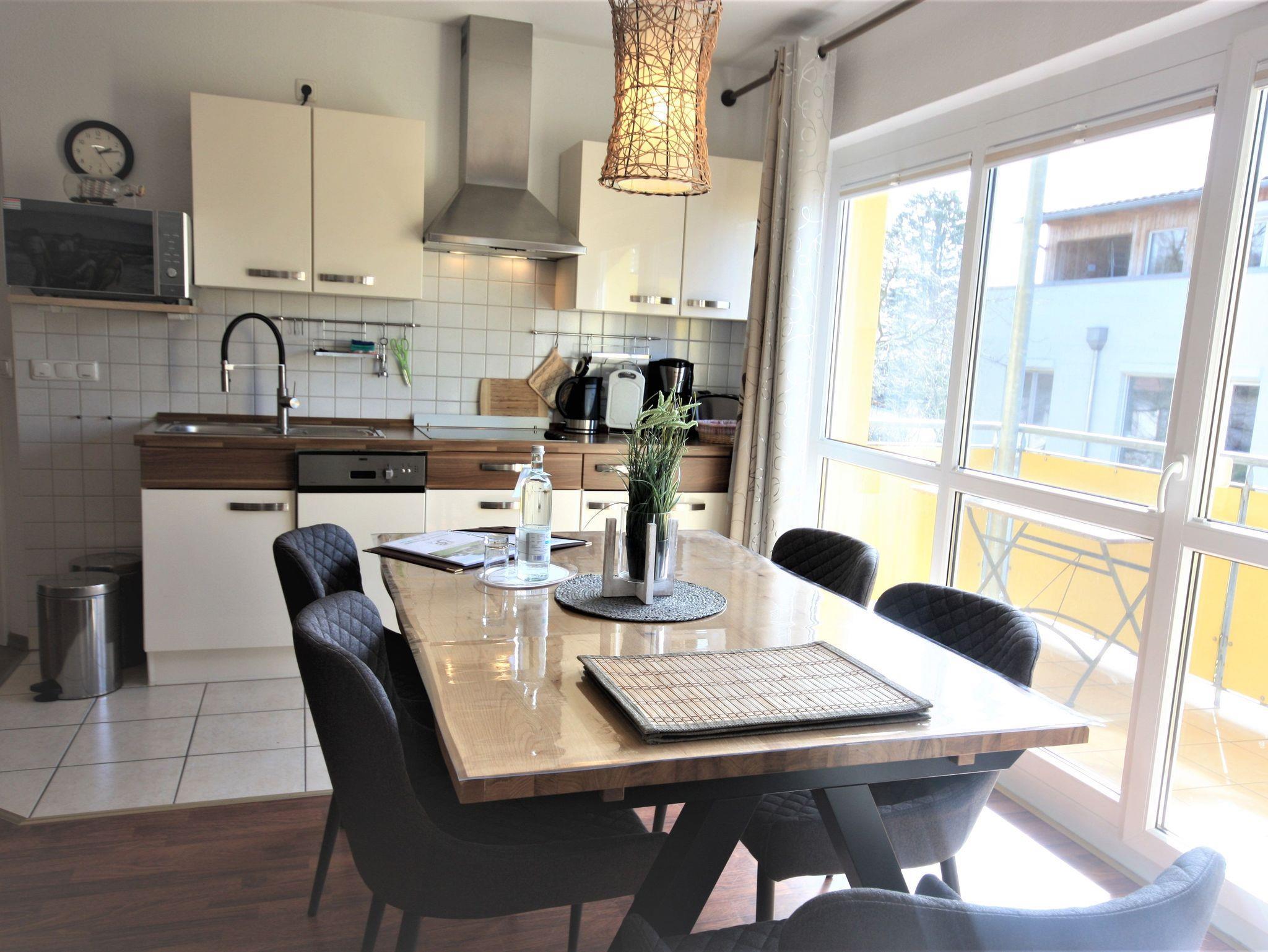 Die Ausstattung der creme-wallnussfarbigen Hochglanzeinbauküche ist neuwertig funktional und qualitativ hochwertig unter anderem mit Toaster, Kaffeemaschine, Mikrowelle mit Grill, Ceran-Kochfeld, Geschirrspüler, Gefrierfach. Großer Süd-West-Balkon mit Blick auf das Achterwasser und auf den Sonnenuntergang, Grill.