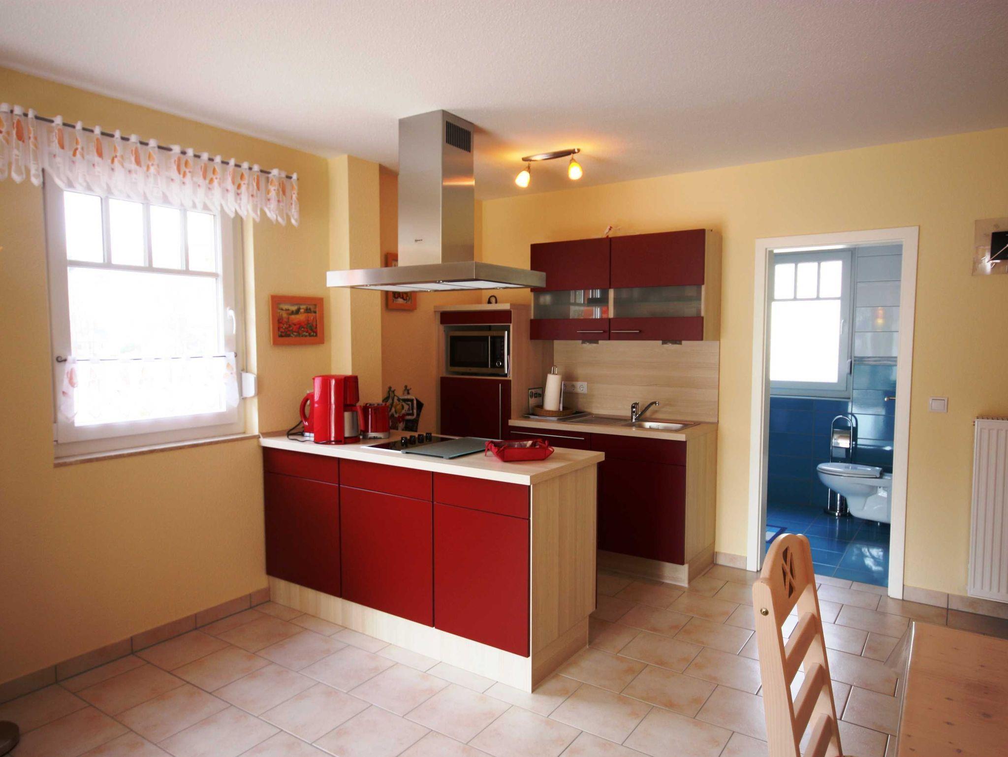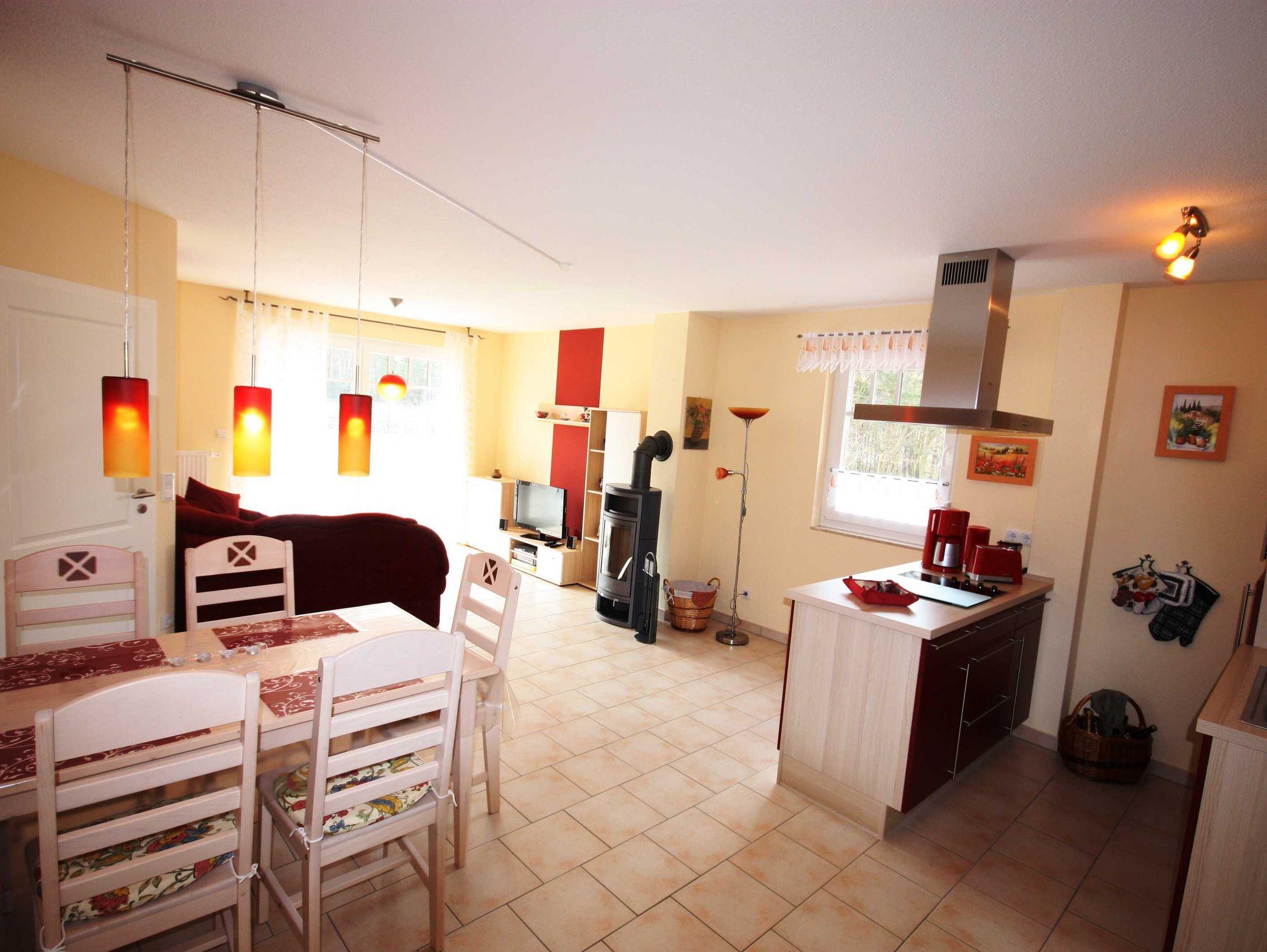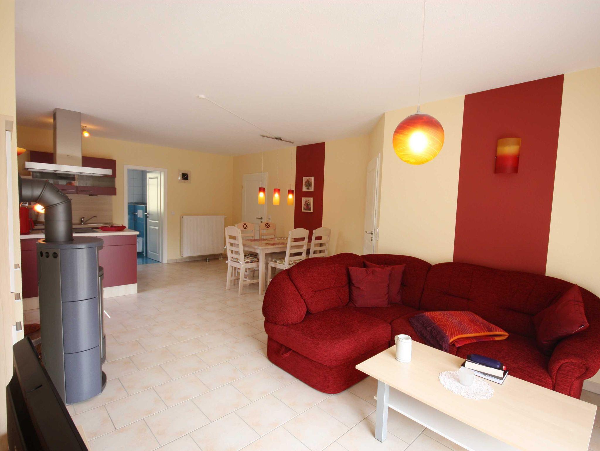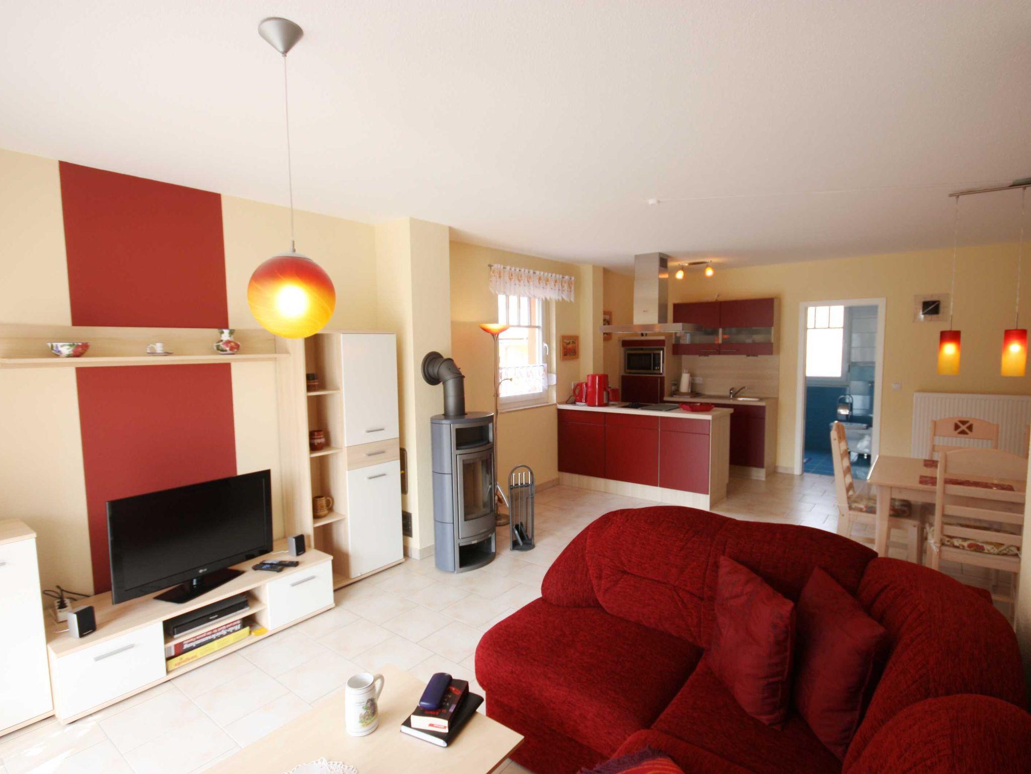 Die Ferienwohnung liegt im Erdgeschoß des Ferienhauses. Sie besteht aus Wohnzimmer, kompl. ausgestatteter Küche, Schlafzimmer und Tageslichtbad. Die Ausstattung der bordeauxfarbenen Einbauküche ist neuwertig funktional und qualitativ hochwertig unter anderem mit Toaster, Kaffeemaschine, Mikrowelle mit Grill, Kochfeld, Geschirrspüler, Gefrierfach. Große Süd-Terrasse mit Blick auf den Küstenwald, große Spielwiese. Diese Ferienwohnung ist mit einem Echtholzkamin ausgestattet.