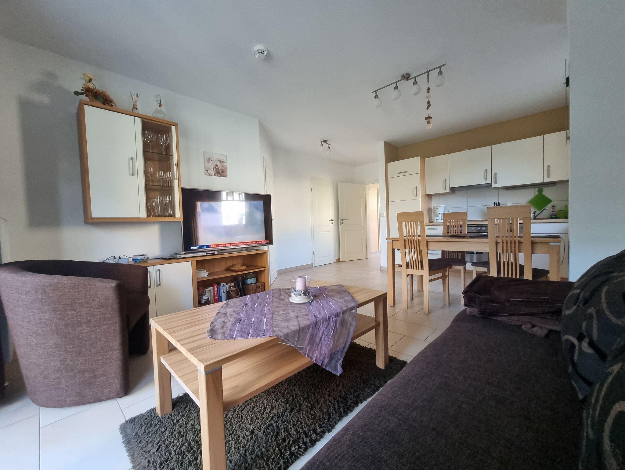 Die Wohnung verfügt über ein Schlafzimmer mit Doppelbett und ein Schlafzimmer mit 2 Einzelbetten. Die Ferienwohnung liegt im 1. Geschoß des Ferienhauses. Sie besteht aus Wohnzimmer, kompl. ausgestatteter Küche, Schlafzimmer und Tageslichtbad. Die Ausstattung der Einbauküche ist neuwertig funktional und qualitativ hochwertig unter anderem mit Toaster, Kaffeemaschine, Backofen mit Heißluft, Kochfeld, Geschirrspüler, Gefrierfach. Großer Südbalkon mit Blick auf den Küstenwald, große Spielwiese.