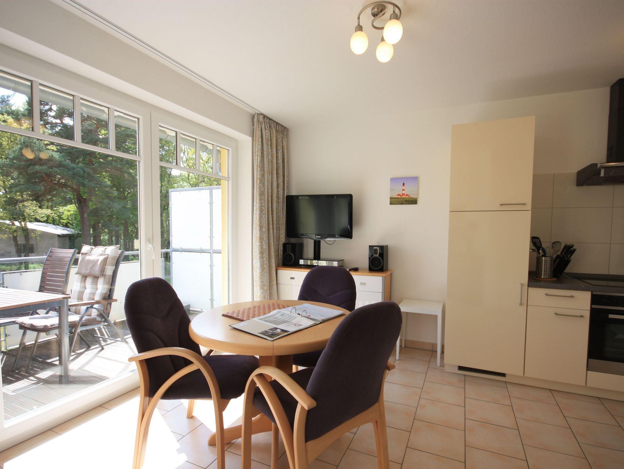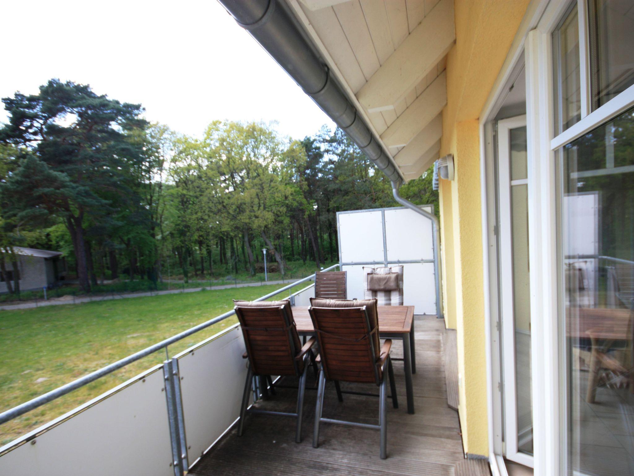 Moderne Ferienwohnung im Ferienpark Streckelsberg mit Südbalkon, Blick auf Küstenwald und Nähe zum Ostseestrand.