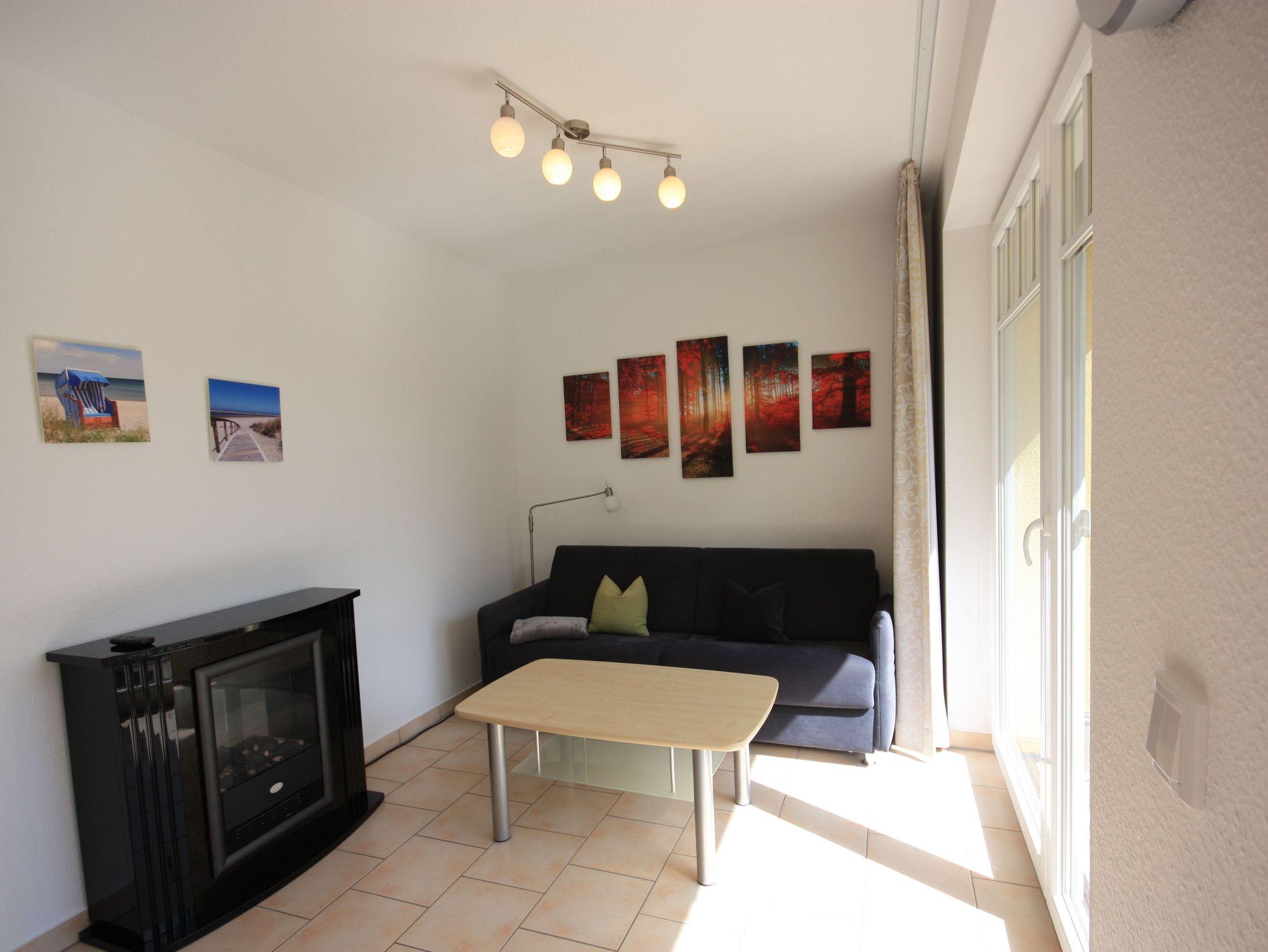• 1 Wohnzimmer mit offener Küche, Eßtisch, Couchecke, Elektrokamin