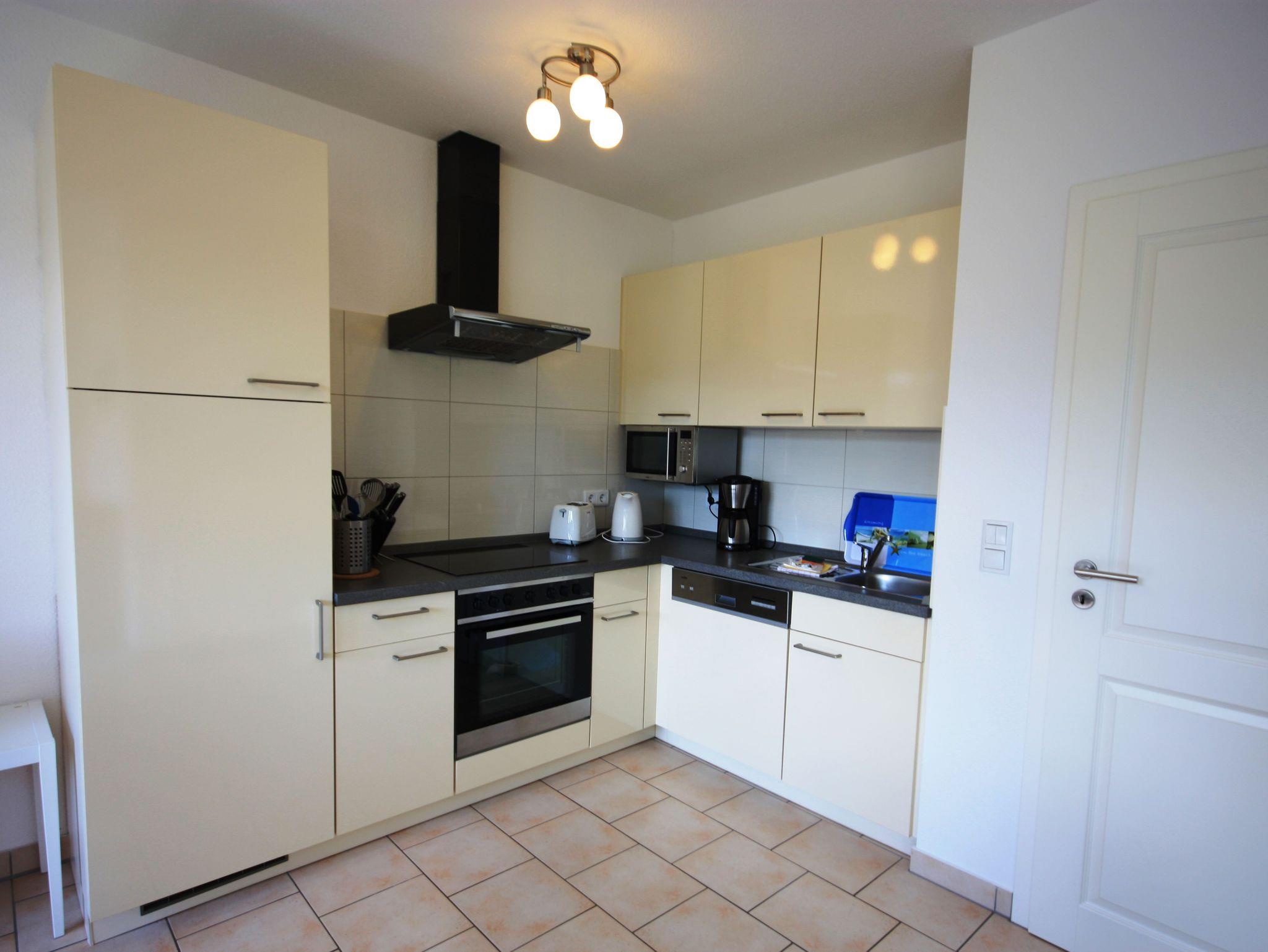 Die Ferienwohnung liegt im Obergeschoß des Ferienhauses. Sie besteht aus Wohnzimmer, kompl. ausgestatteter Küche, Schlafzimmer und Tageslichtbad. Die Ausstattung der Einbauküche ist neuwertig funktional und qualitativ hochwertig unter anderem mit Toaster, Kaffeemaschine, Backofen, Kochfeld, Geschirrspüler, Gefrierfach. Großer Südbalkon mit Blick auf den Küstenwald, große Spielwiese, Grillplatz