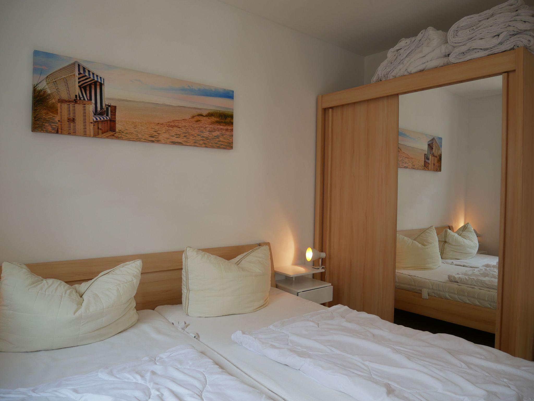 Das Schlafzimmer ist mit einen Doppelbett (200x180 cm) und Kleiderschrank, das Badezimmer mit Dusche und WC ausgestattet.