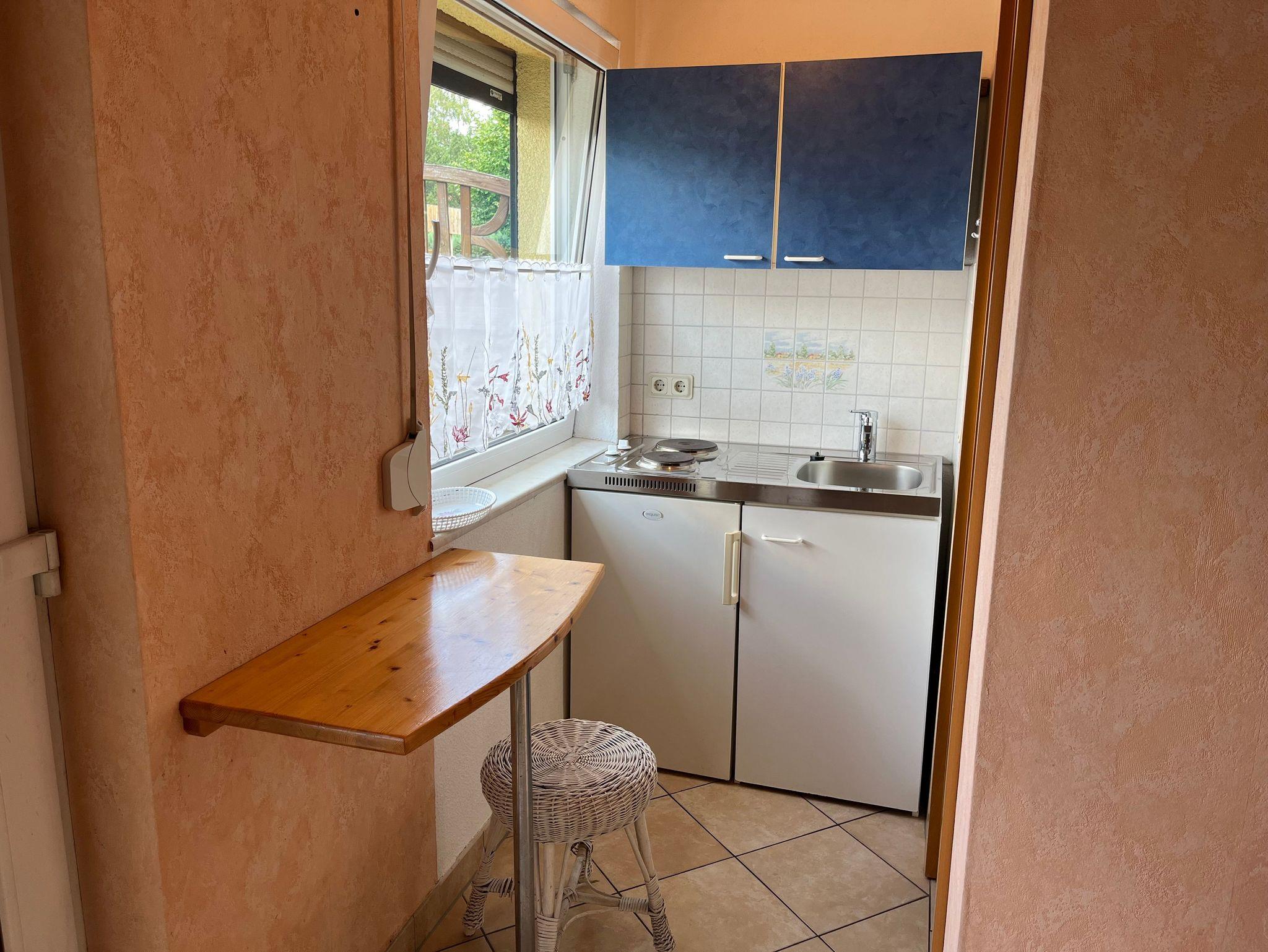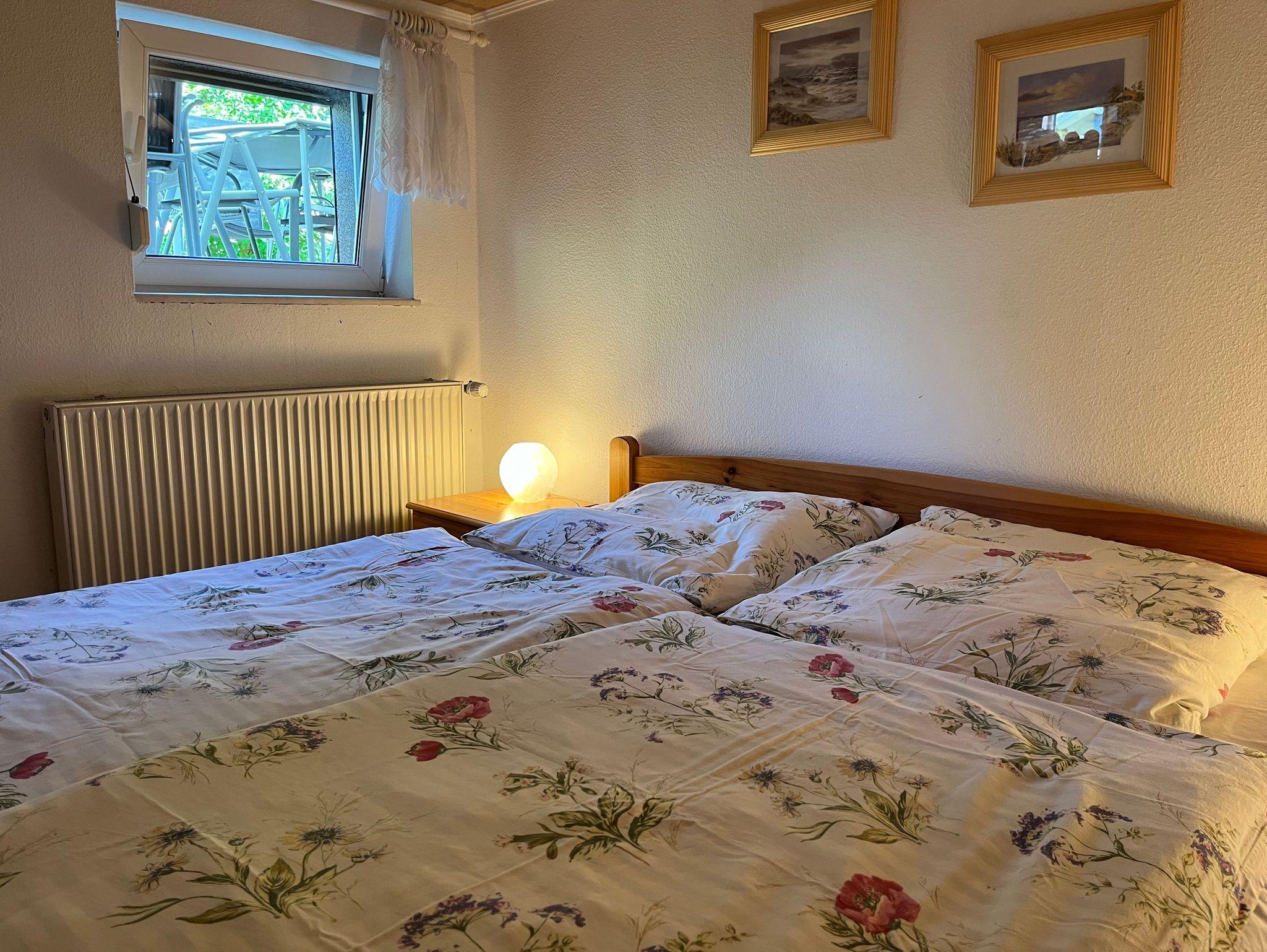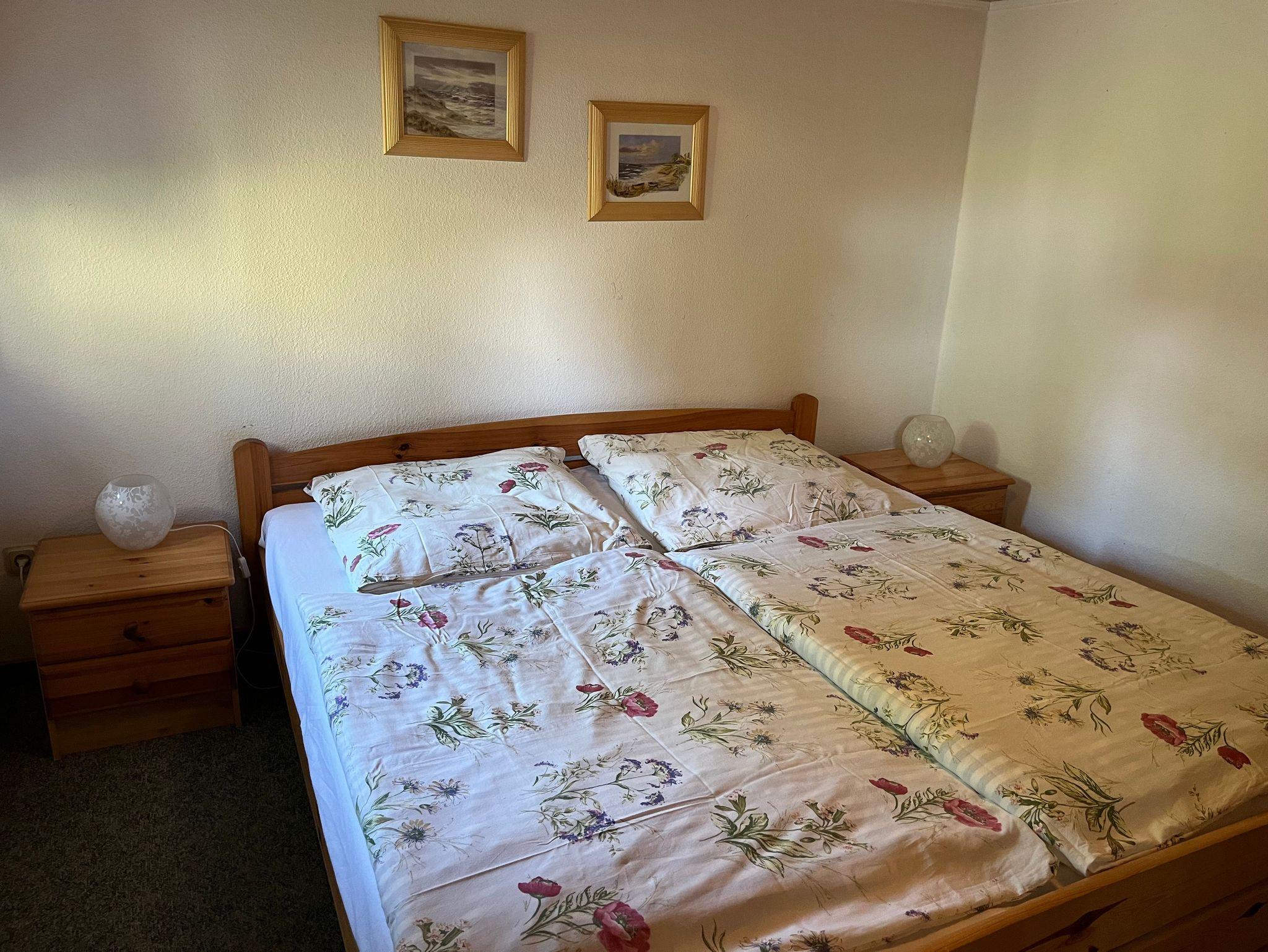 3-Raum-Ferienwohnung im Erdgeschoß, einfach und zweckmäßig eingerichtet. Wohnzimmer mit kleine Kochnische mit 2-Plattenherd, Kühlschrank, Toaster, Mikrowelle, Wasserkocher und Kaffeemaschine. 1 Schlafzimmer mit Doppelbett, 1 Schlafzimmer im Souterrain mit Doppelbett.