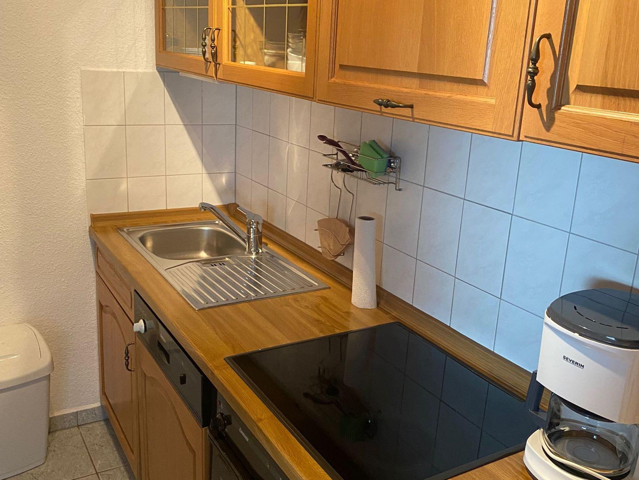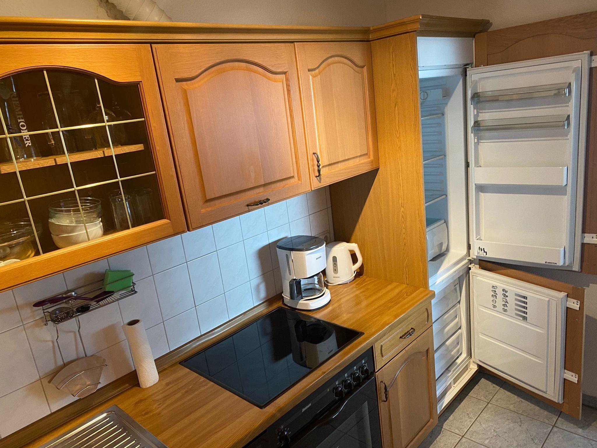 Die Küche ist vollständig ausgestattet mit einem Herd inklusive Cerankochfeld und Backofen, einem Kühlschrank mit Tiefkühlfach sowie einer Kaffeemaschine, einem Toaster und einem Wasserkocher.