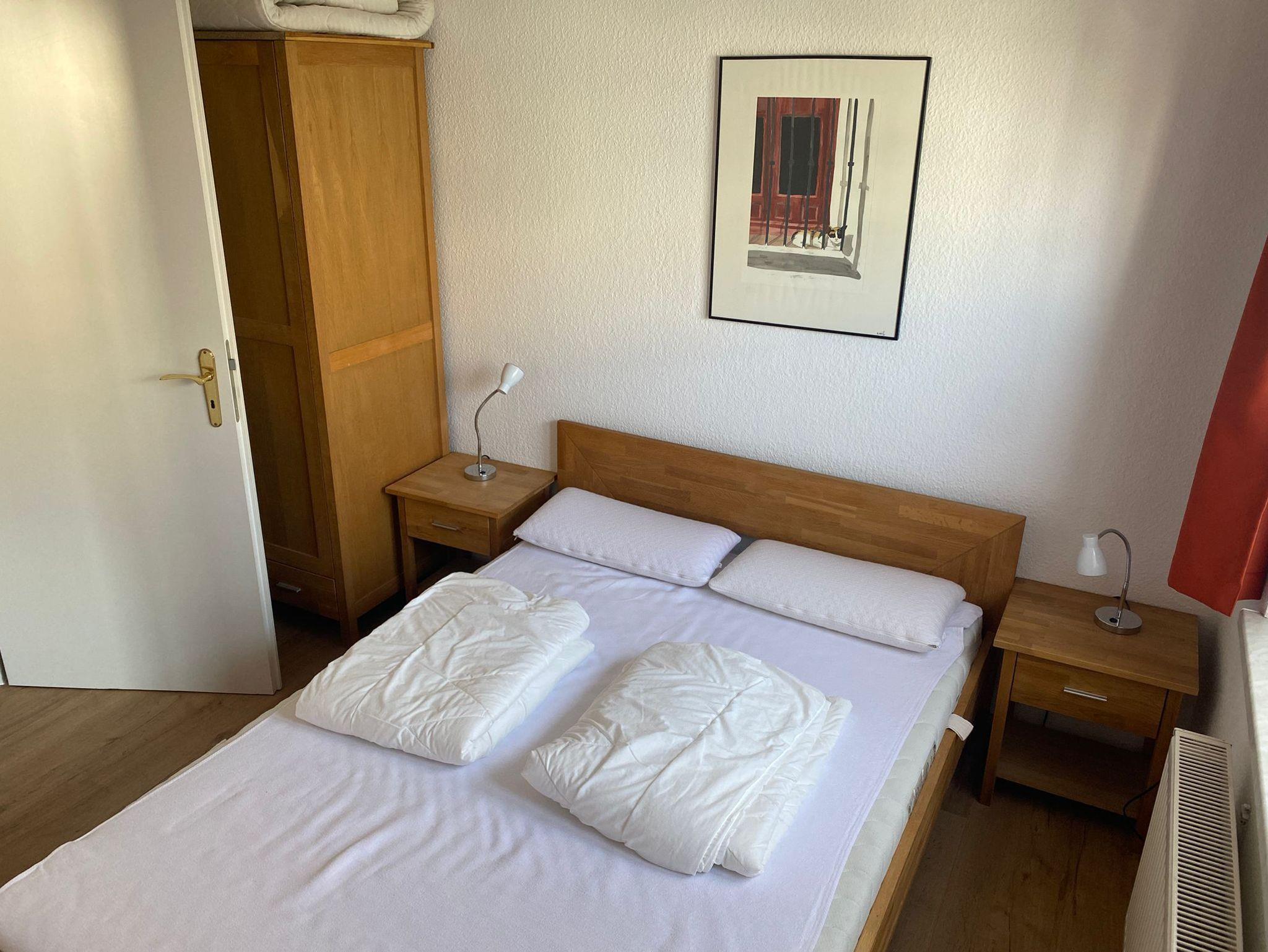 Im Schlafzimmer steht ein komfortables Doppelbett bereit, begleitet von einem Kleiderschrank und zwei Nachttischen mit Nachttischlampen.