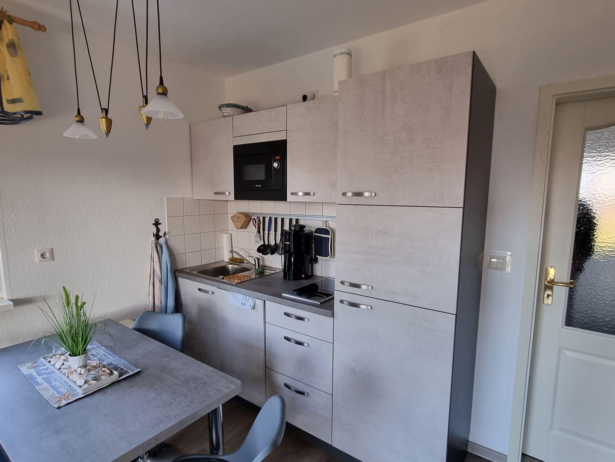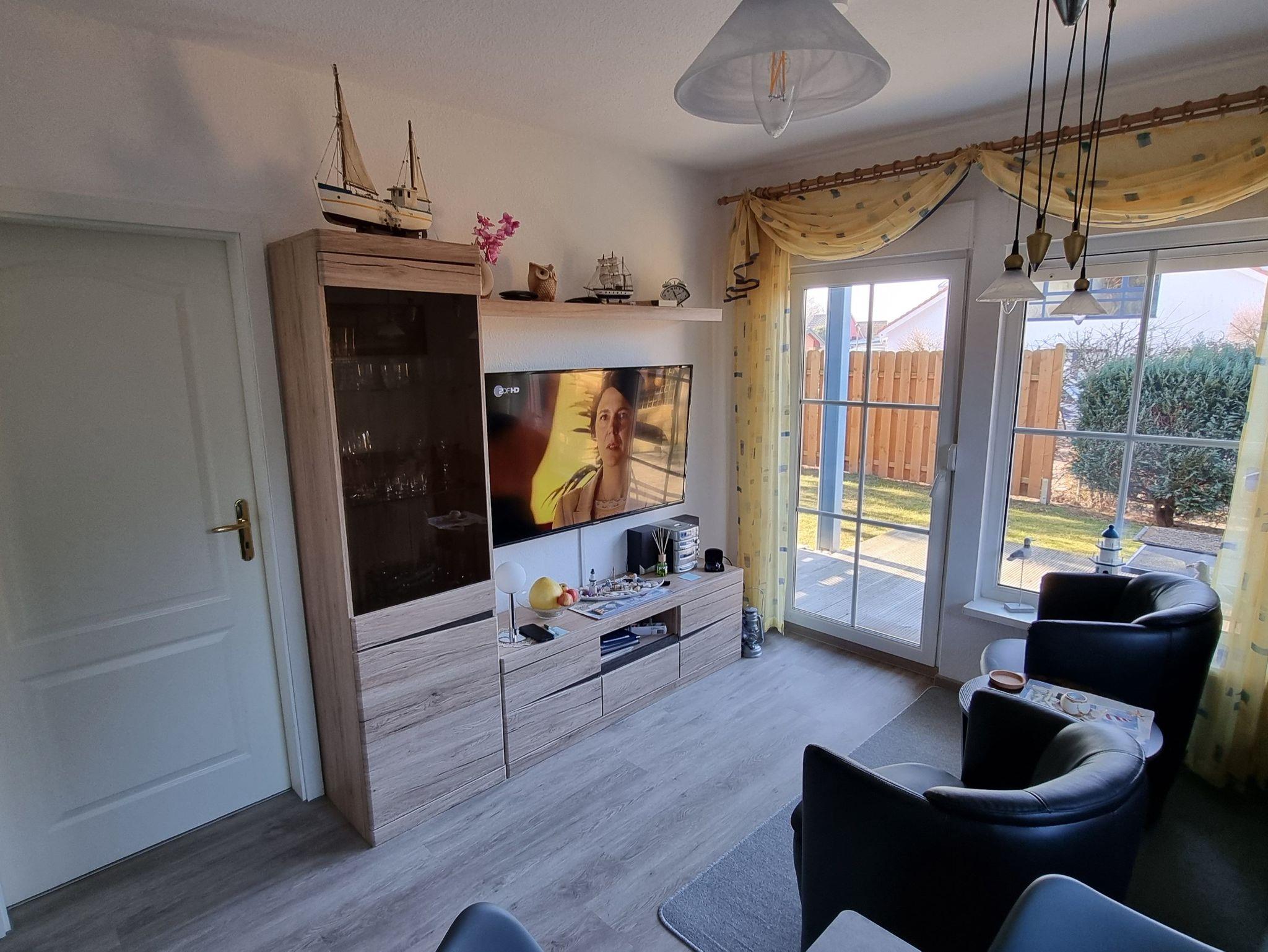 Schöne 3-Zimmer Ferienwohnung in einer freundlich angelegten Ferienanlage. Die Ferienwohnung ist im Wohnbereich ausgestattet mit einer gemütlichen Couch und einer offenen Küche mit Essbereich.