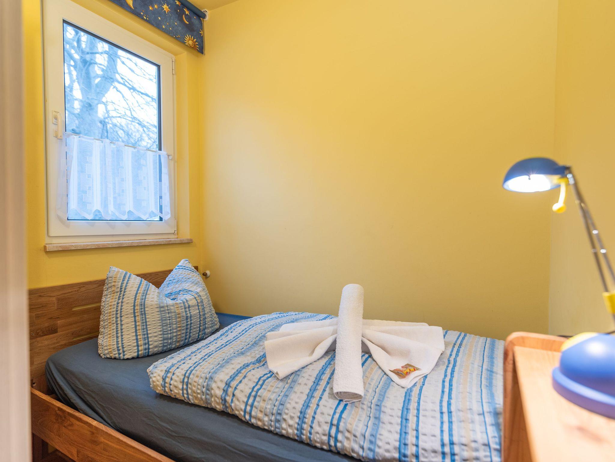 Die Wohnung verfügt über einen gemütlichen Wohn- und Essbereich, ausgestattet mit einem Fernseher. Das erste Schlafzimmer ist mit einem komfortablen Doppelbett und einem Schrank ausgestattet, während das zweite Schlafzimmer ein Einzelbett bereithält. Dies macht die Ferienwohnung ideal für Familien oder kleine Gruppen.