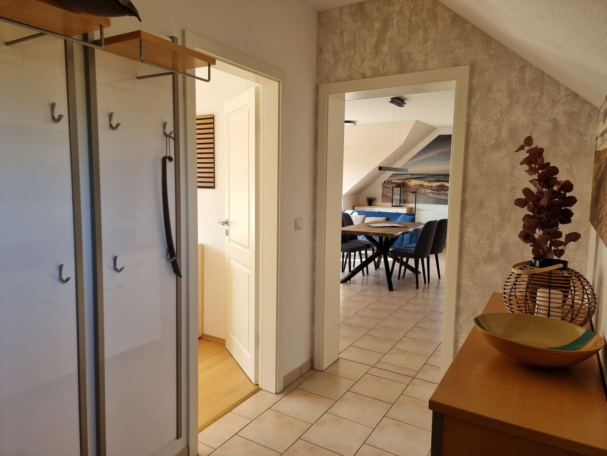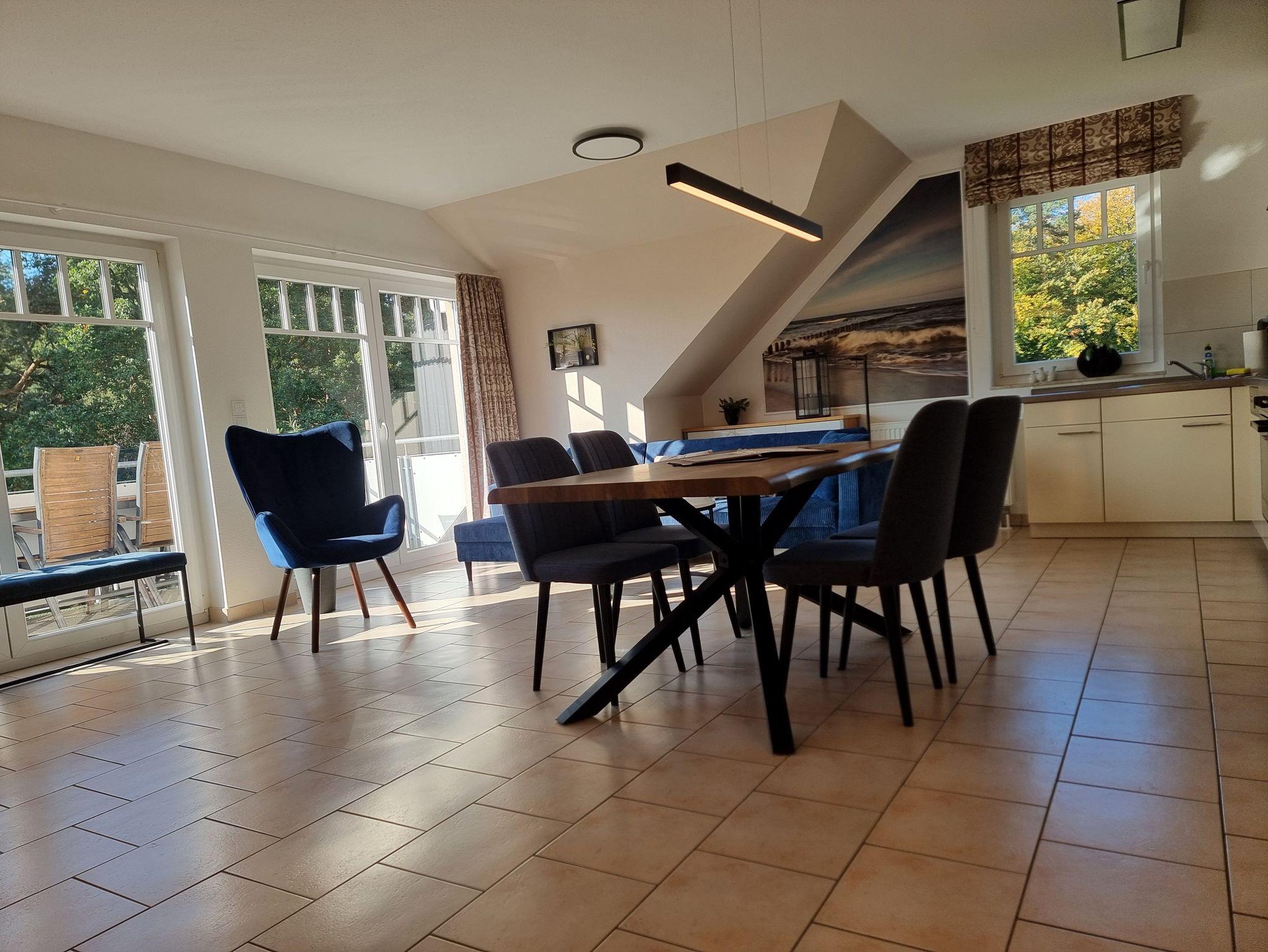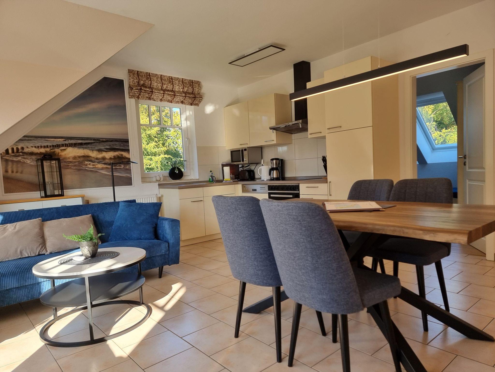 Die Ferienwohnung liegt im Dachgeschoß des Ferienhauses. Sie besteht aus Wohnzimmer, kompl. ausgestatteter Küche, Schlafzimmer und Tageslichtbad. Die Ausstattung der Einbauküche ist neuwertig funktional und qualitativ hochwertig unter anderem mit Toaster, Kaffeemaschine, Backofen mit Heißluft, Kochfeld, Geschirrspüler, Gefrierfach. Großer Südbalkon mit Blick auf den Küstenwald, große Spielwiese.